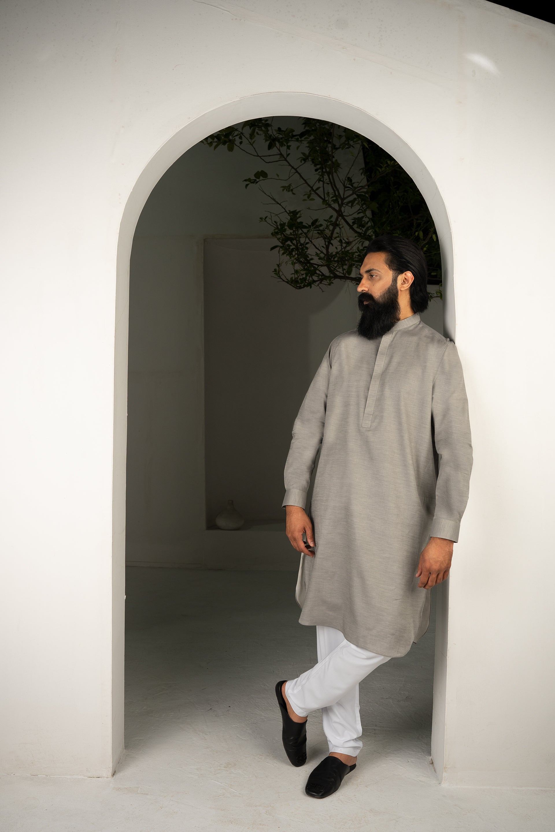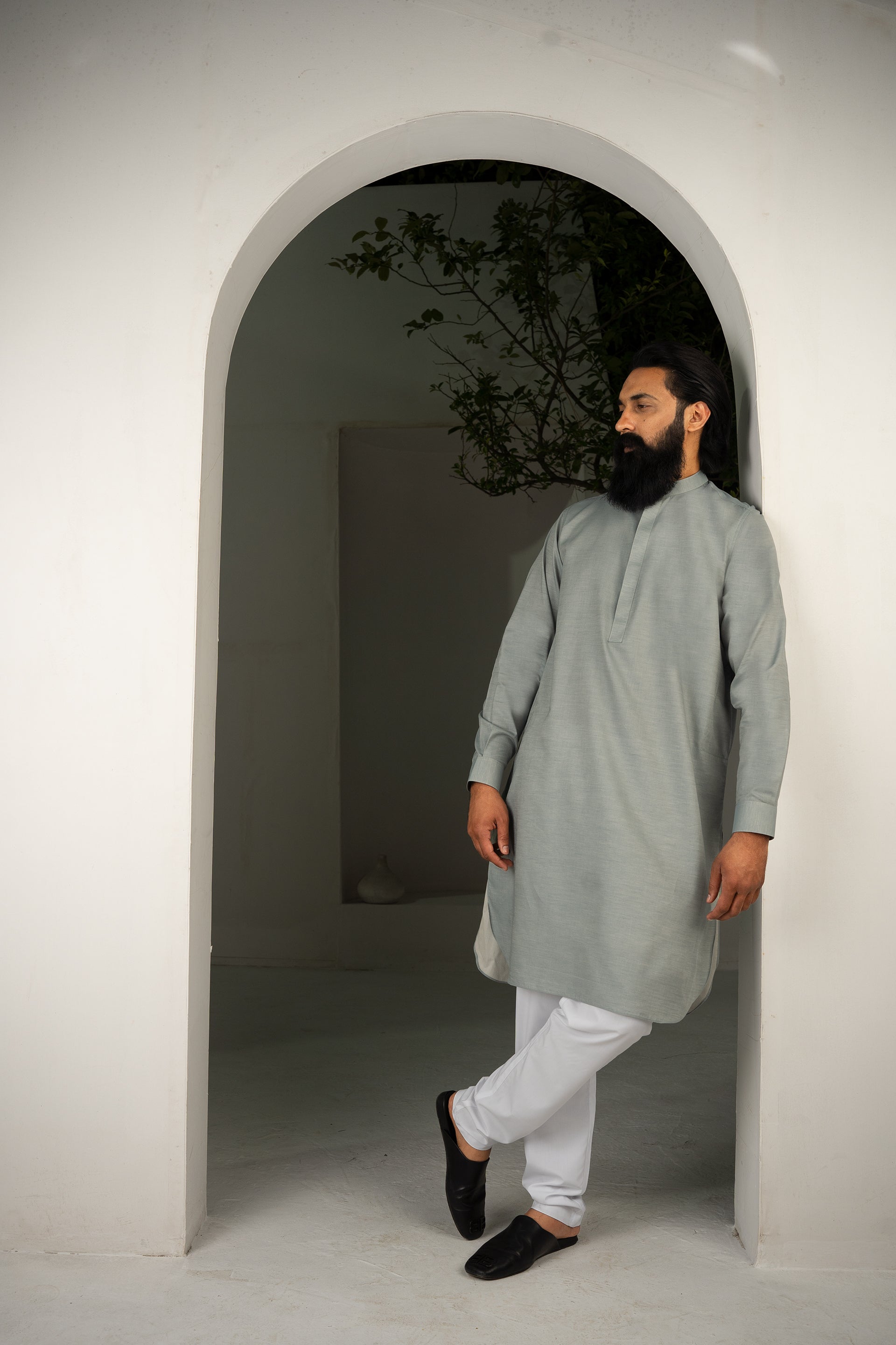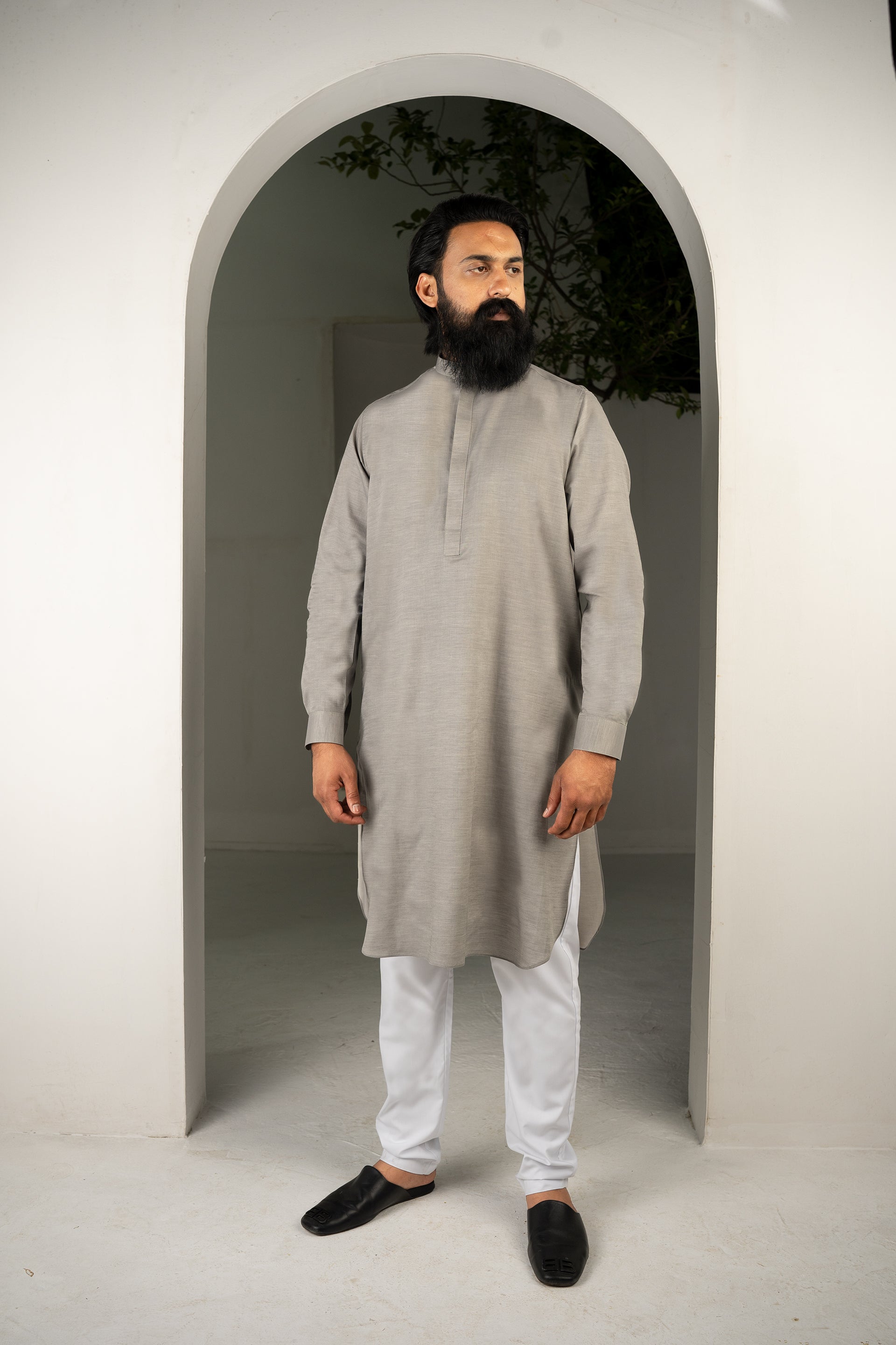 A refined 2-piece kameez ensemble paired with classic white trousers, featuring a hidden button placket that blends modern convenience with timeless traditional charm.