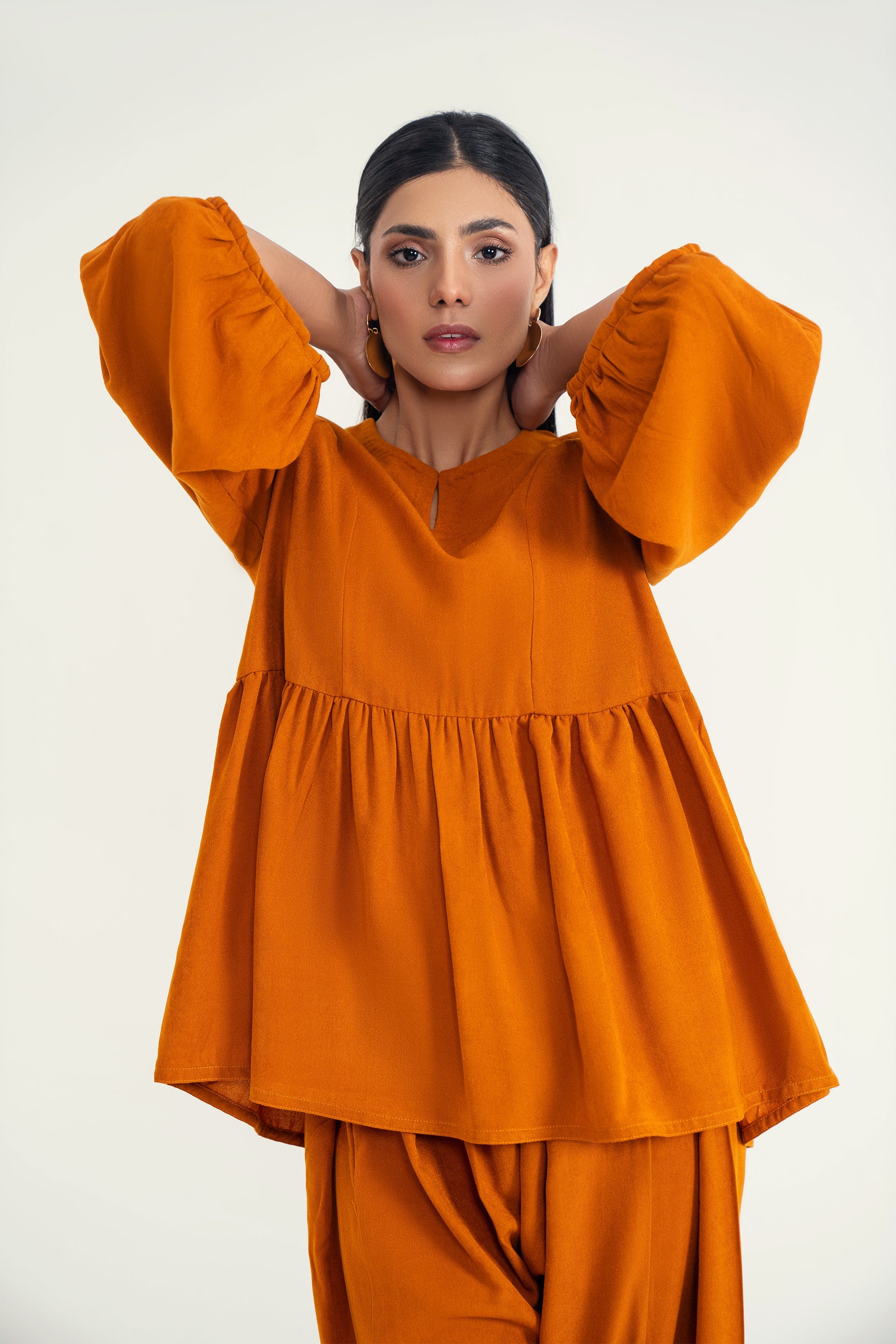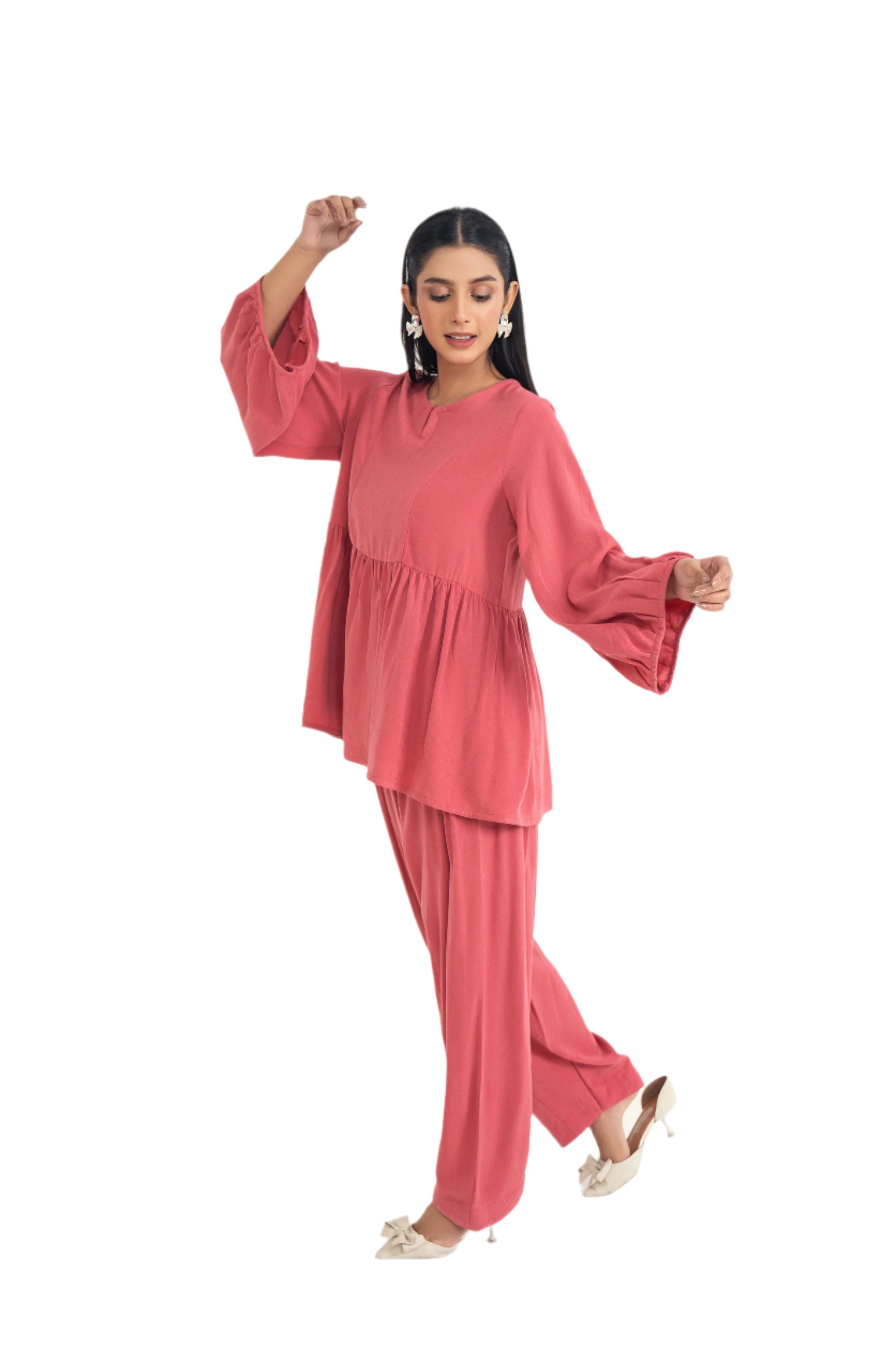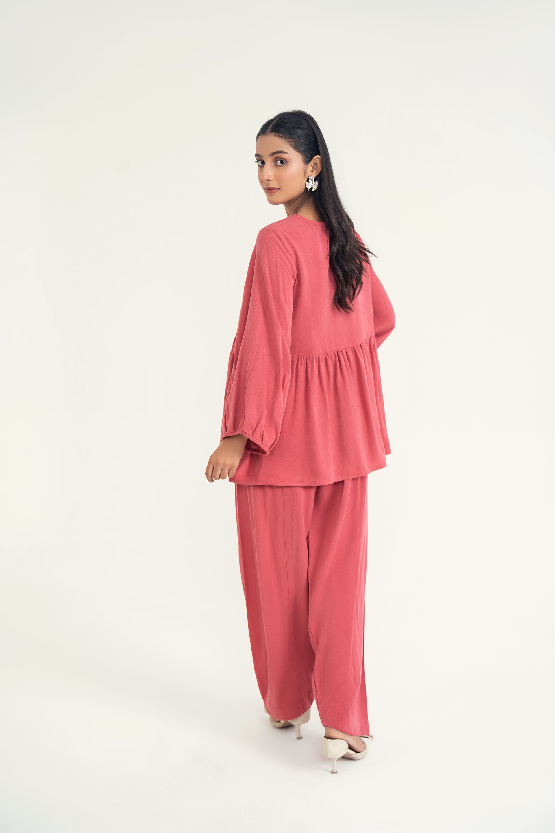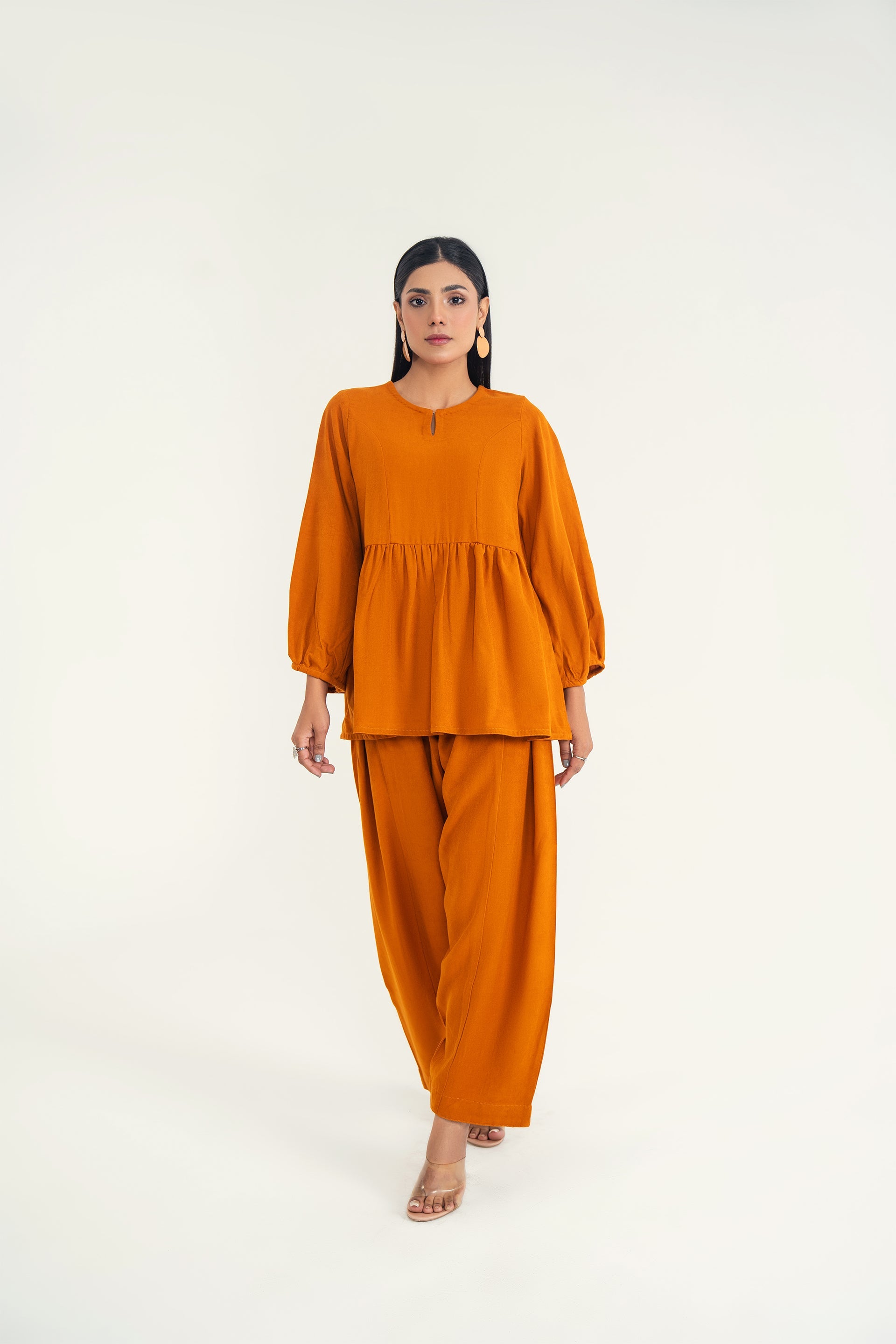 A winter-ready ensemble Bella features in heavy peach finish fabric, featuring a short, flowy silhouette with front gathers, princess panels, and a classic shalwar for a timeless blend of tradition and modern elegance.