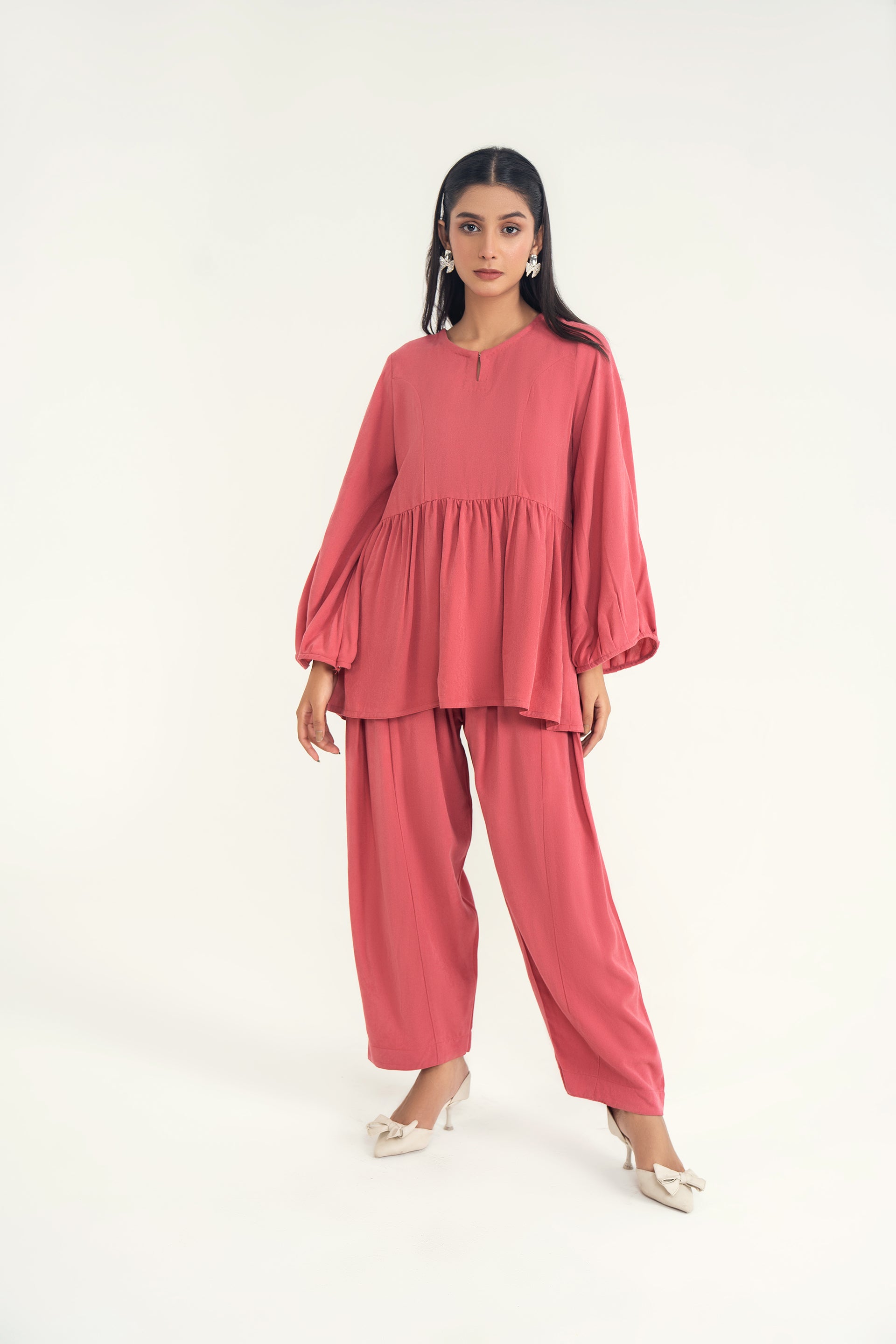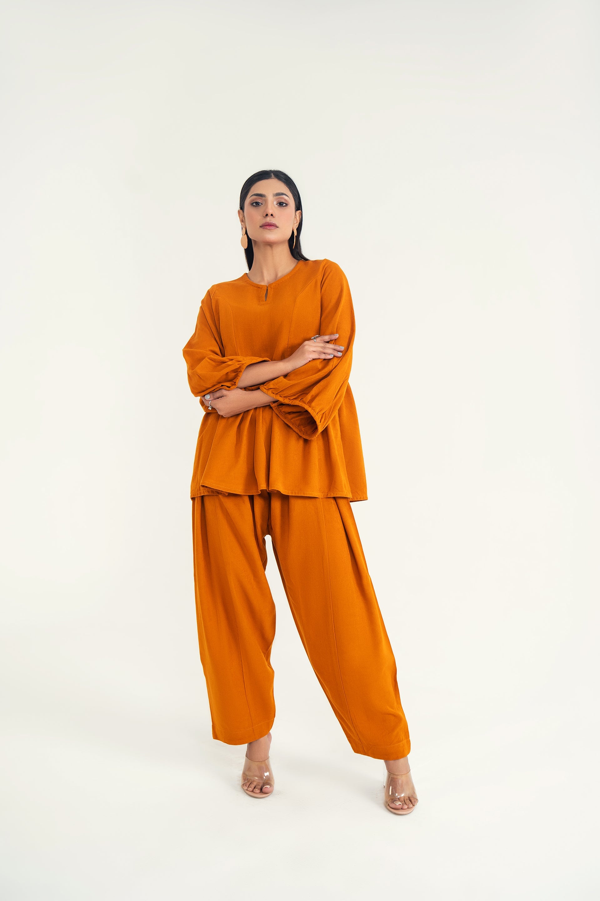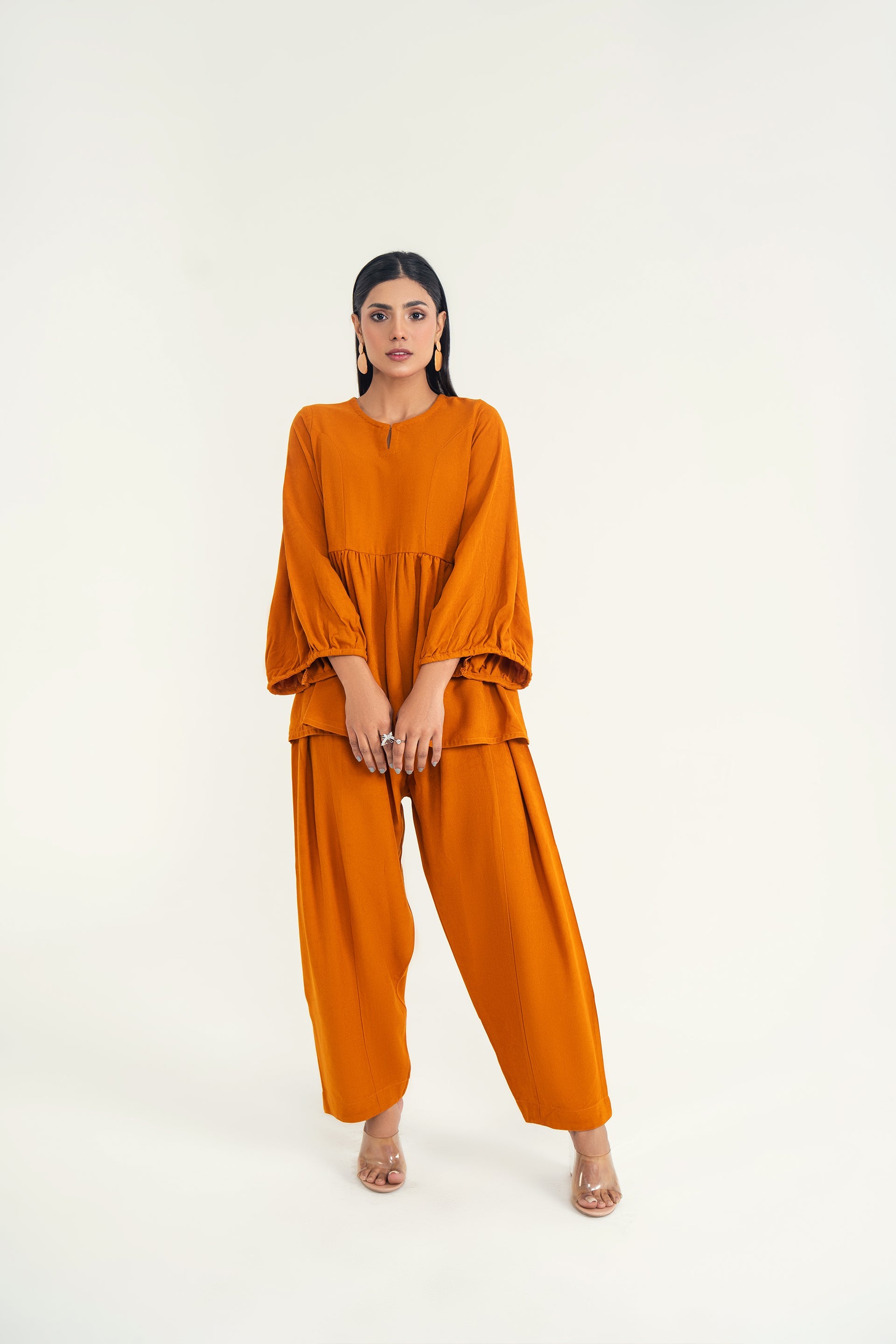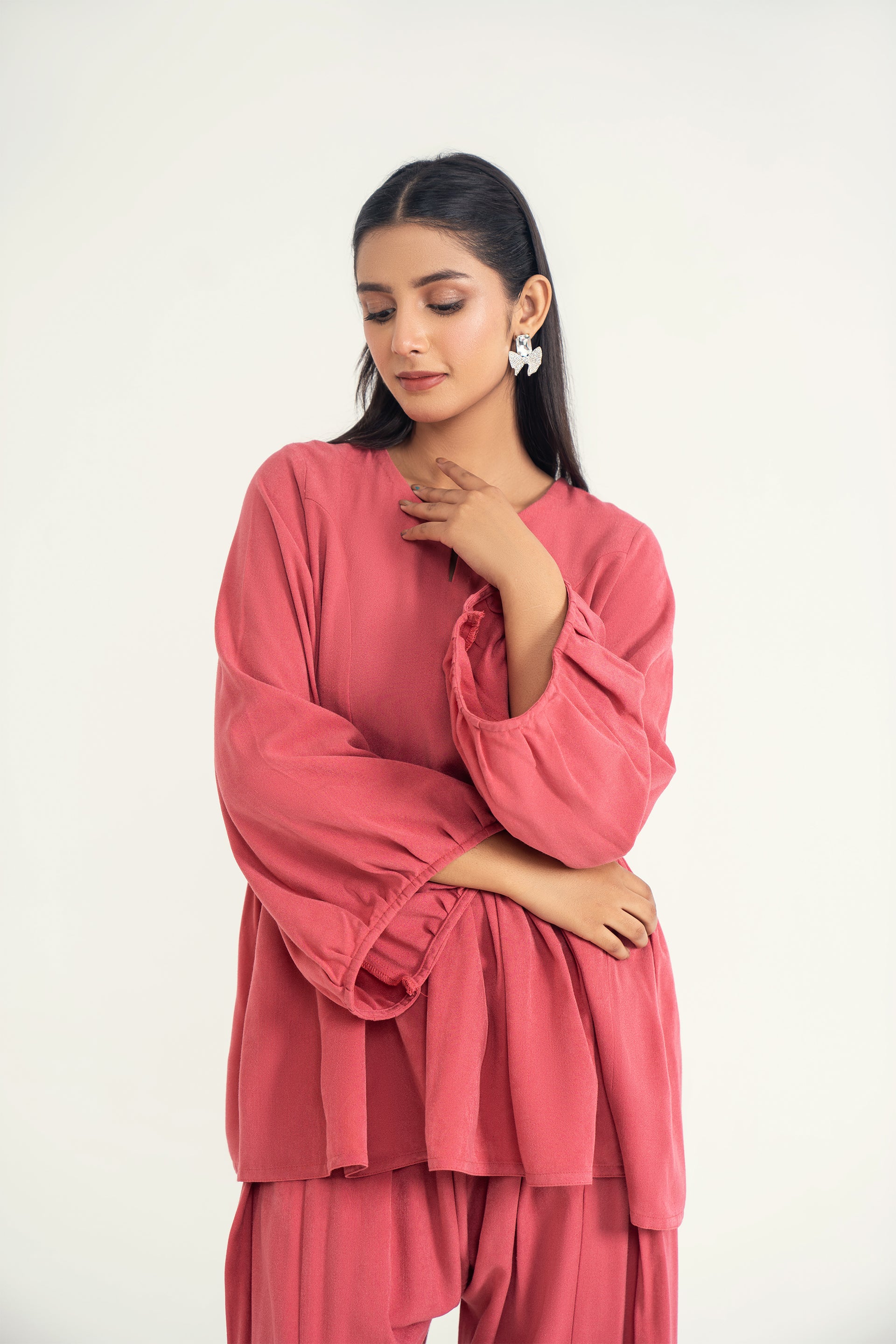 A winter-ready ensemble Bella features in heavy peach finish fabric, featuring a short, flowy silhouette with front gathers, princess panels, and a classic shalwar for a timeless blend of tradition and modern elegance.