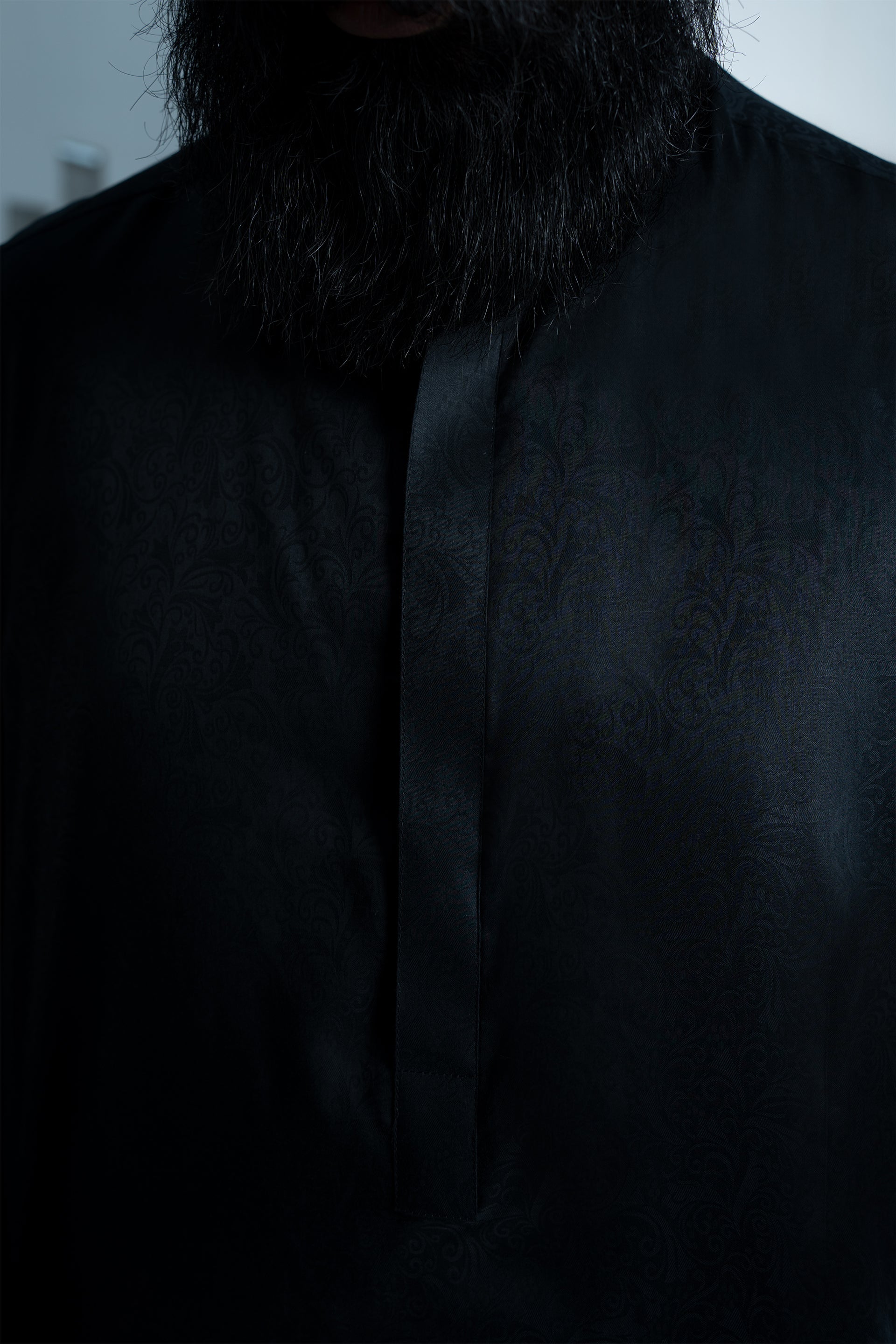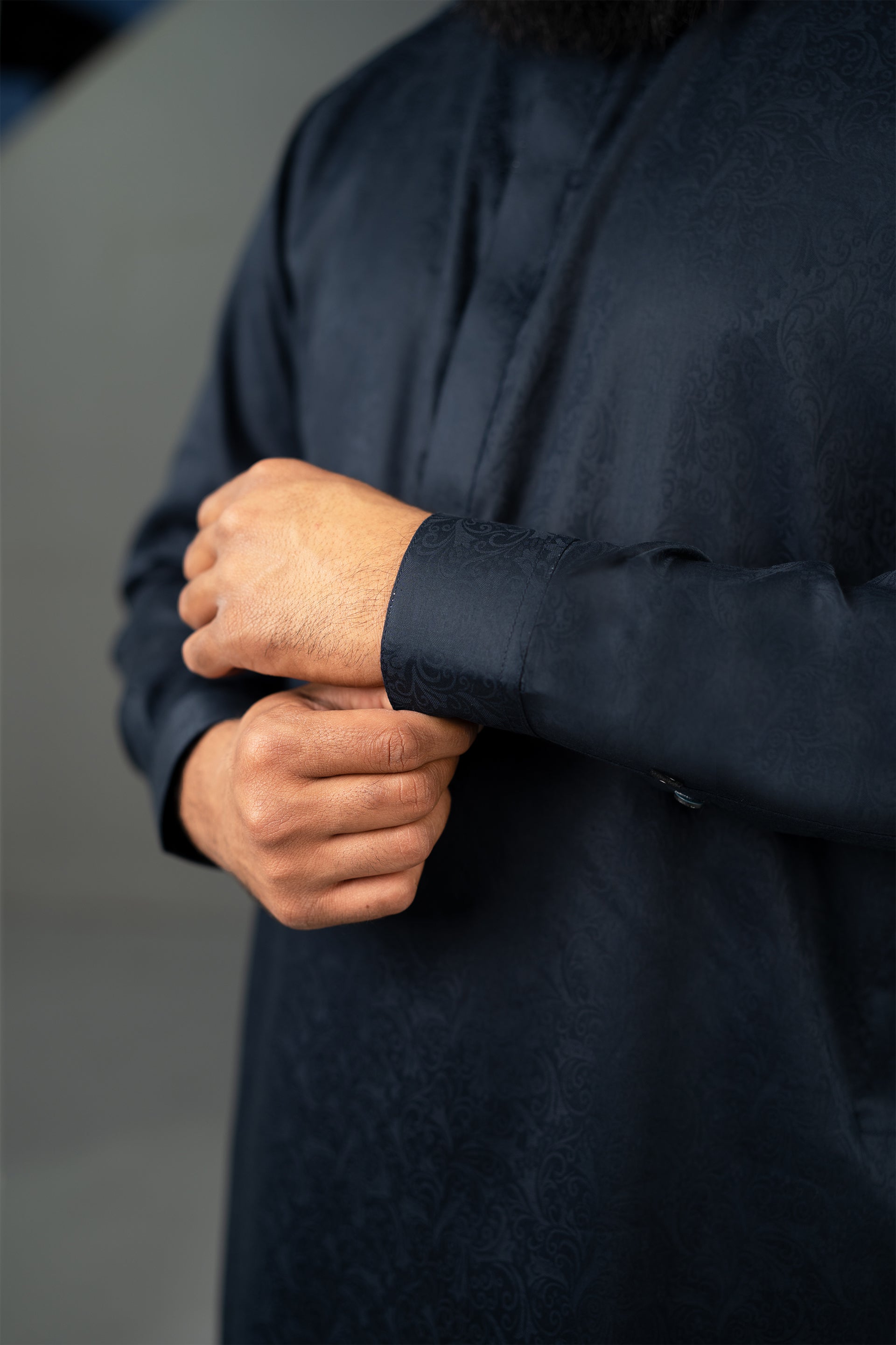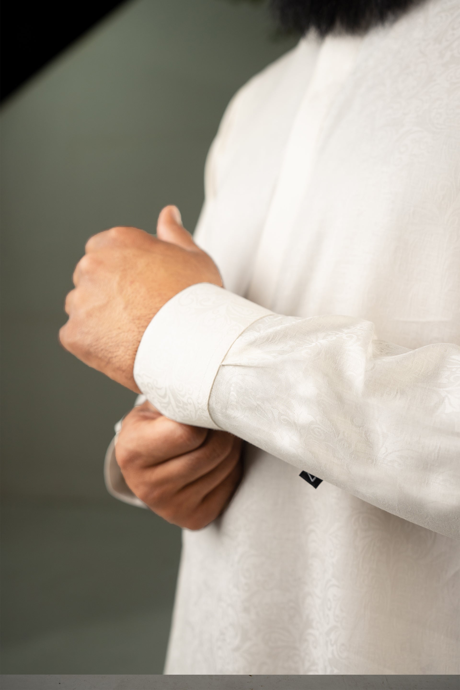 A meticulously crafted 2-piece Kurta Trouser set with self-prints fabric, matching trousers, and a hidden button placket, offering a sleek, refined, and sophisticated look for any occasion.