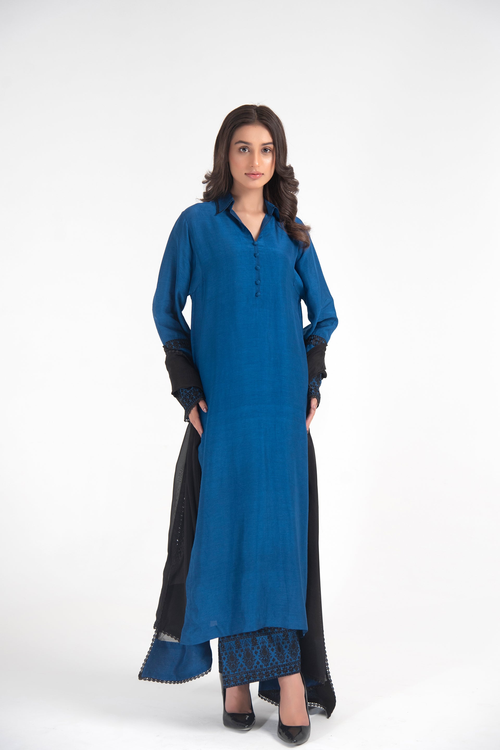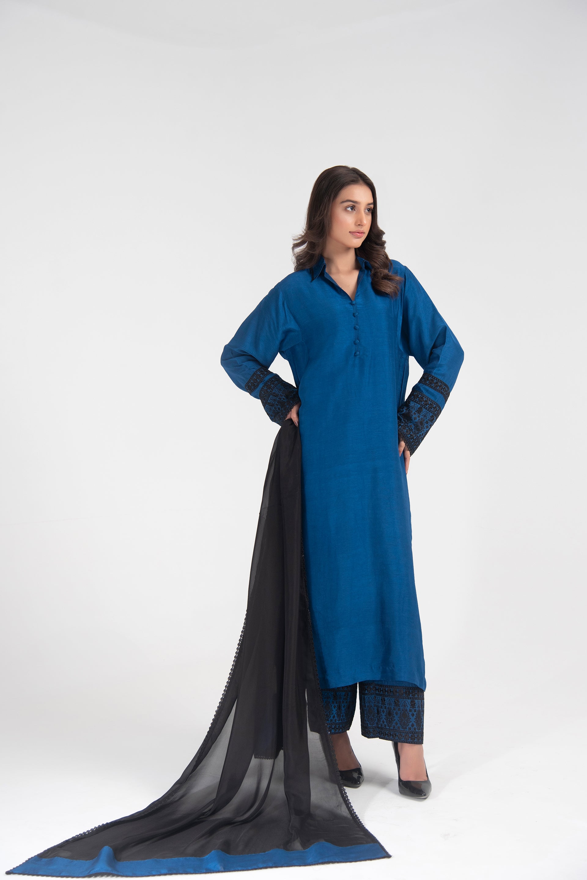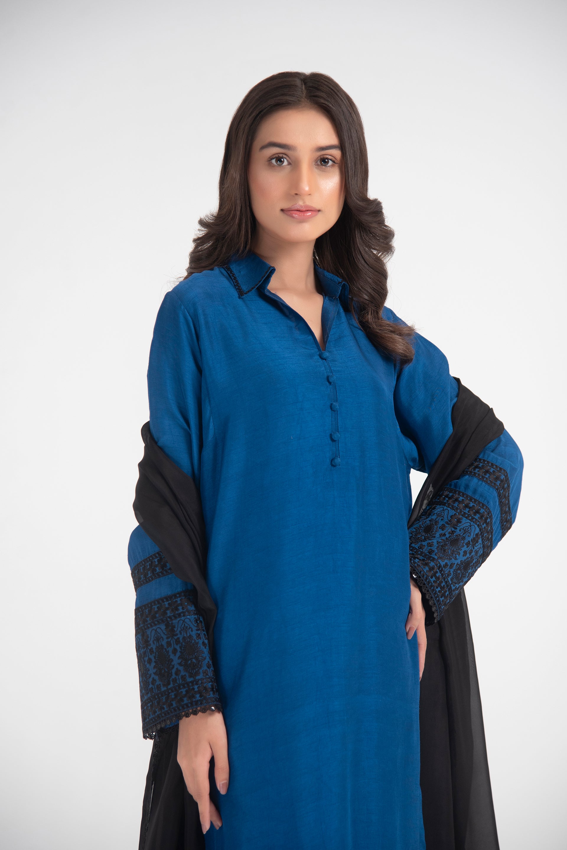 Long embroidered shirt with hand-embroidered collar, dome buttons, and a flowing black silk dupatta.