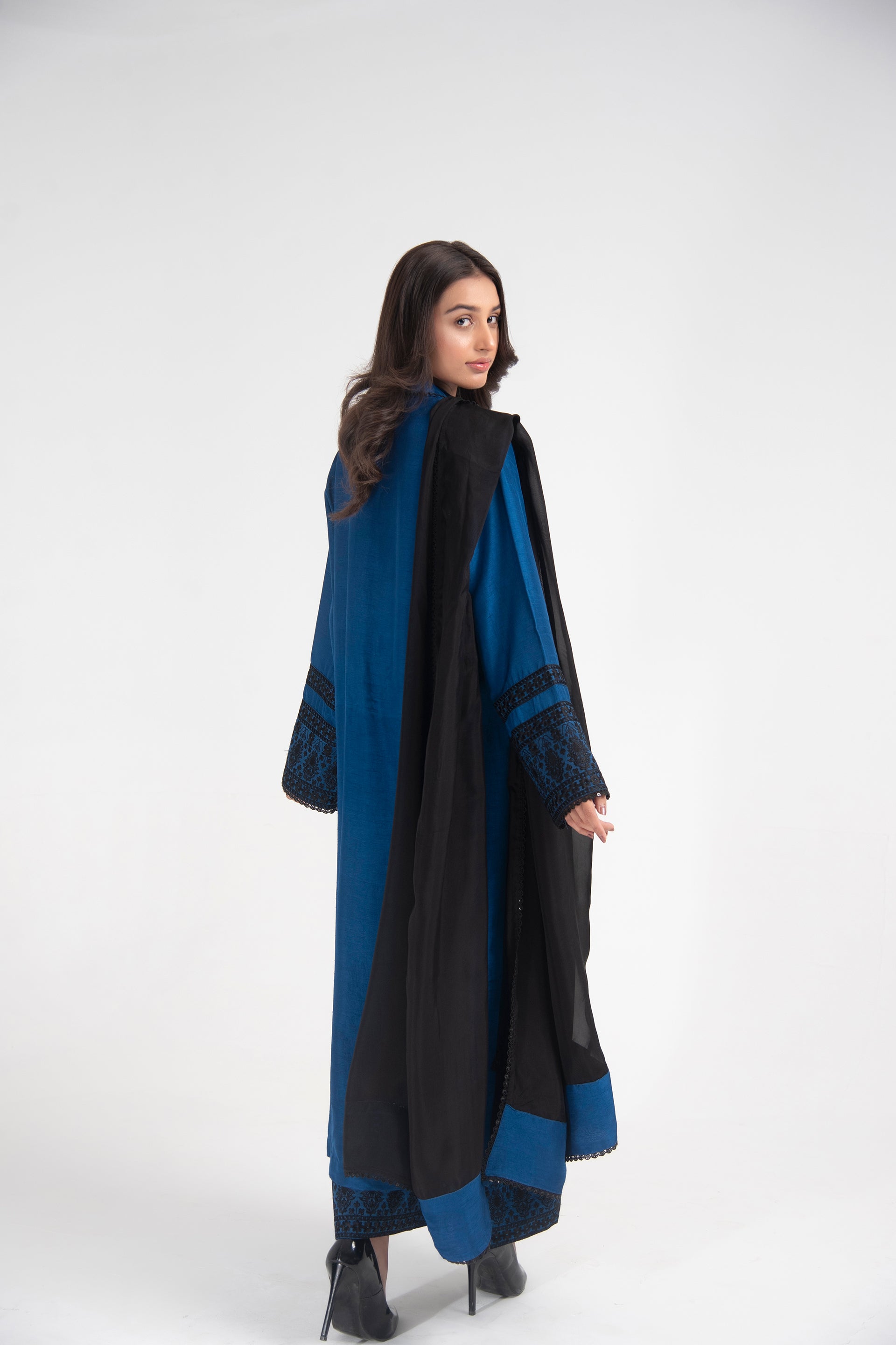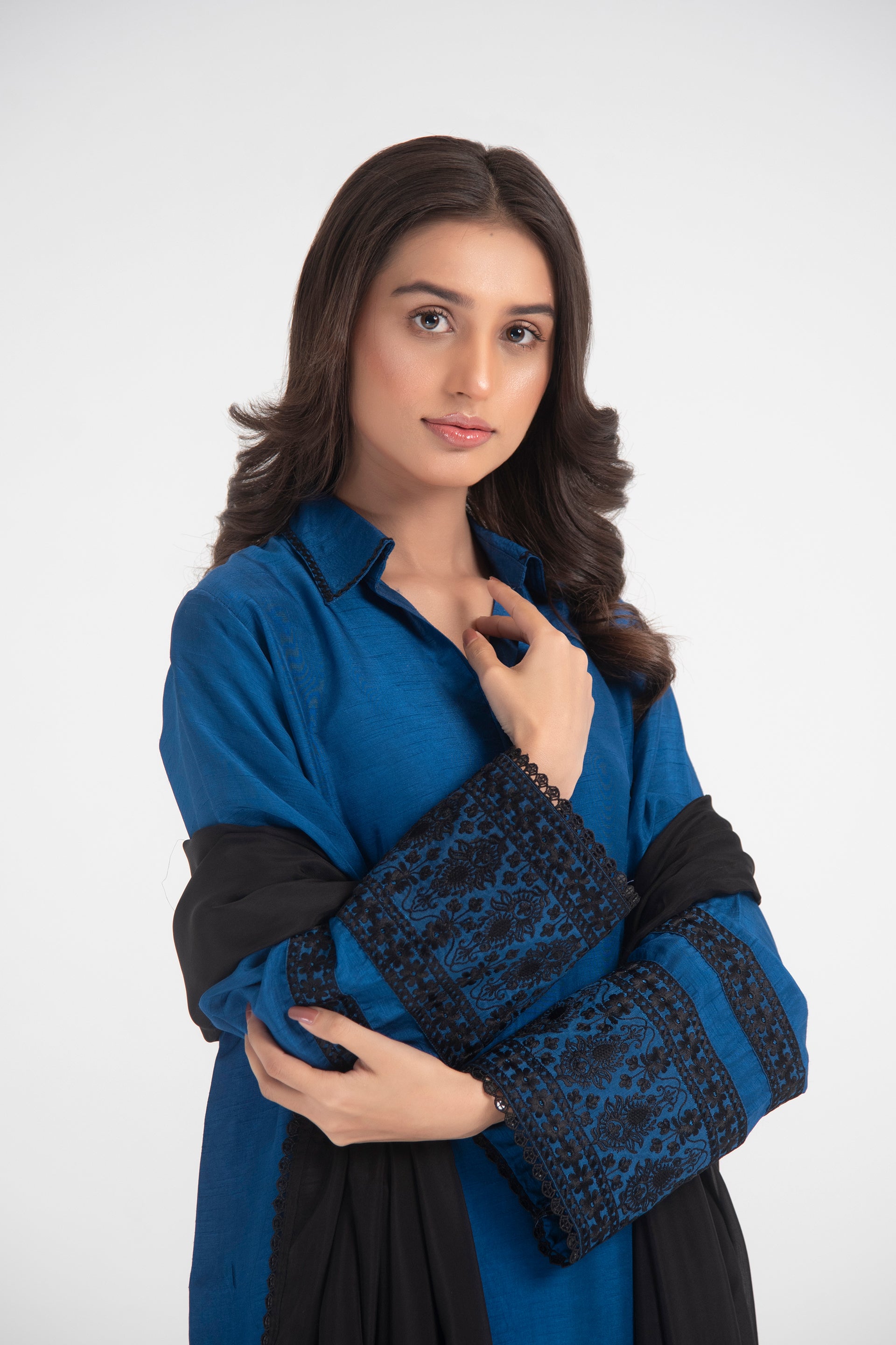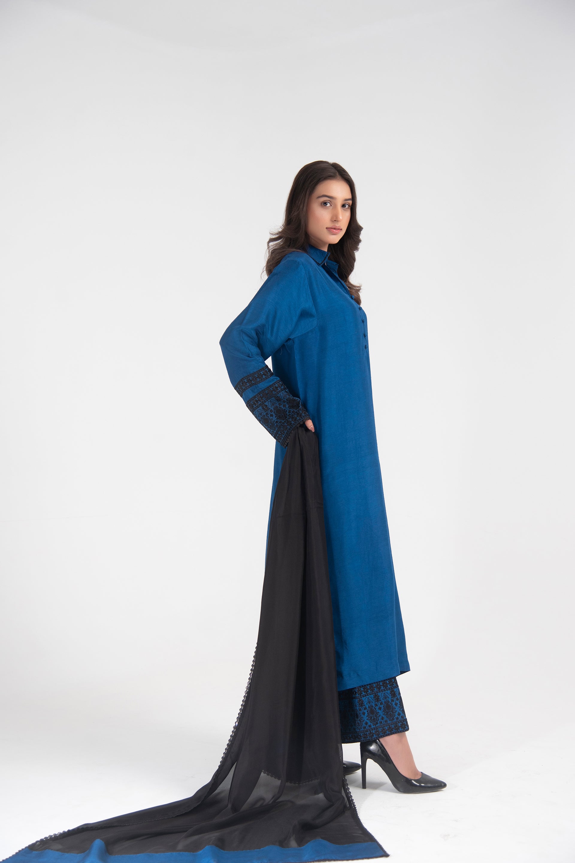 Long embroidered shirt with hand-embroidered collar, dome buttons, and a flowing black silk dupatta.
