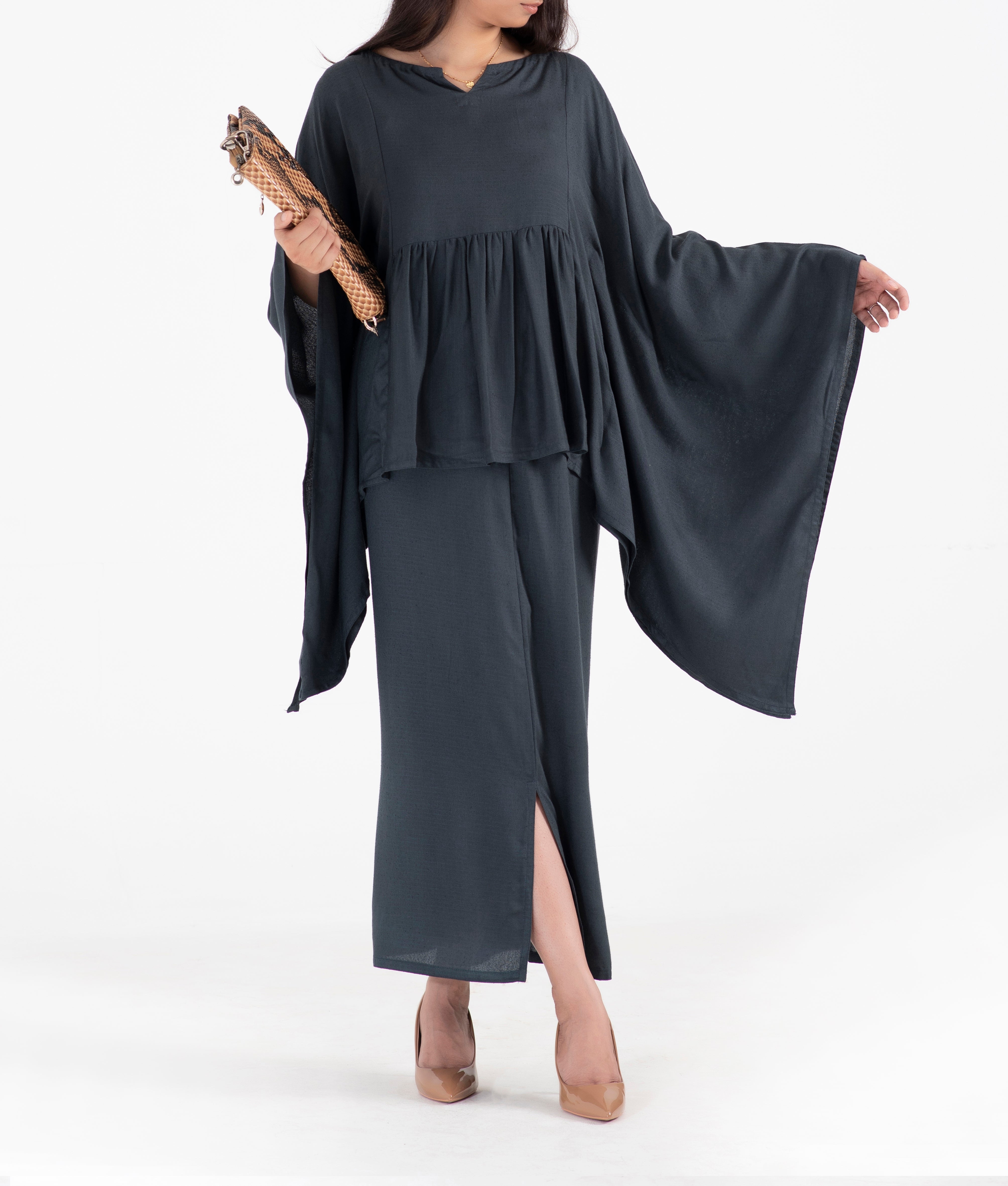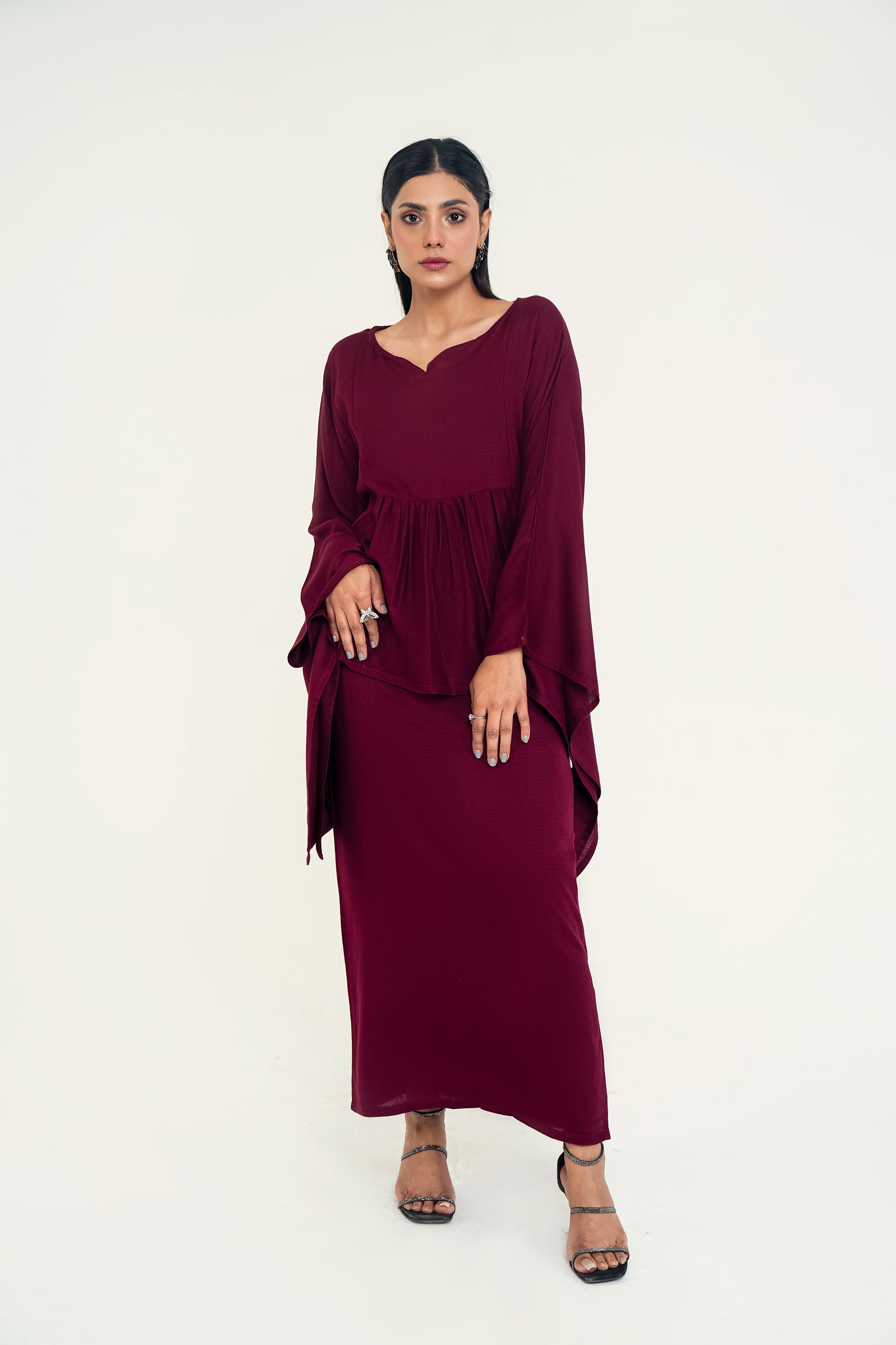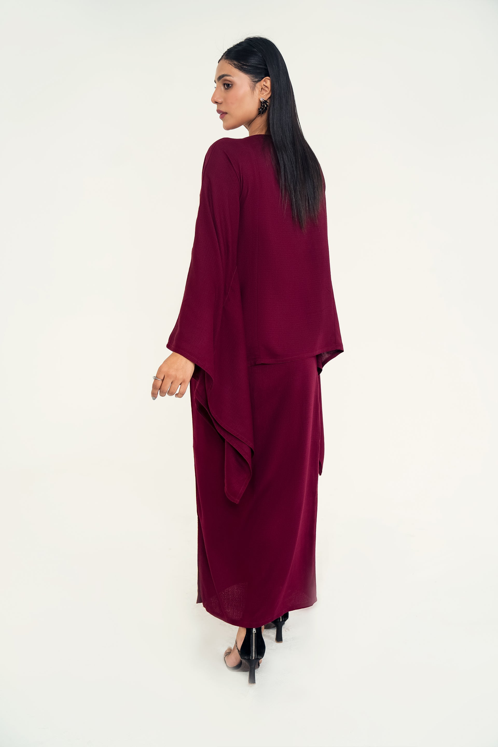 Description: Camille is a silk karandi kaftan with batwing sleeves, a gathered front, and a sleek pencil skirt, featuring a draw cord belt and side slit for a modern, elegant look—perfect for day-to-night winter sophistication.