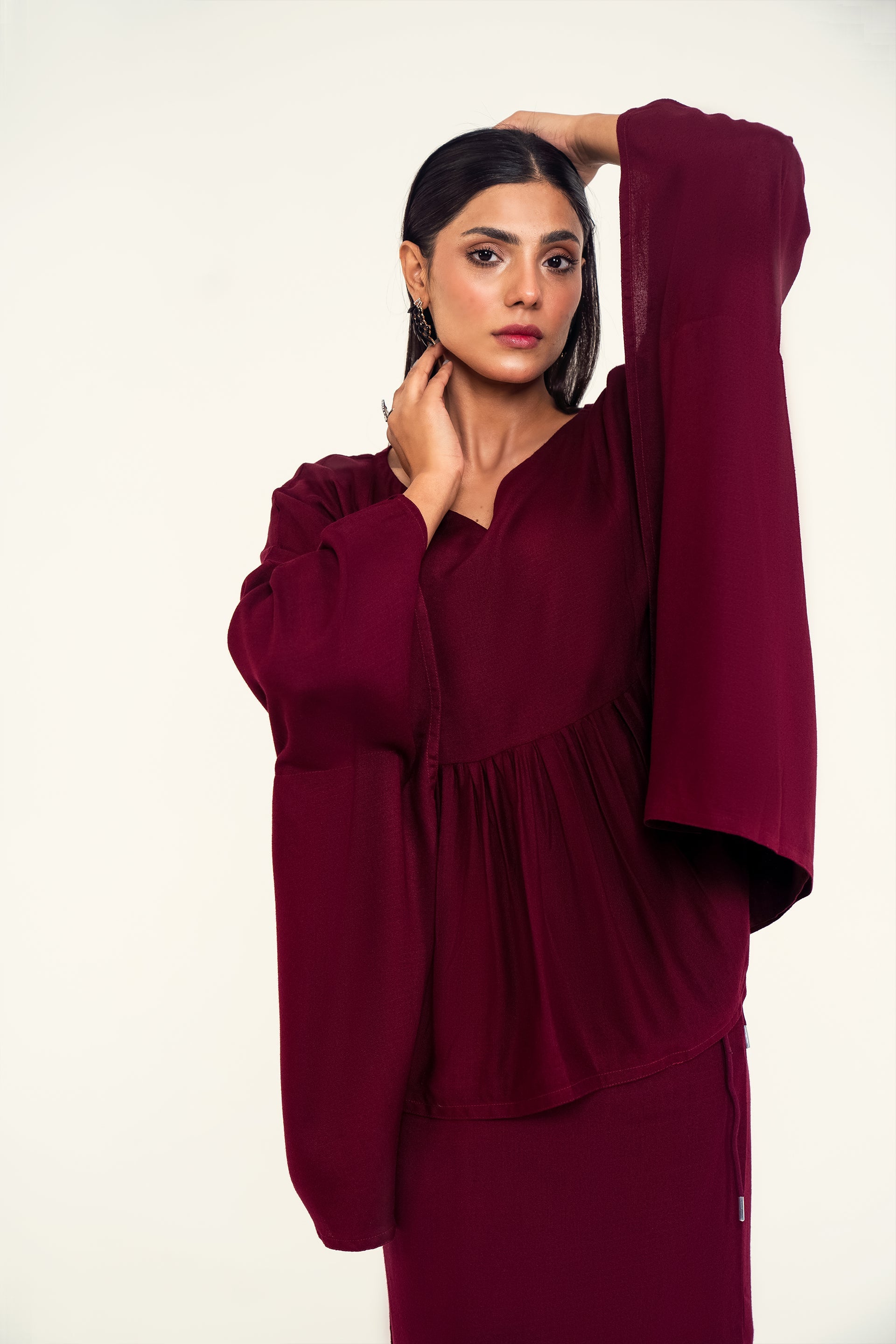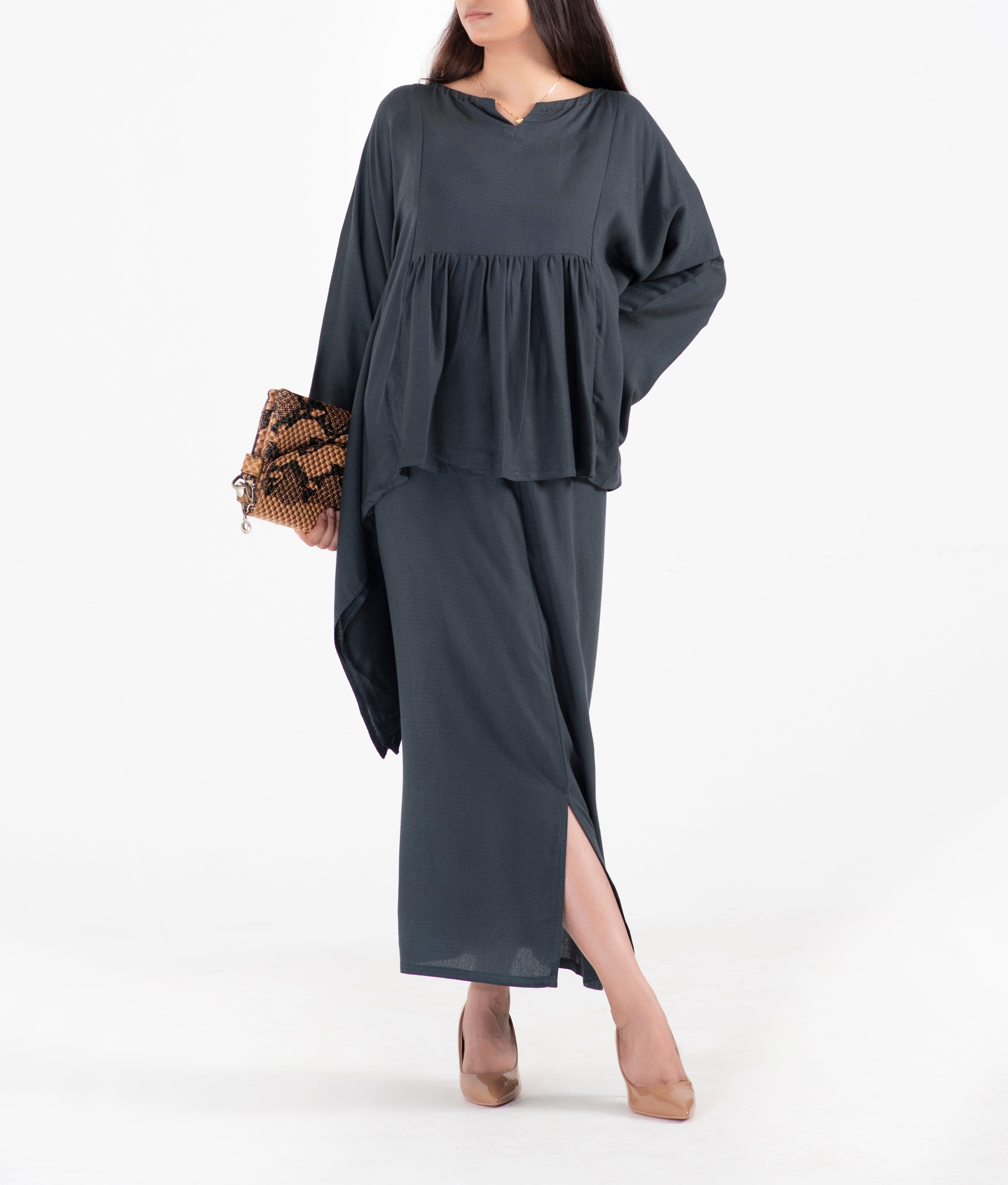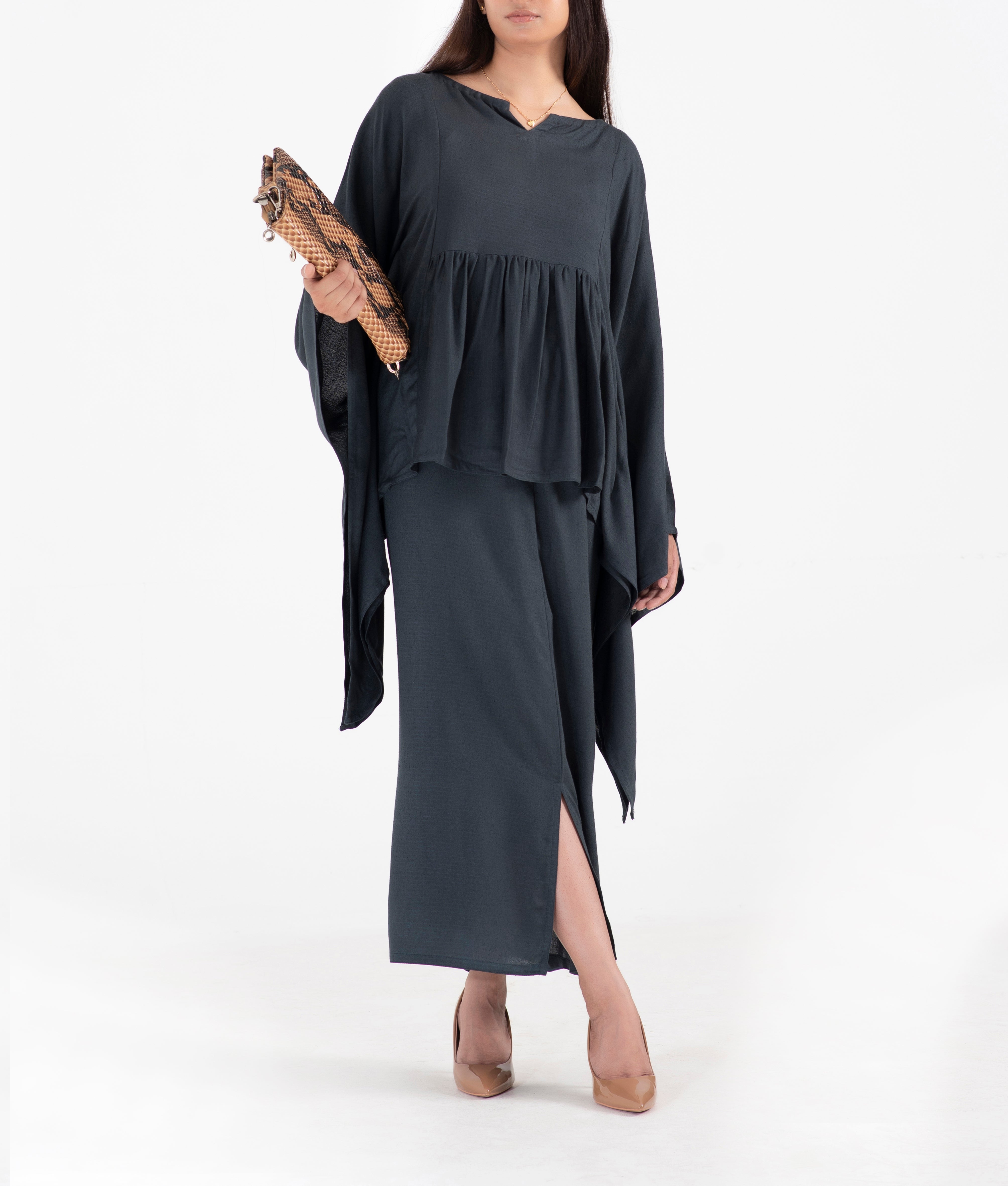 Description: Camille is a silk karandi kaftan with batwing sleeves, a gathered front, and a sleek pencil skirt, featuring a draw cord belt and side slit for a modern, elegant look—perfect for day-to-night winter sophistication.