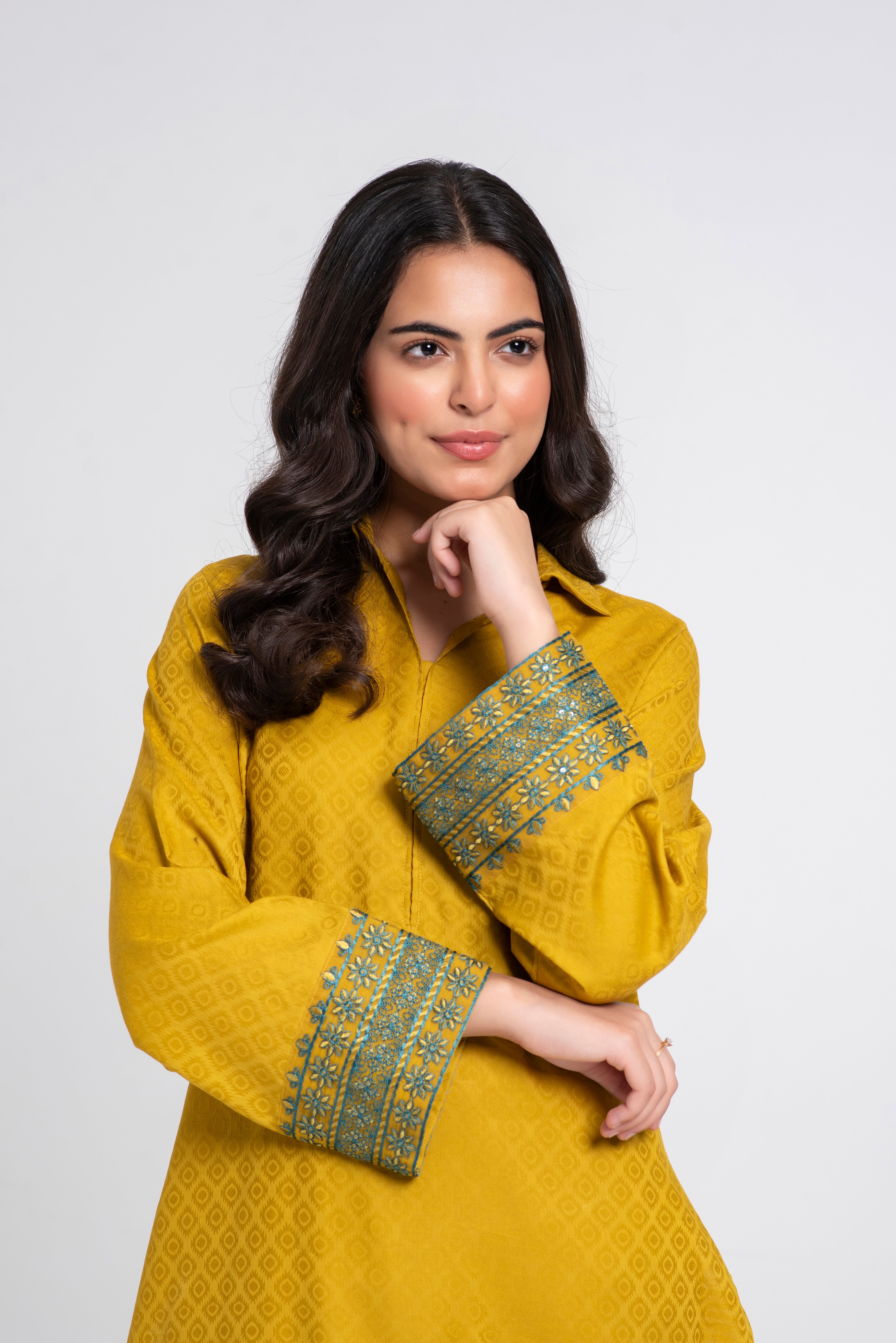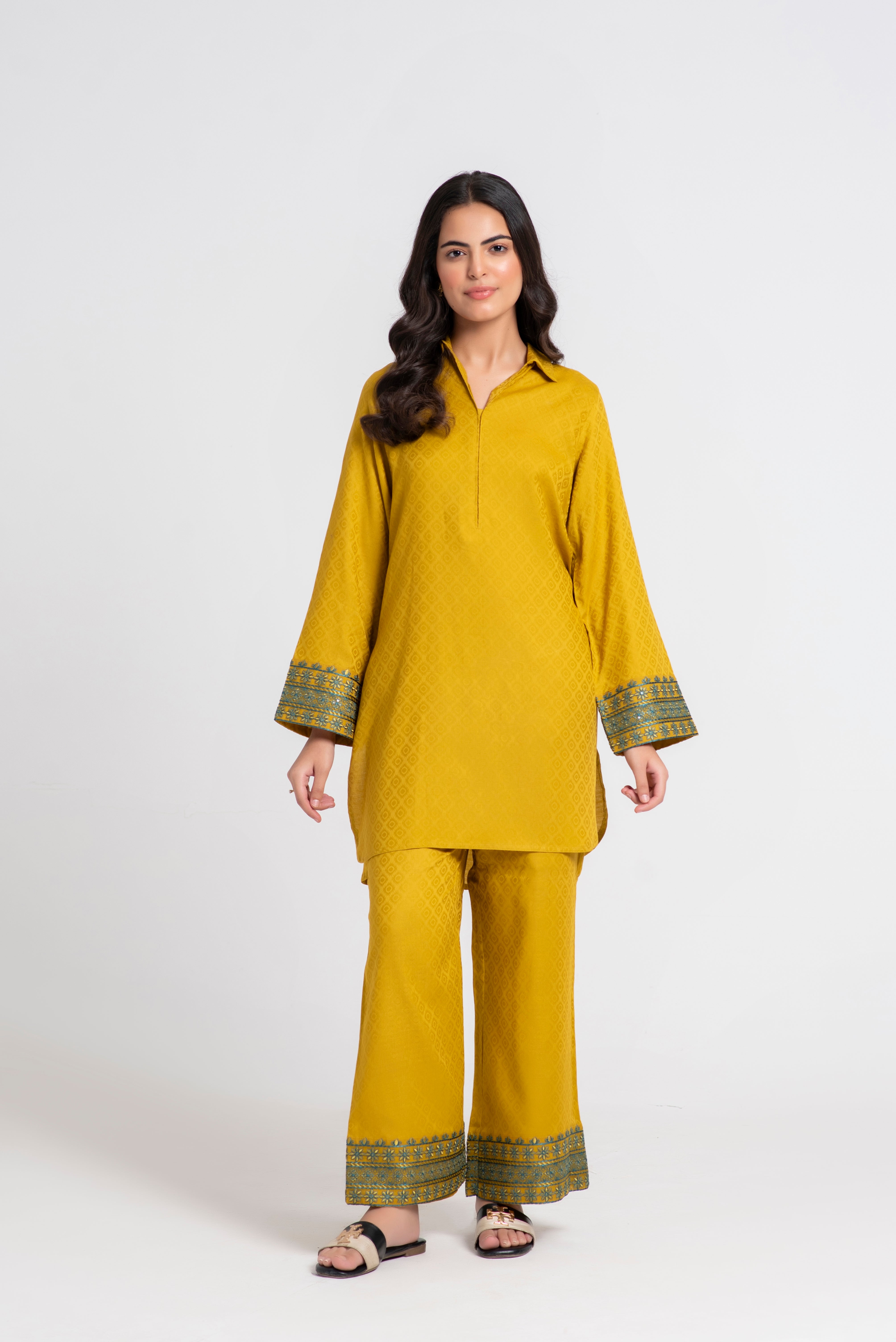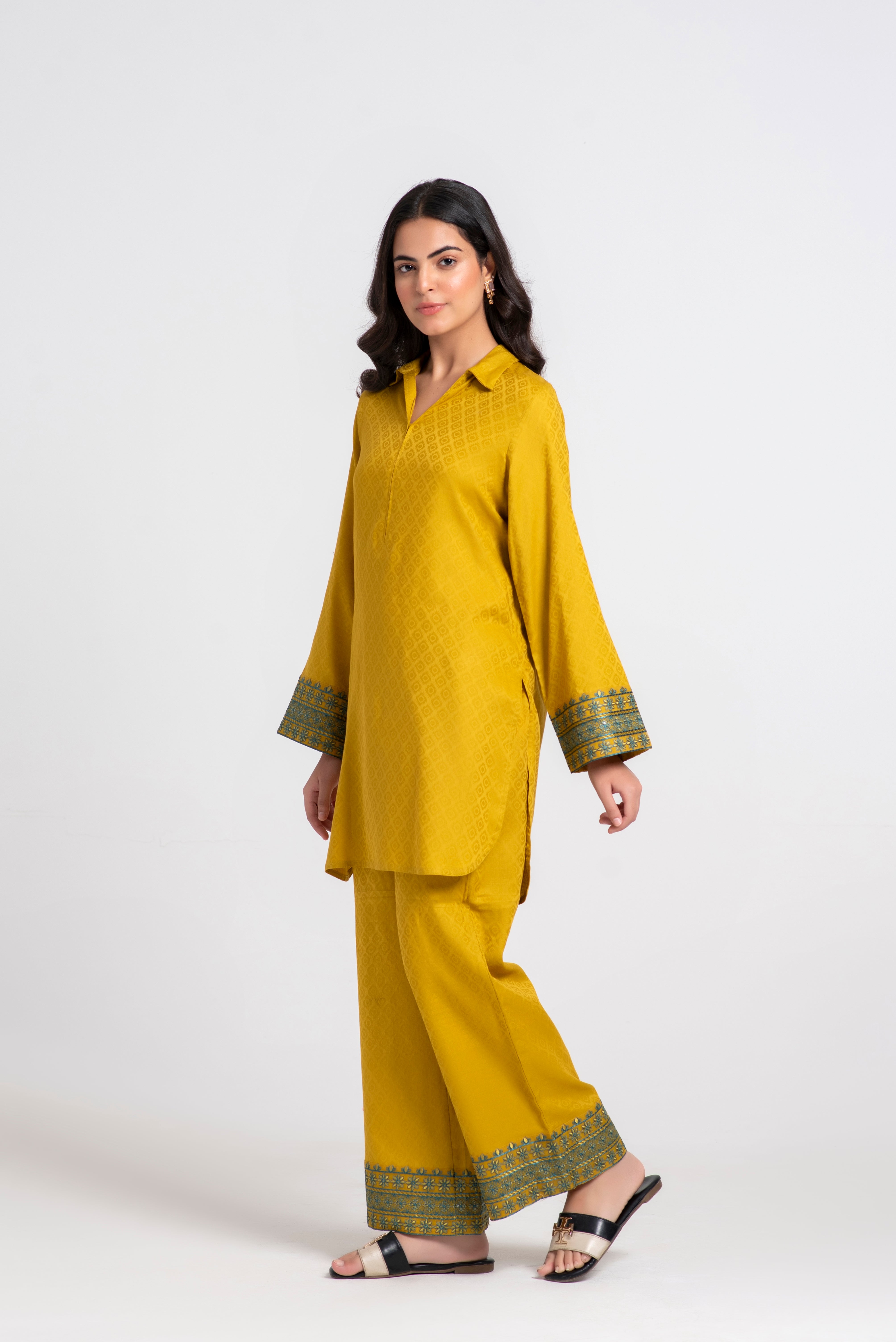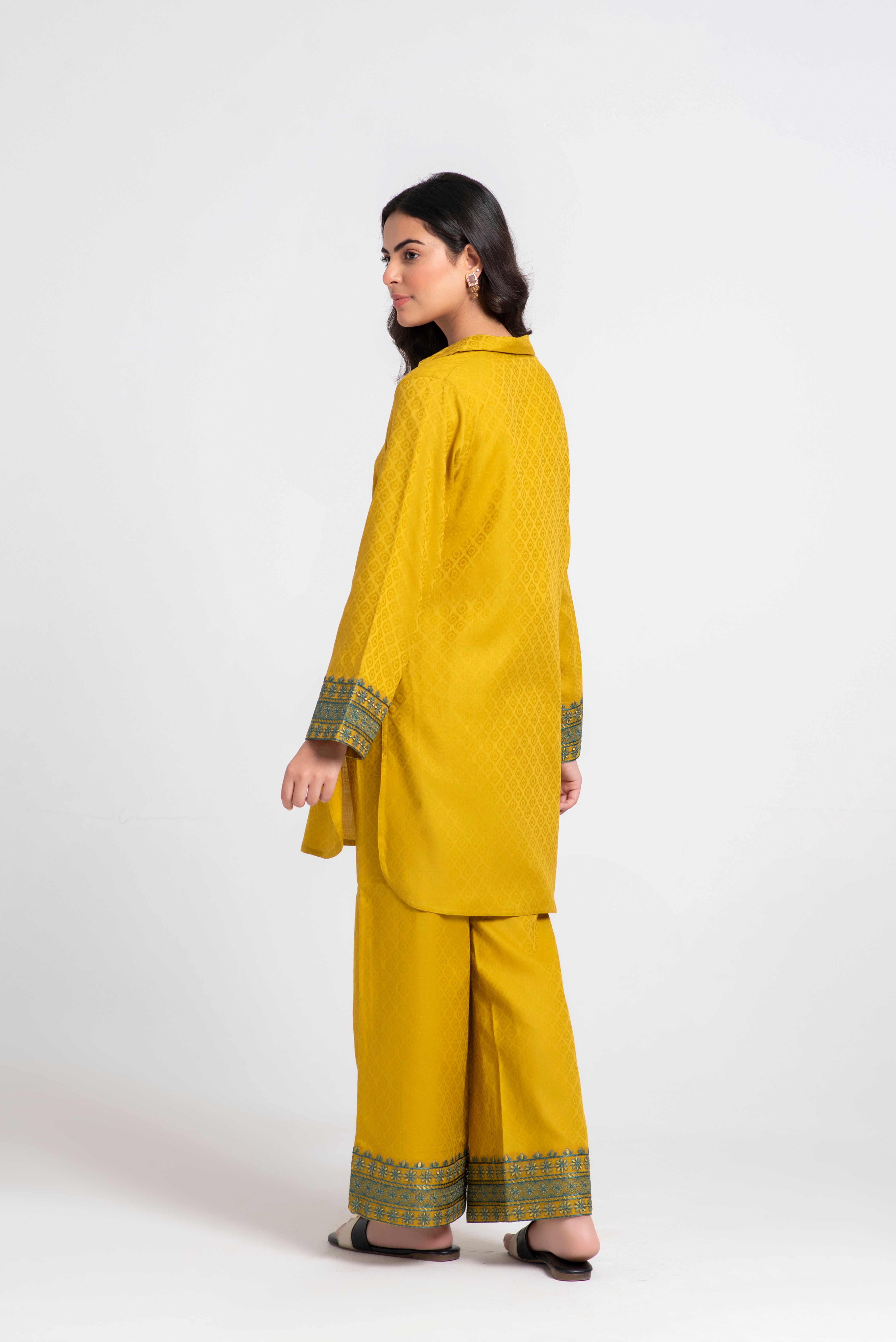 This elegant Mustard ensemble features a structured collar with decorative hand stitches, cording detail on the front, organza sleeve patches on shirt and trouser, and a neatly finished hem with double-edge stitching.