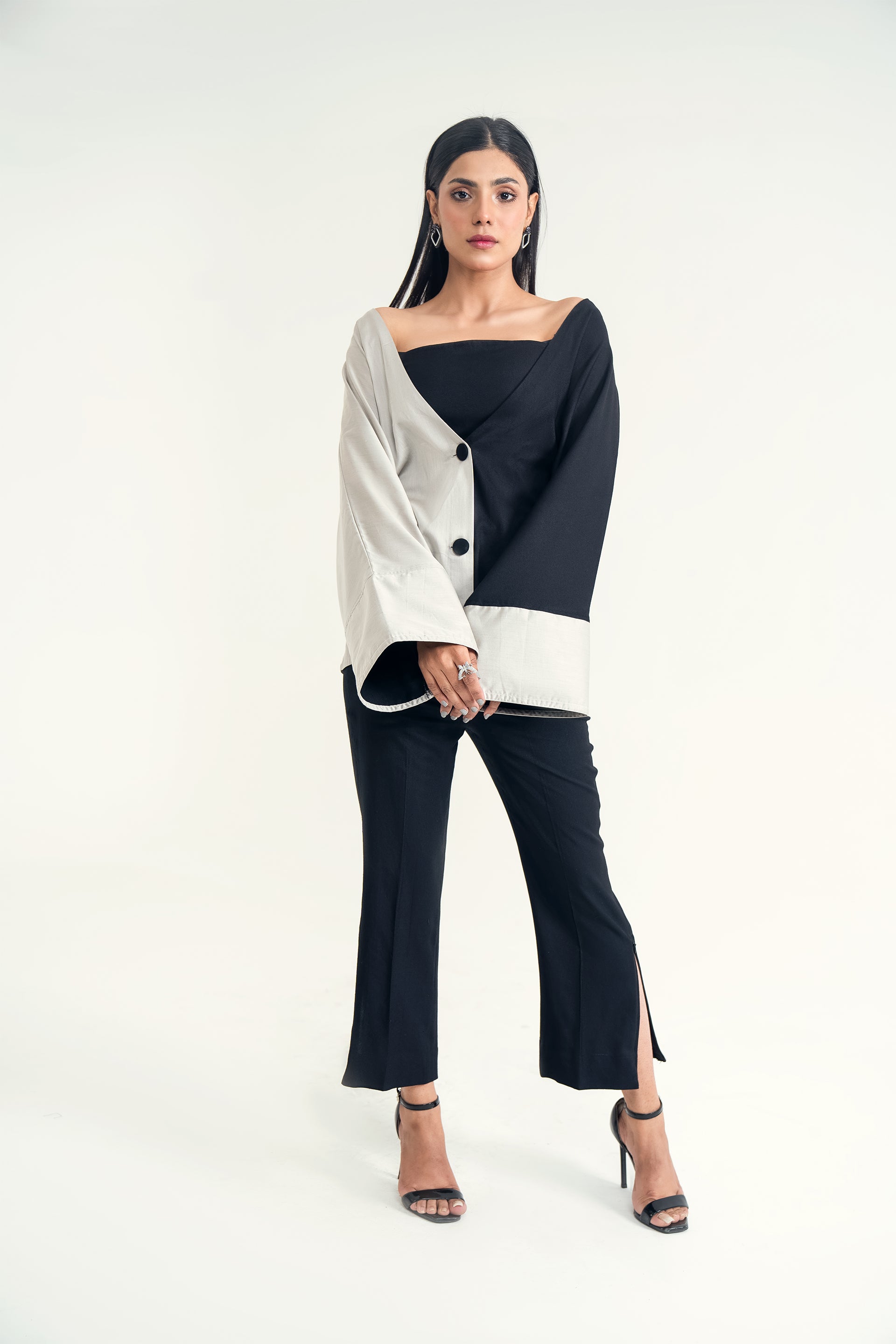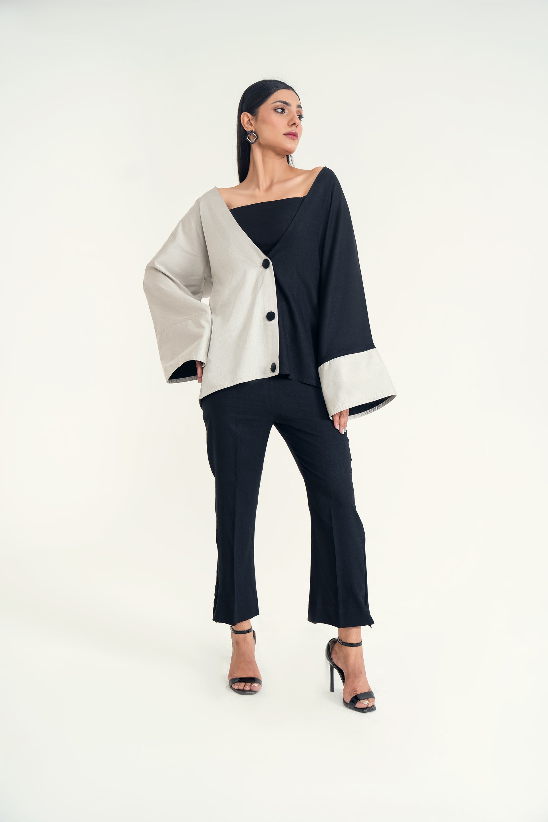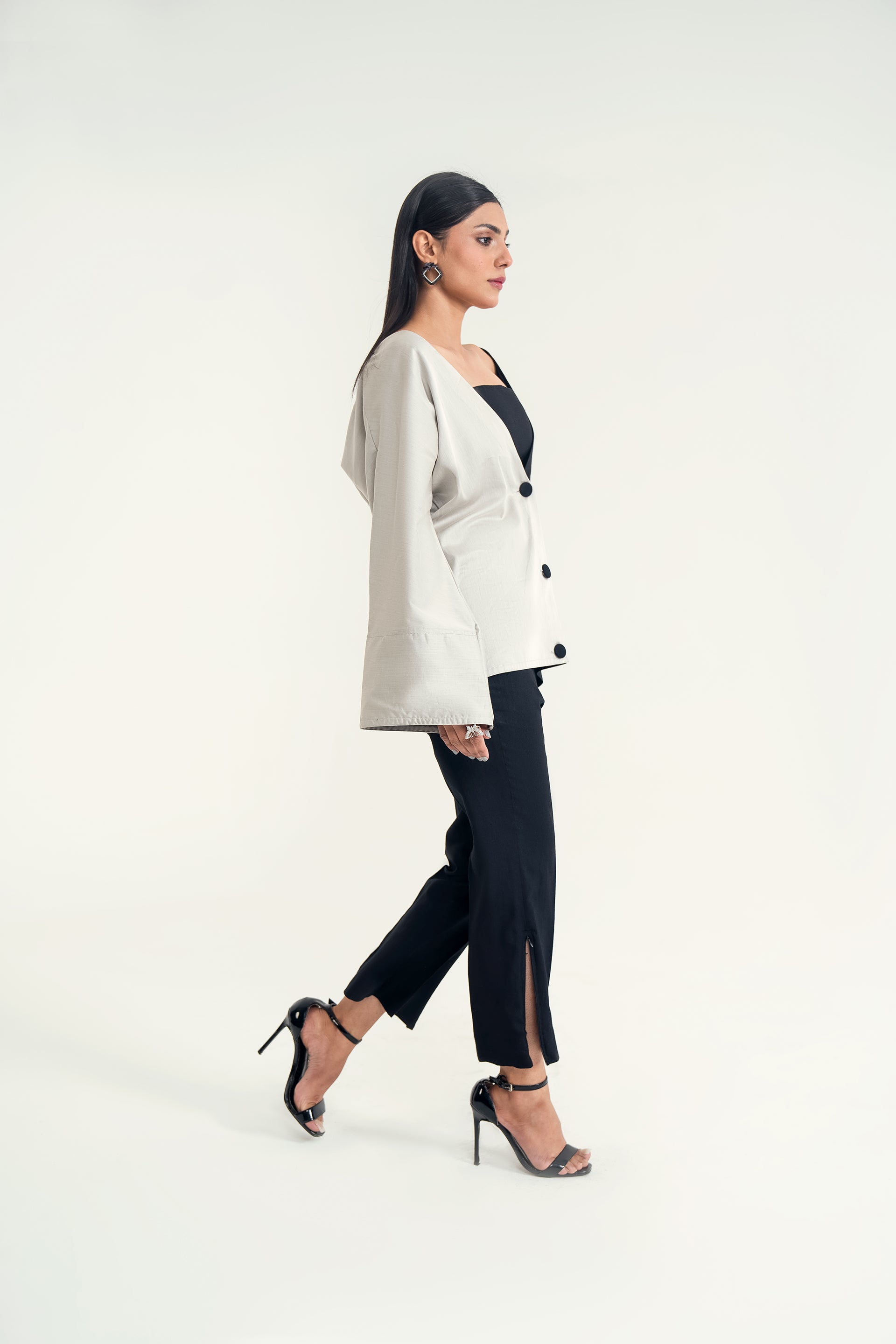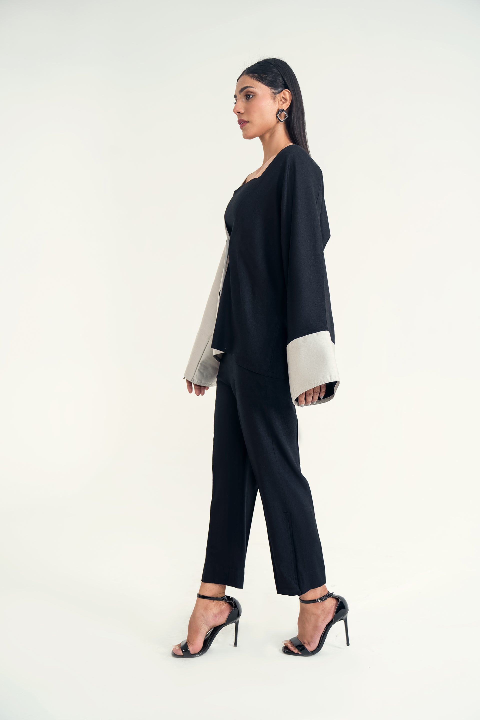 Description: A chic marina top with batwing sleeves and a sleek bustier, paired with front-slit cropped trousers for a modern, sophisticated look—perfect for effortless winter styling.