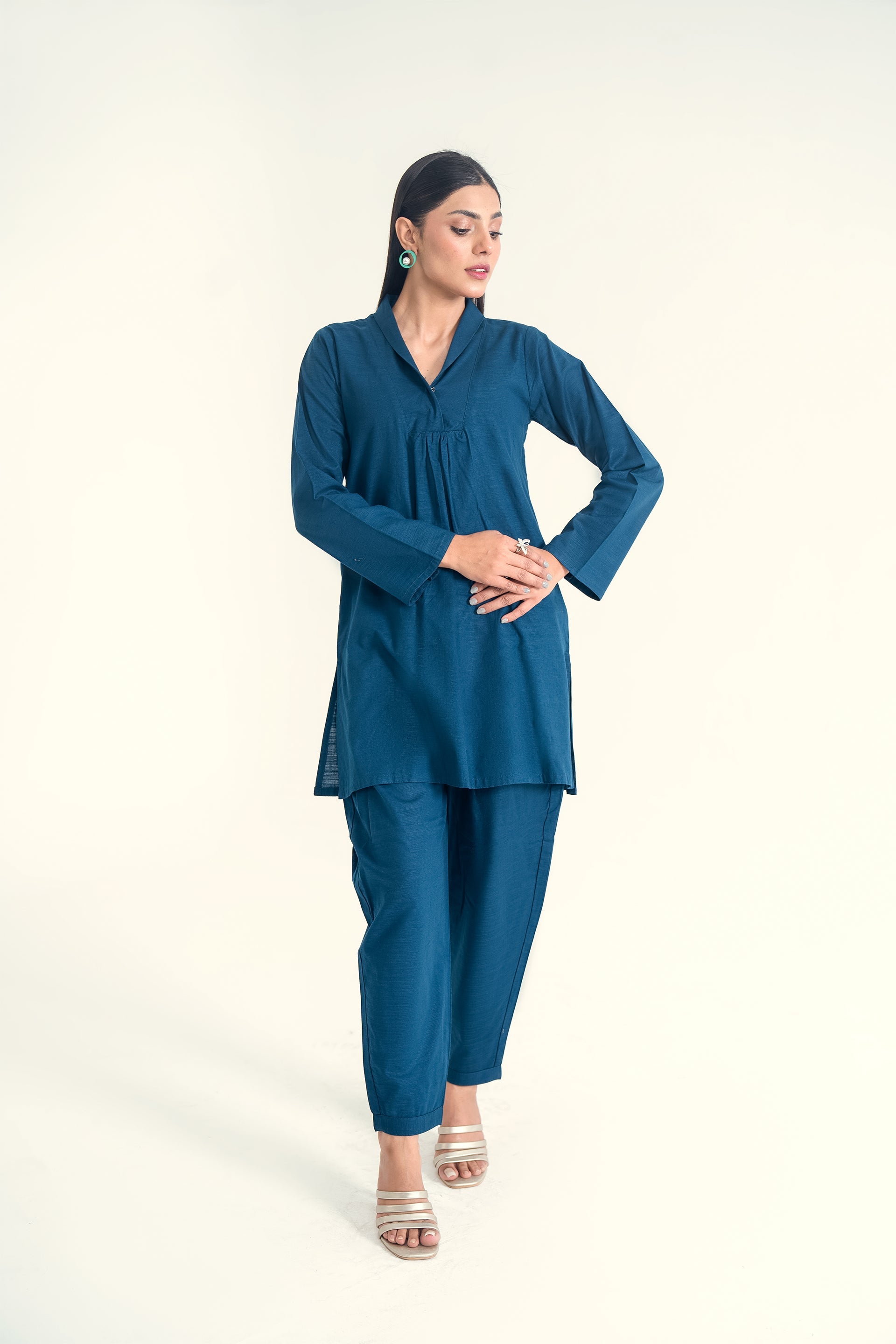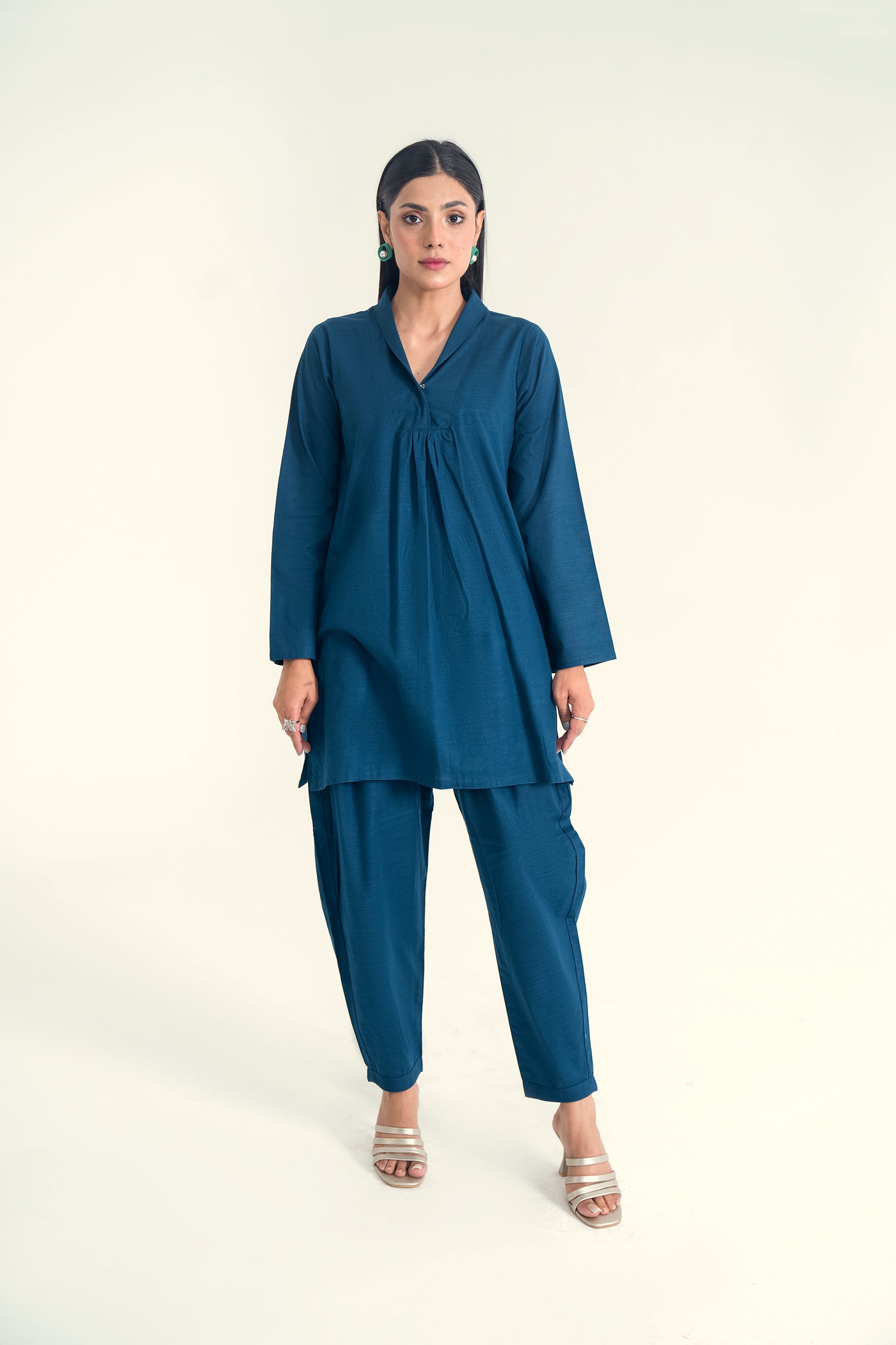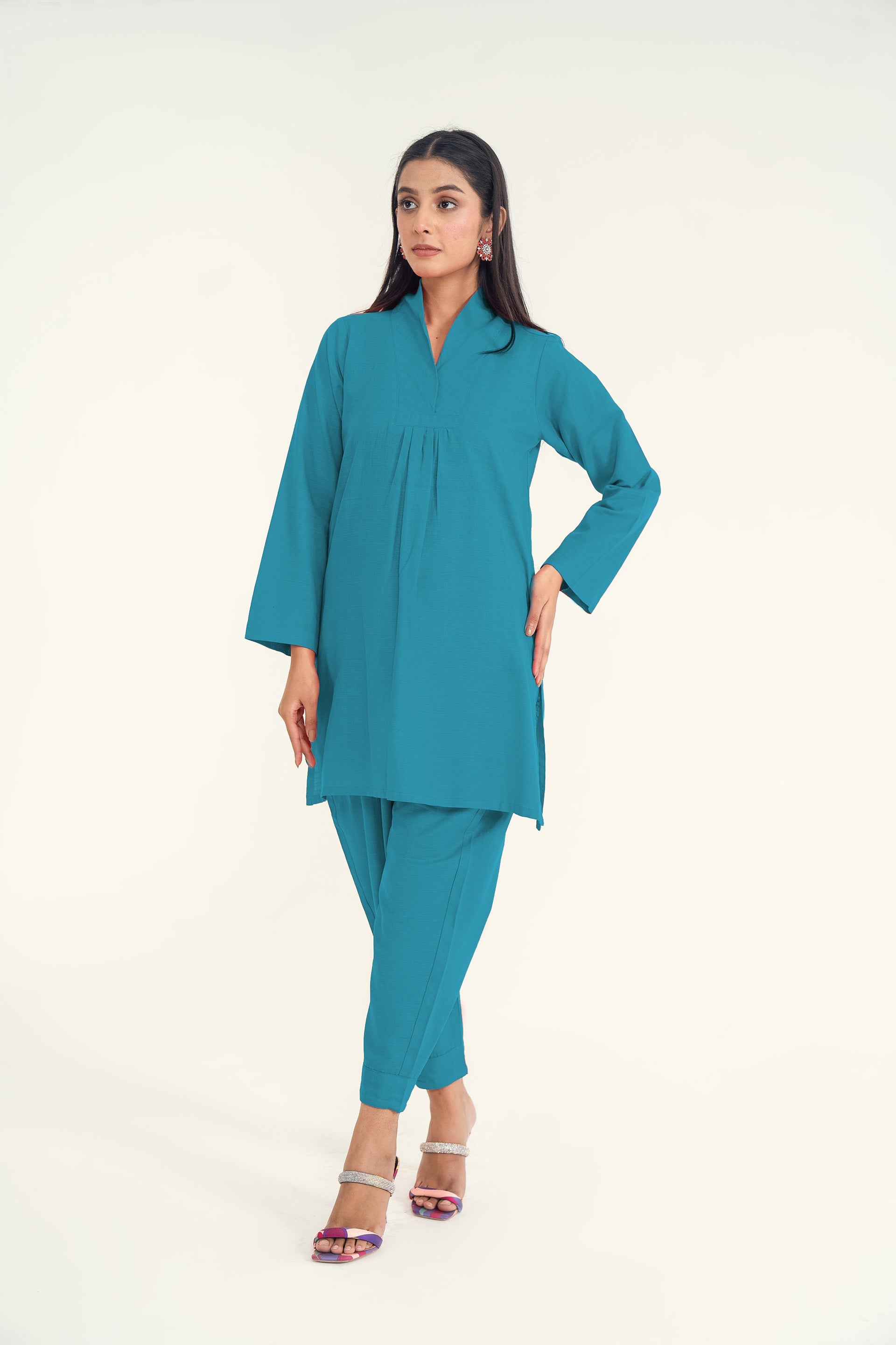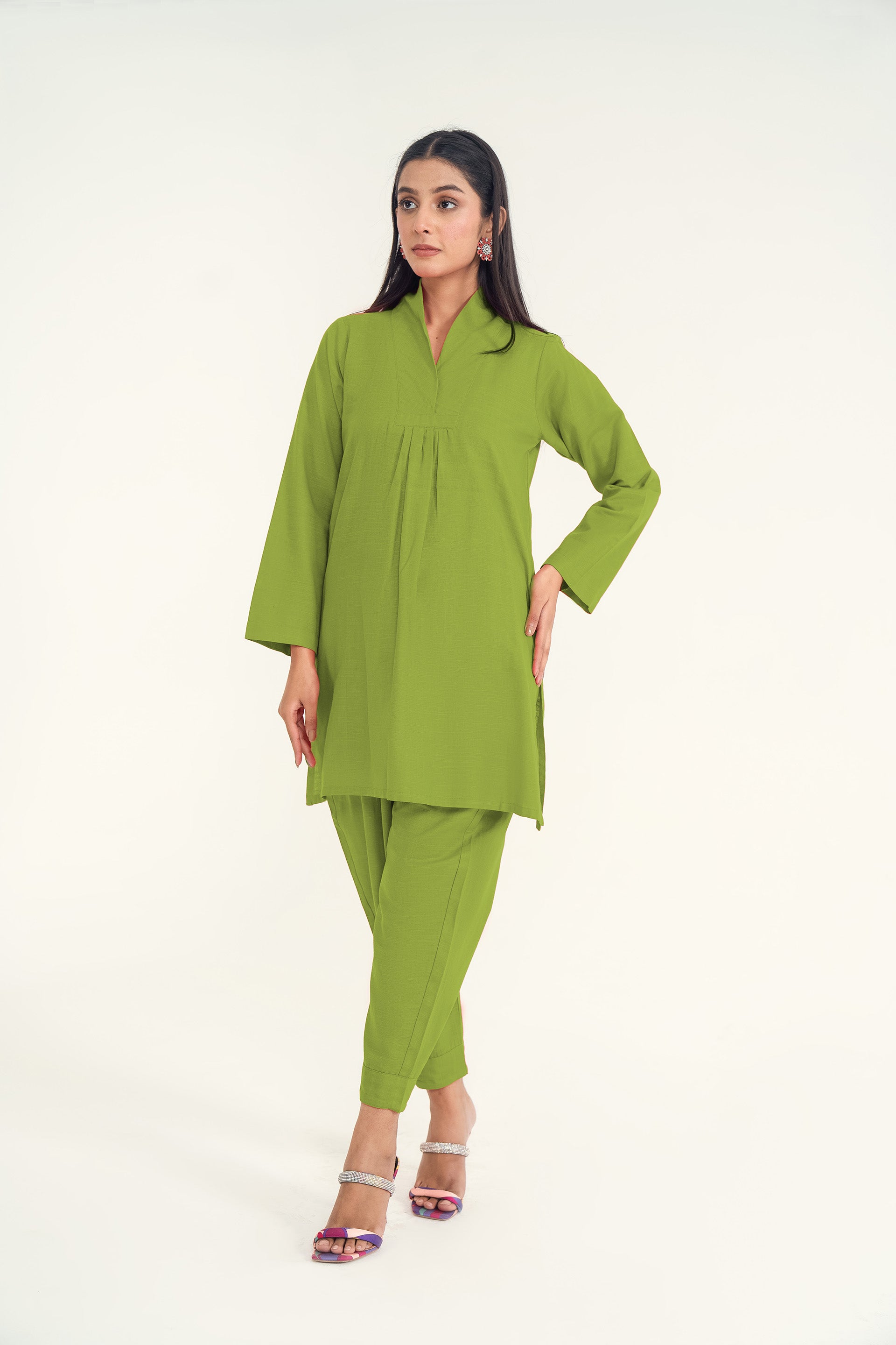 A soft khaddar co-ord set ensemble featuring a chic front collar neckline and classic shalwar, offering a perfect blend of warmth, comfort, and timeless elegance for the cooler seasons.
