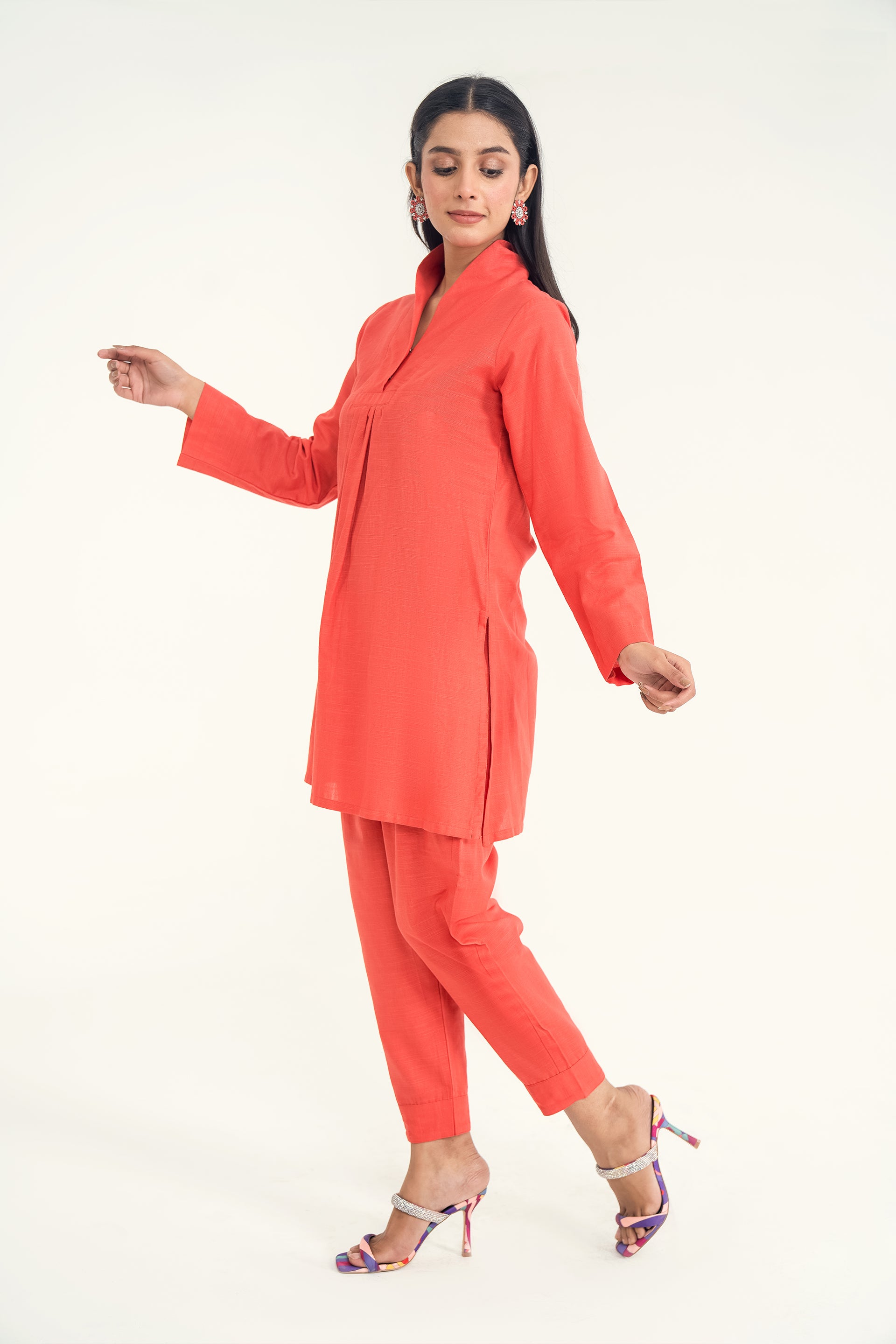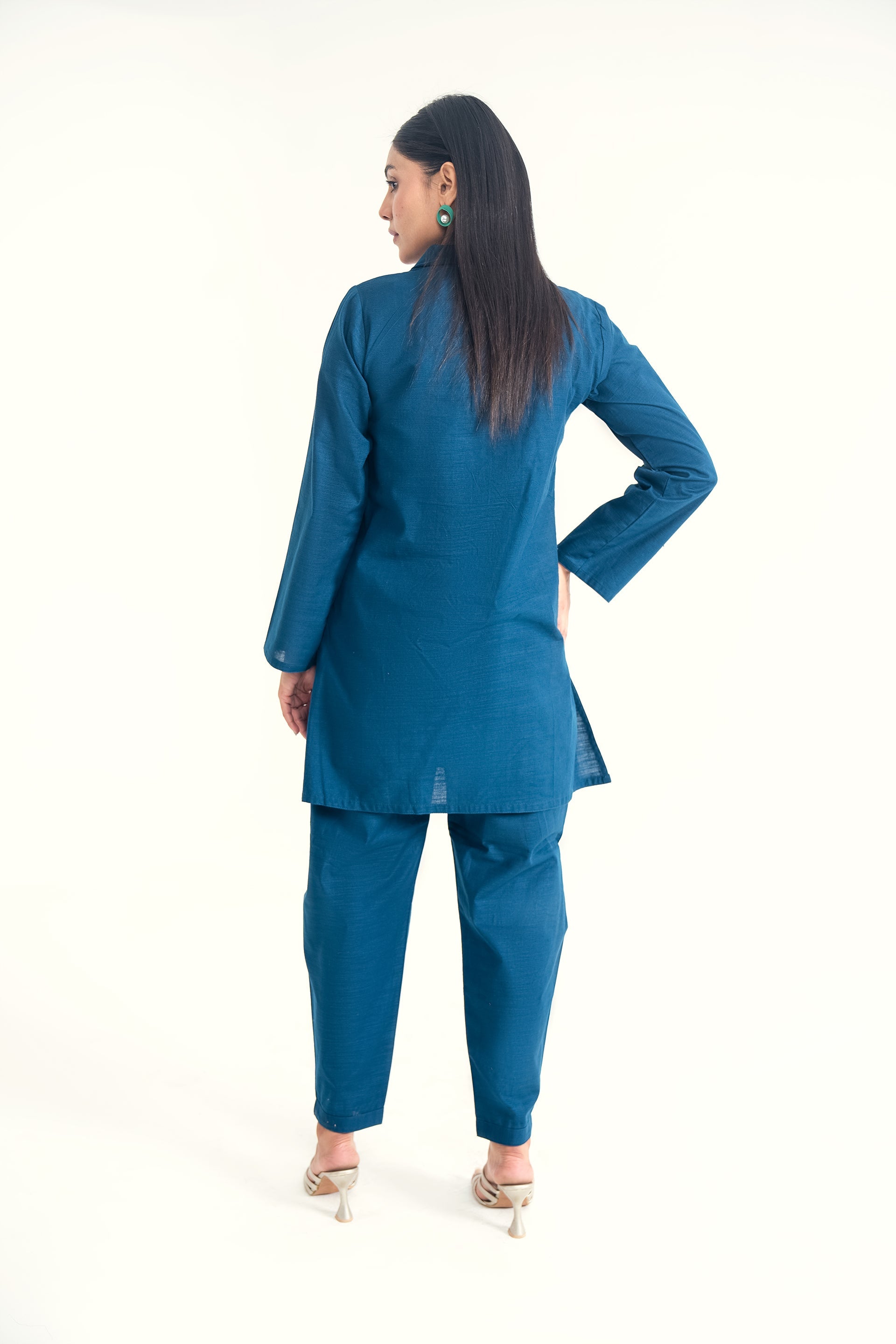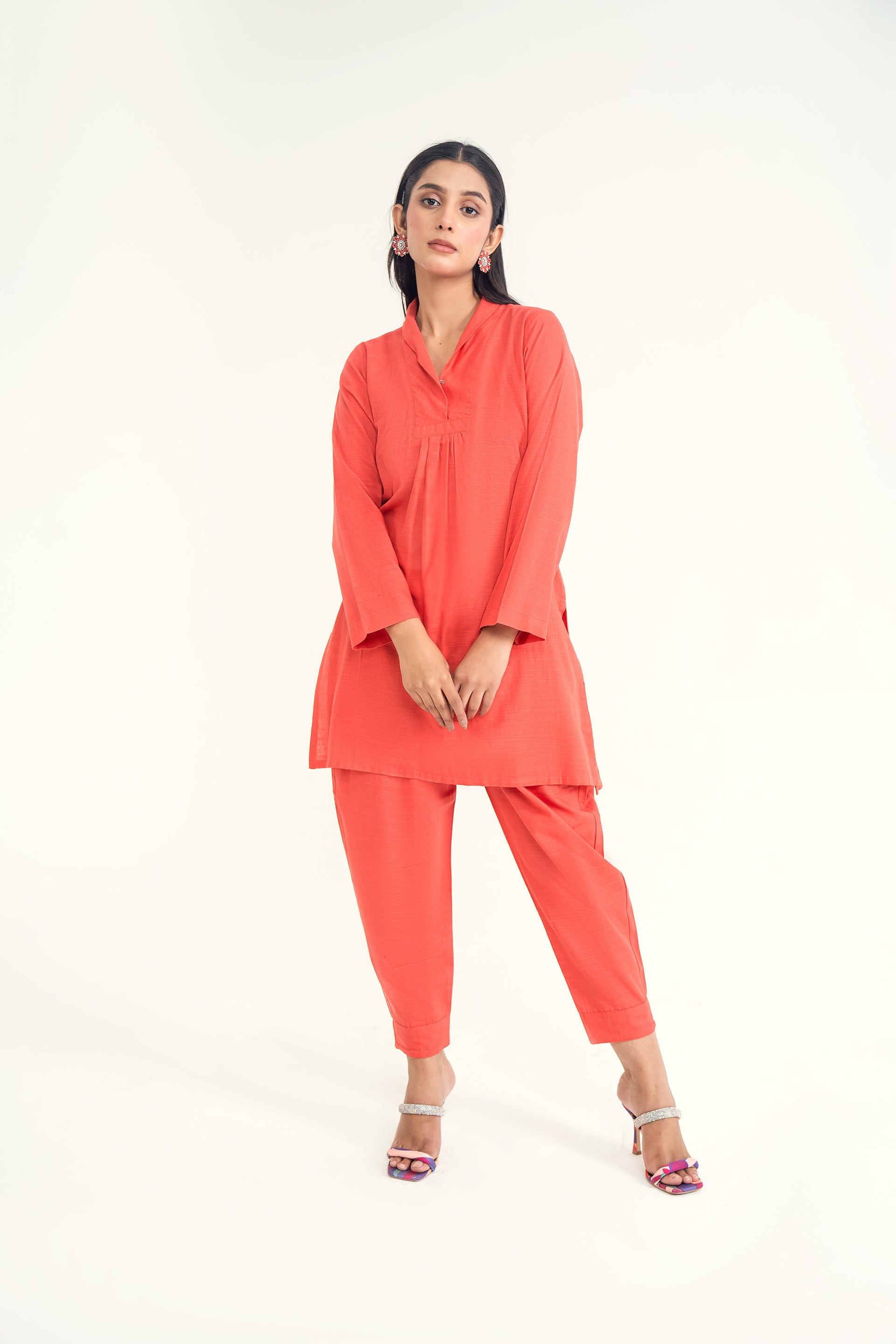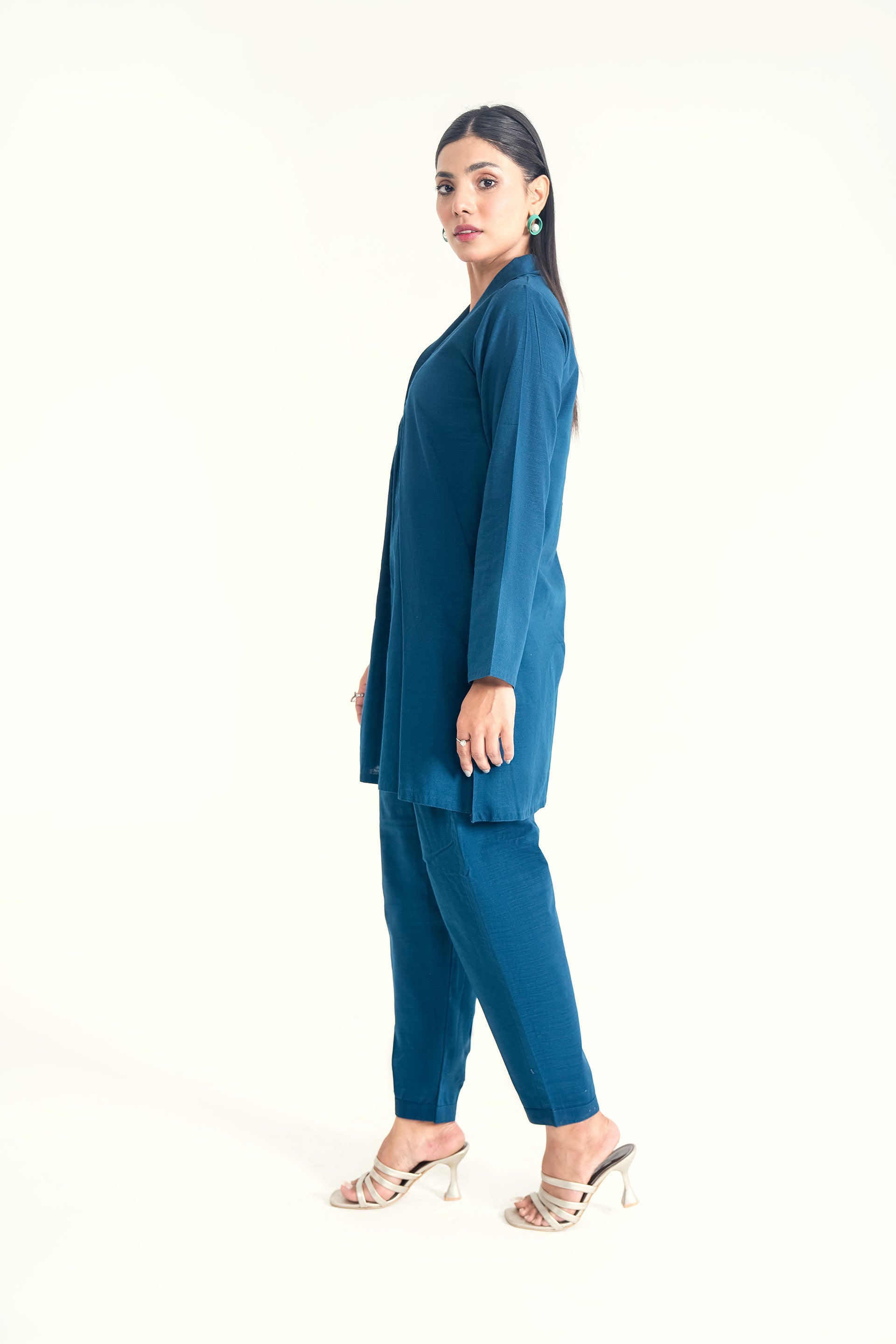 A soft khaddar co-ord set ensemble featuring a chic front collar neckline and classic shalwar, offering a perfect blend of warmth, comfort, and timeless elegance for the cooler seasons.