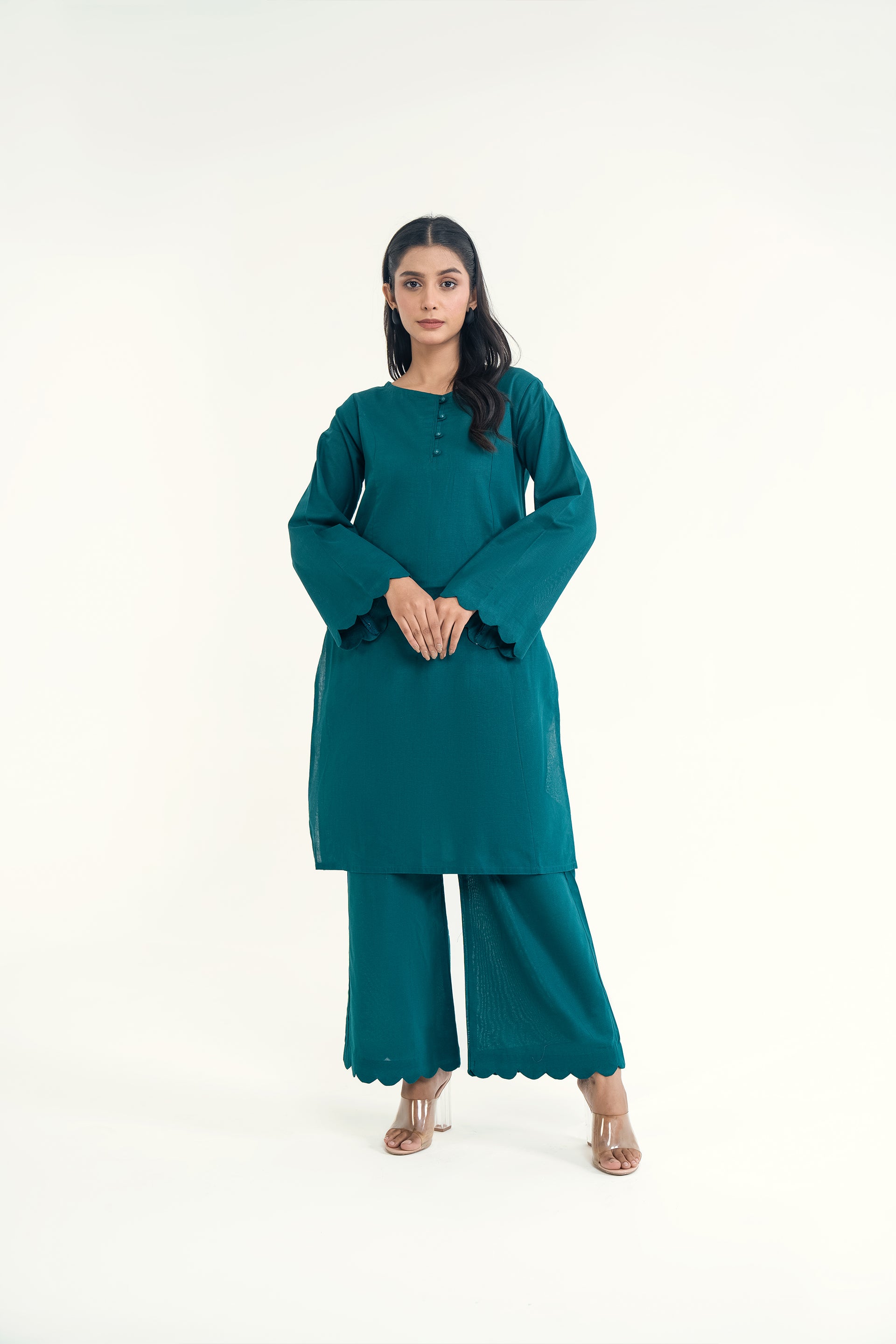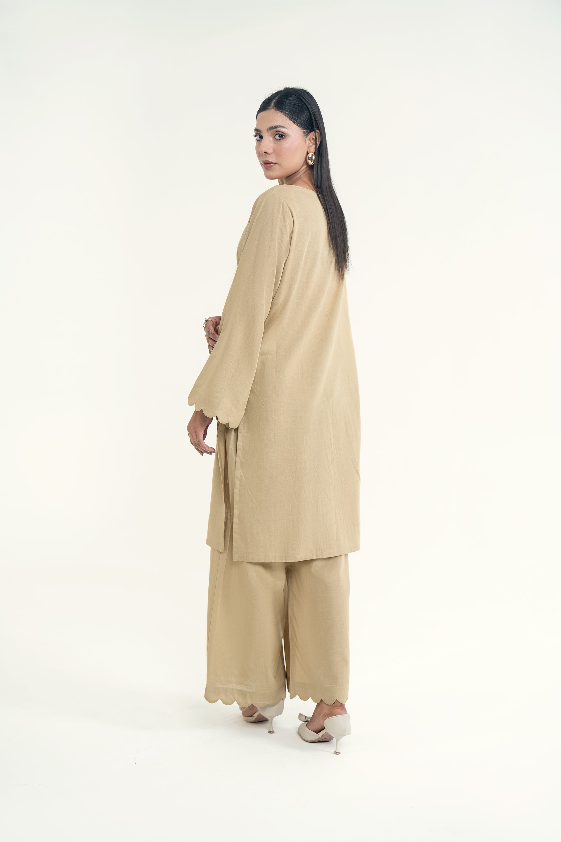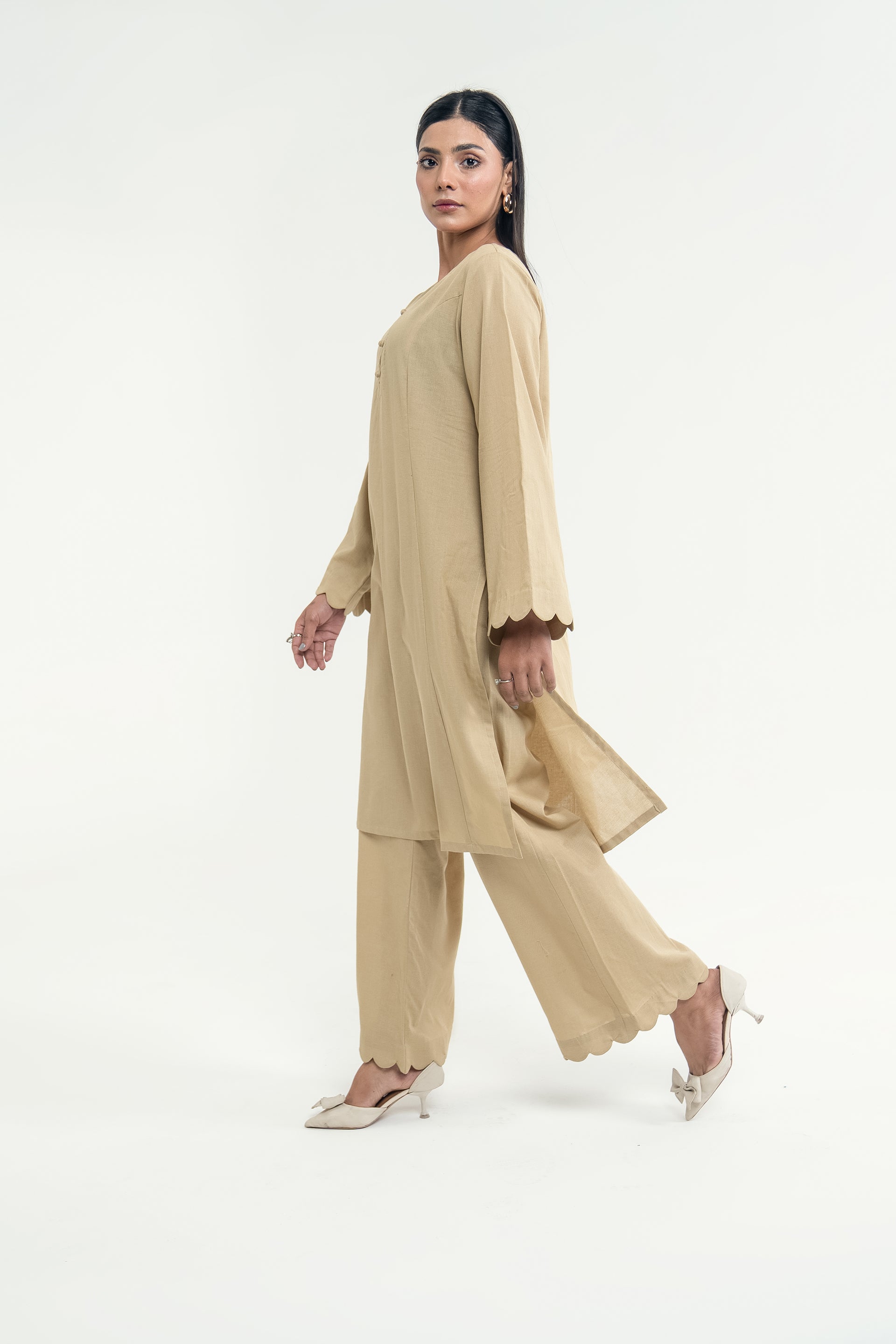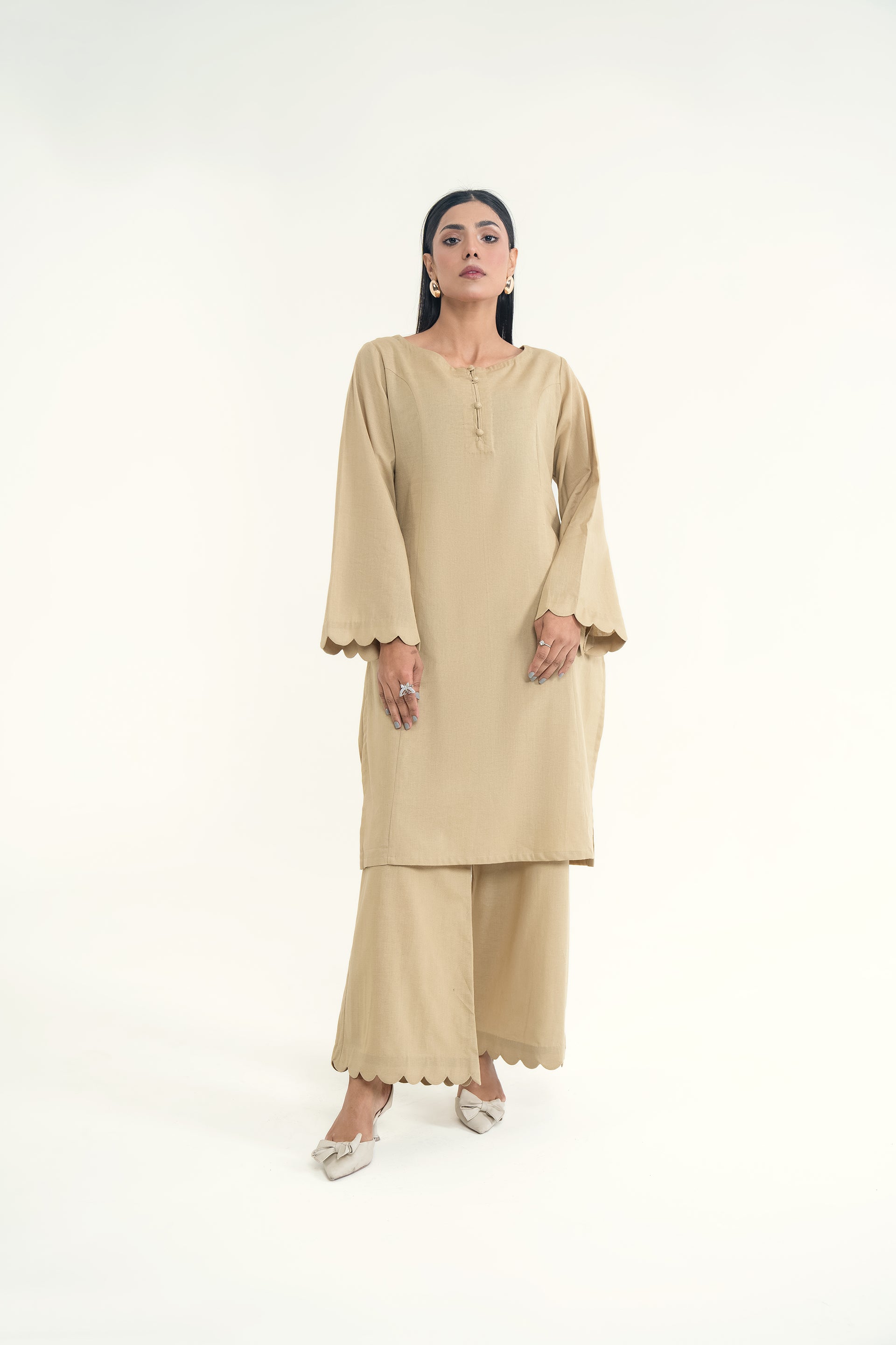 Elina stands out for its soft khaddar appeal, classic round neckline with dome buttons, scalloped sleeves, and flared trousers for a timeless silhouette.