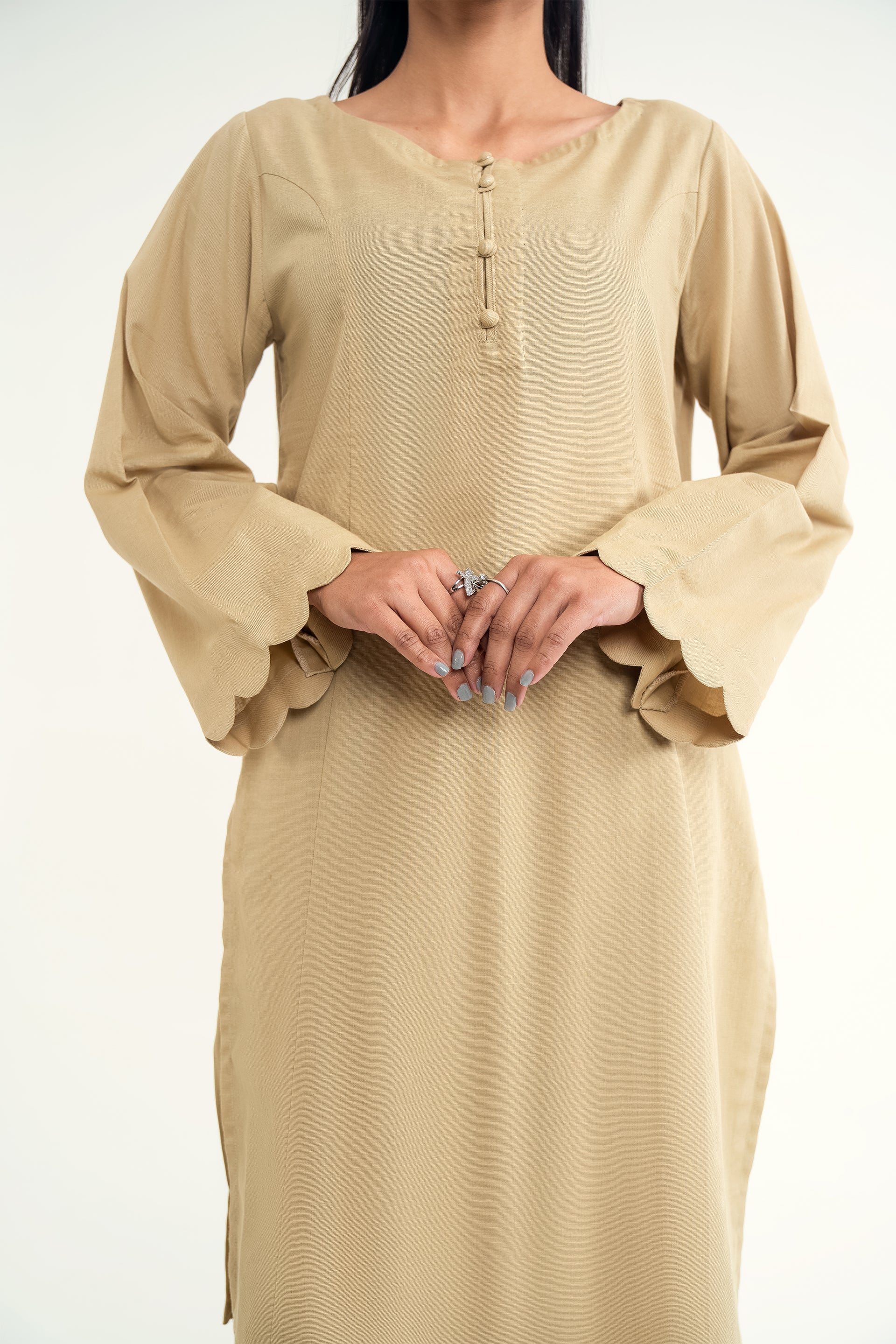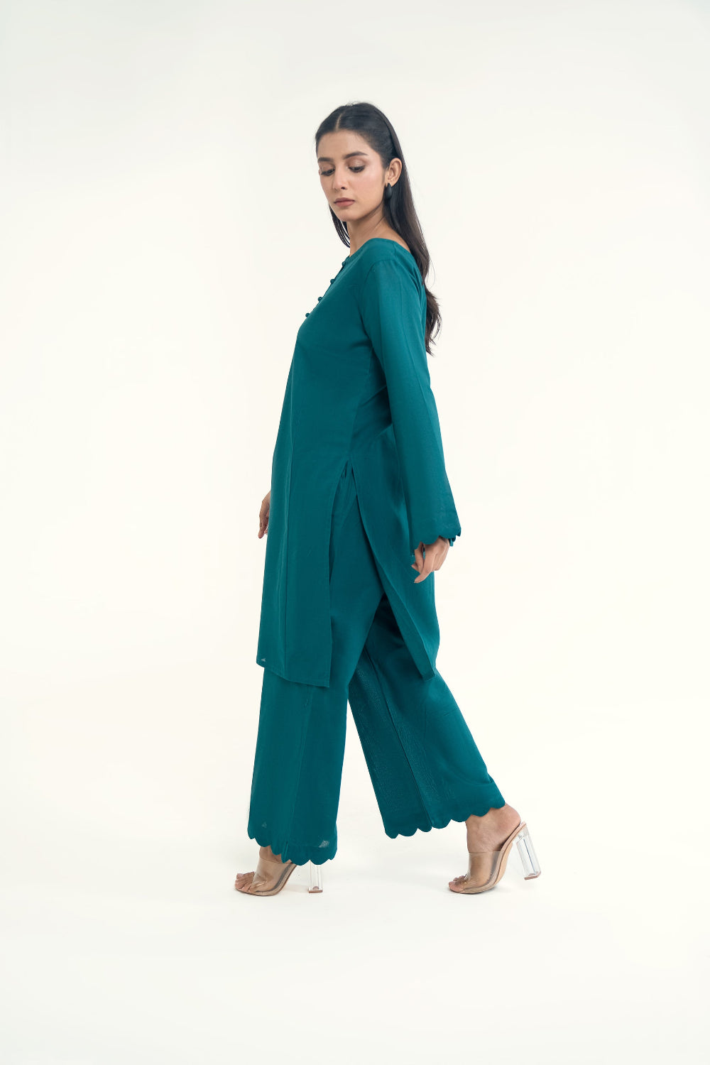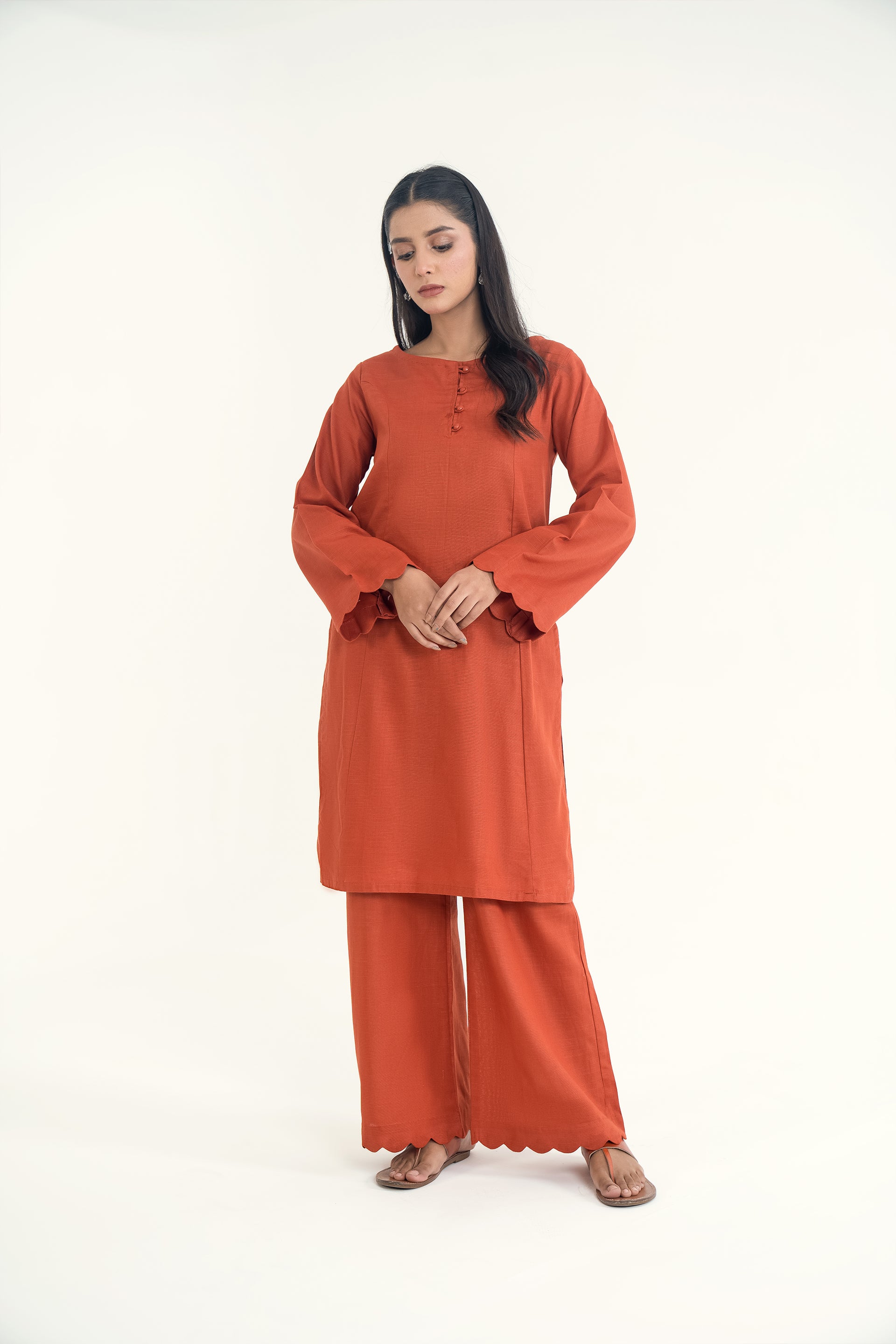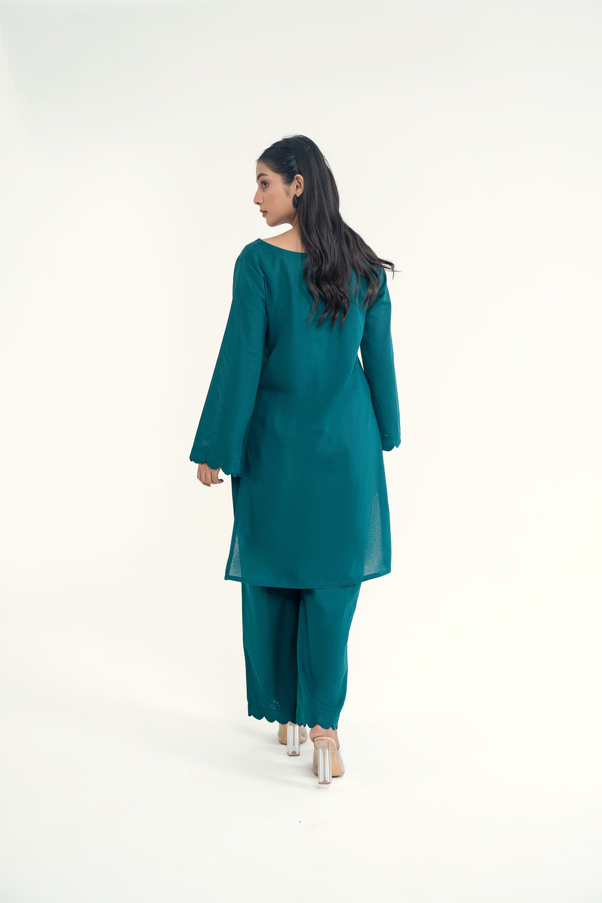 Elina stands out for its soft khaddar appeal, classic round neckline with dome buttons, scalloped sleeves, and flared trousers for a timeless silhouette.