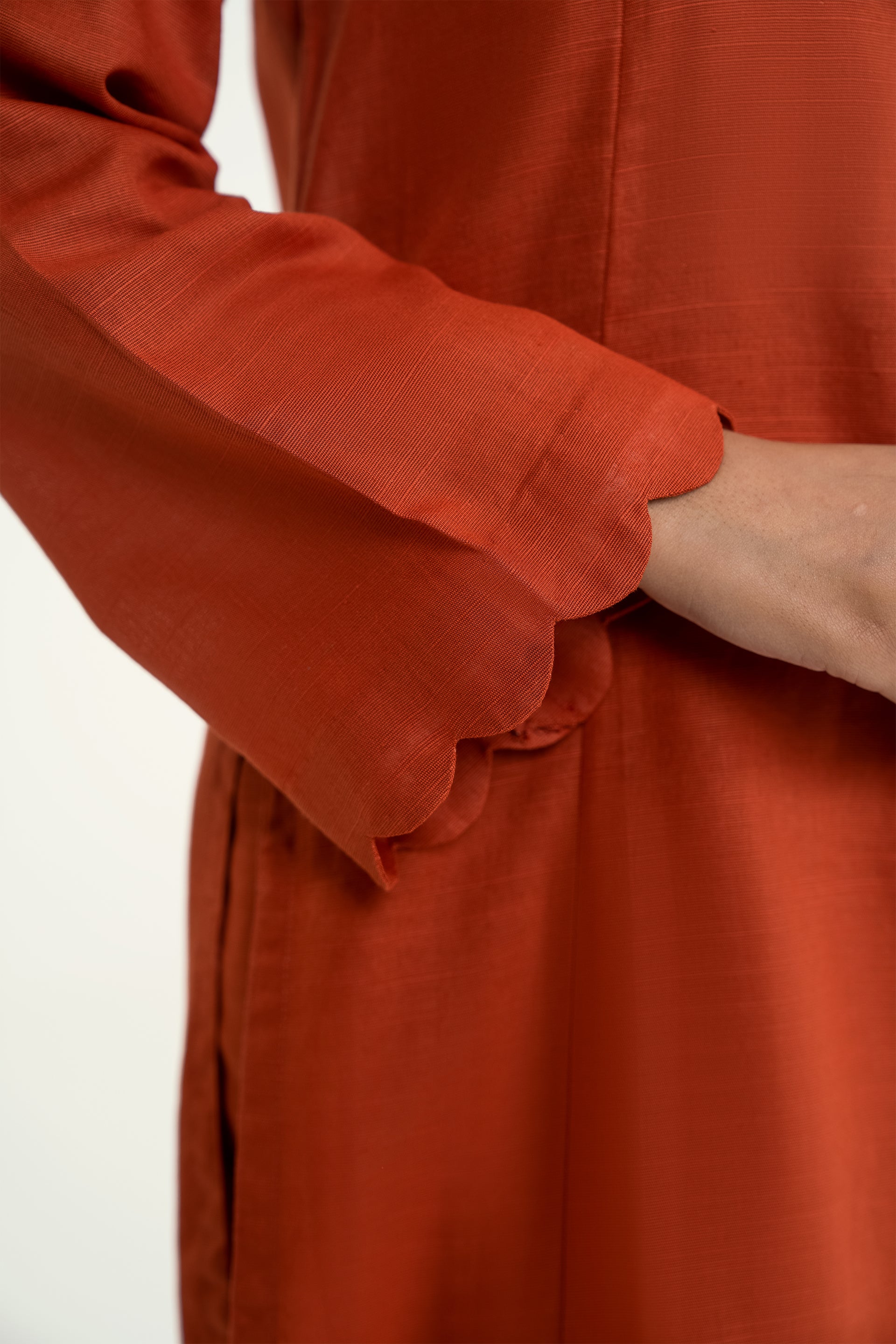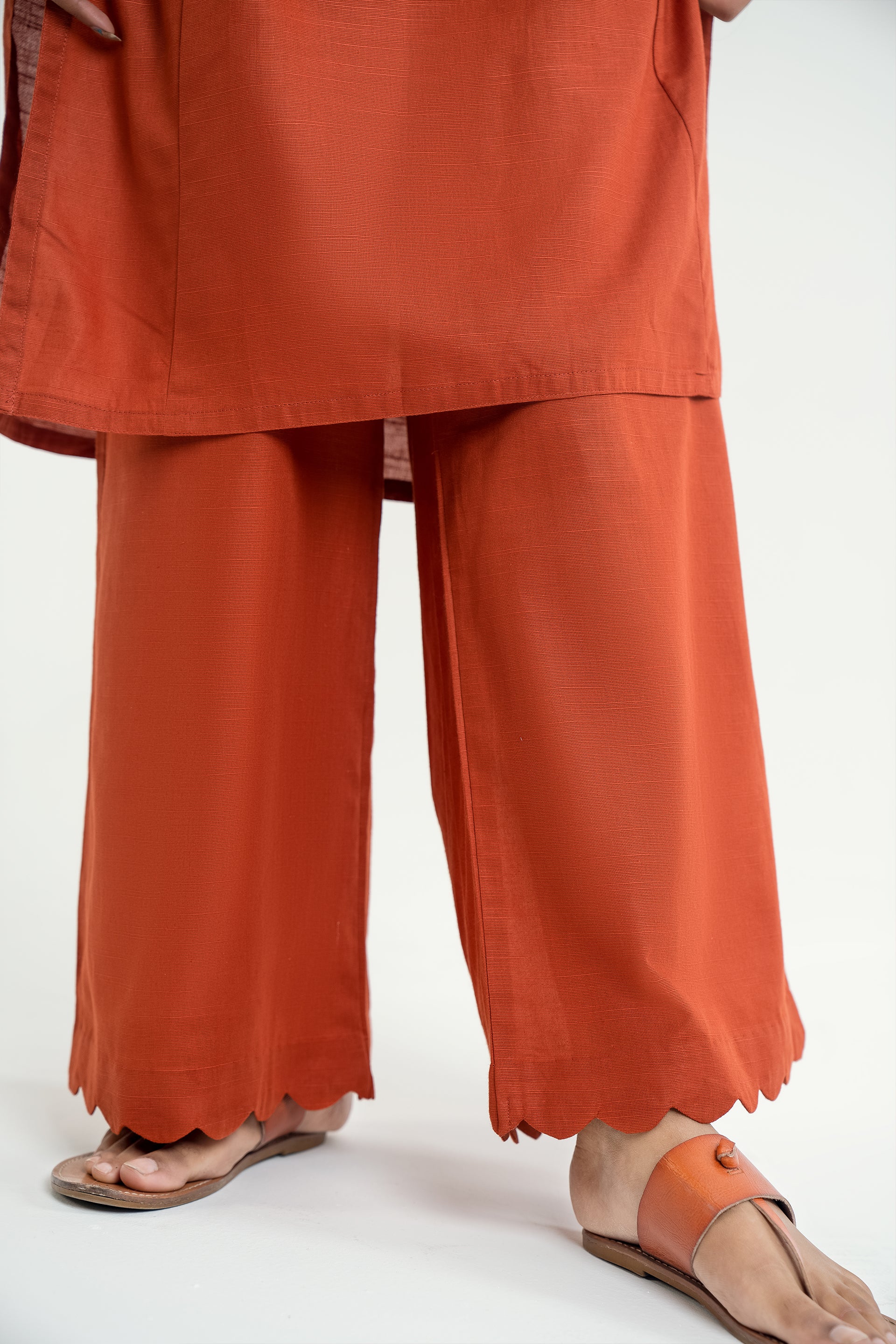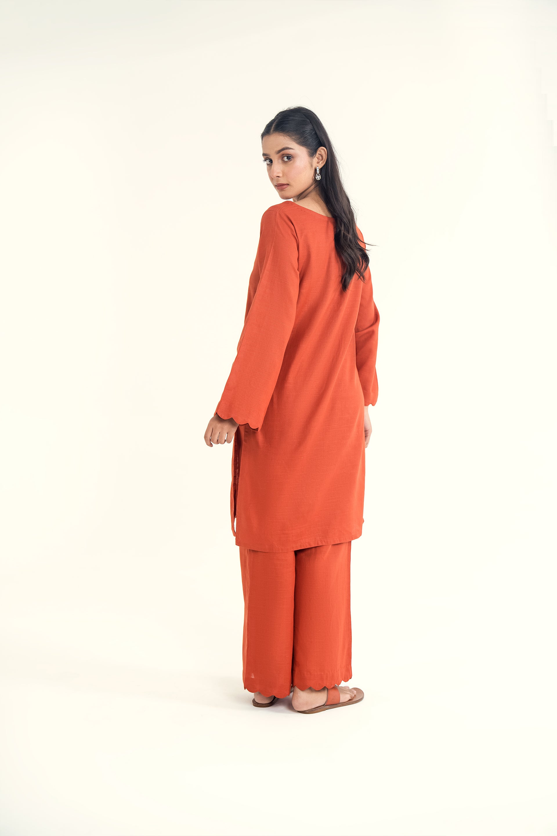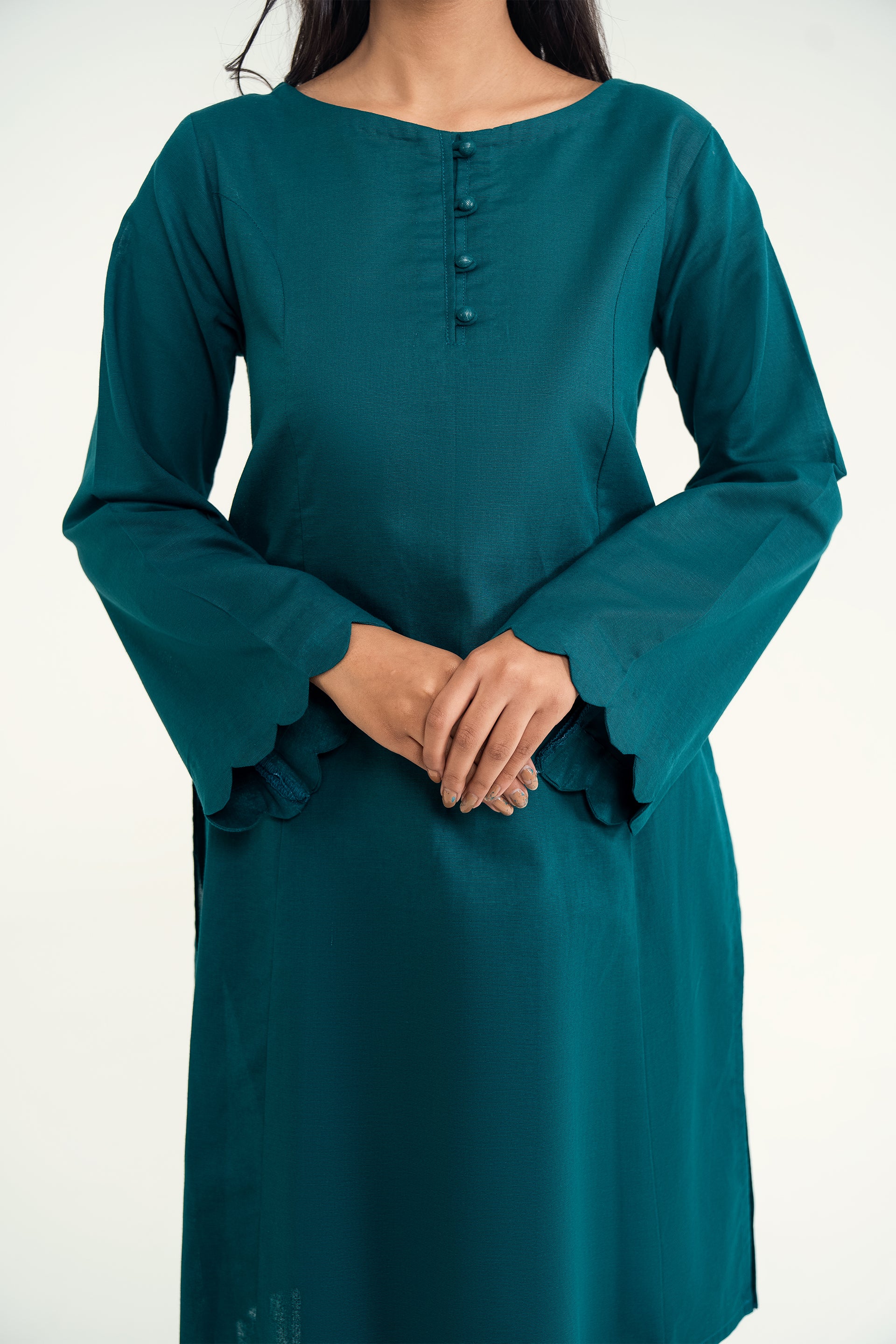 Elina stands out for its soft khaddar appeal, classic round neckline with dome buttons, scalloped sleeves, and flared trousers for a timeless silhouette.