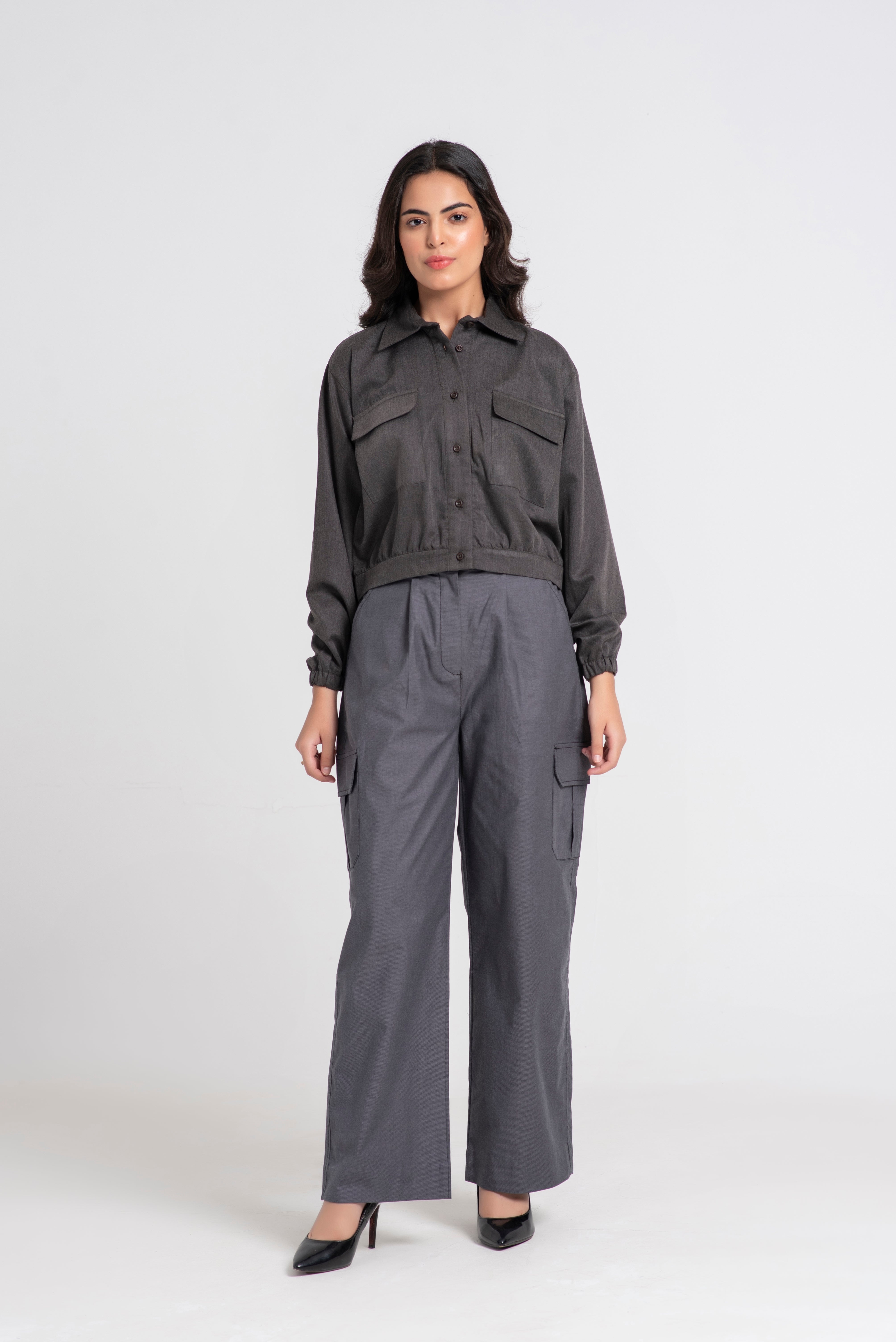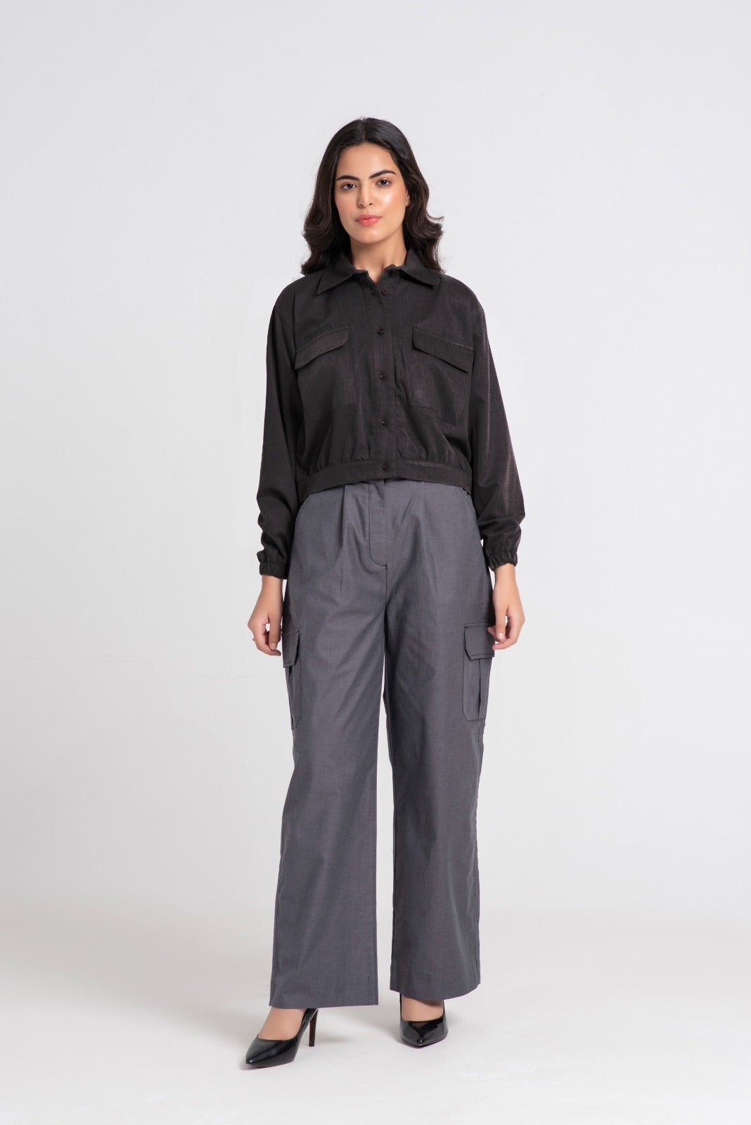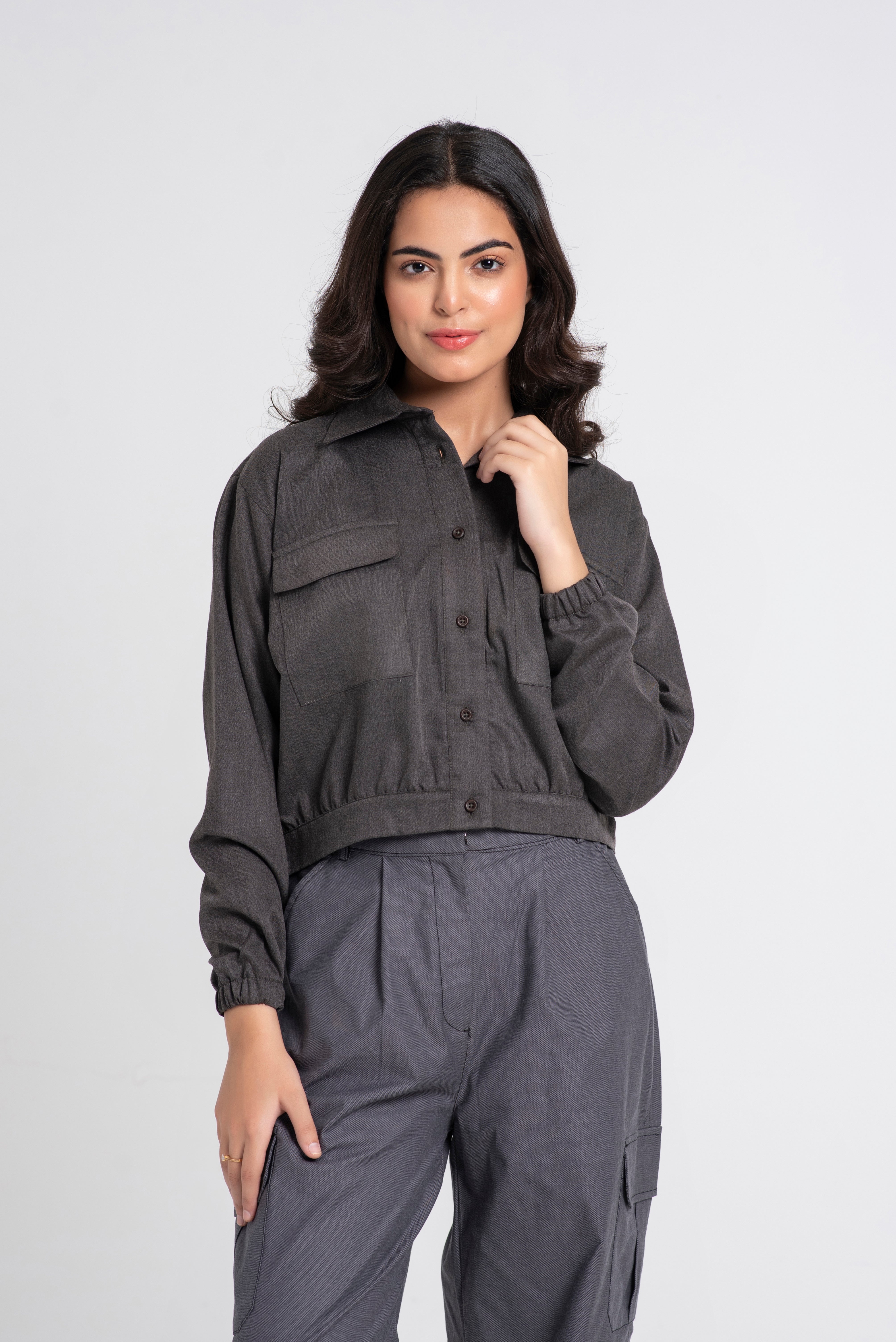 Description: This button-down shirt blends utility and style with a band neckline, elastic-cuffed sleeves, a waist-defining belt, and dual front pockets.