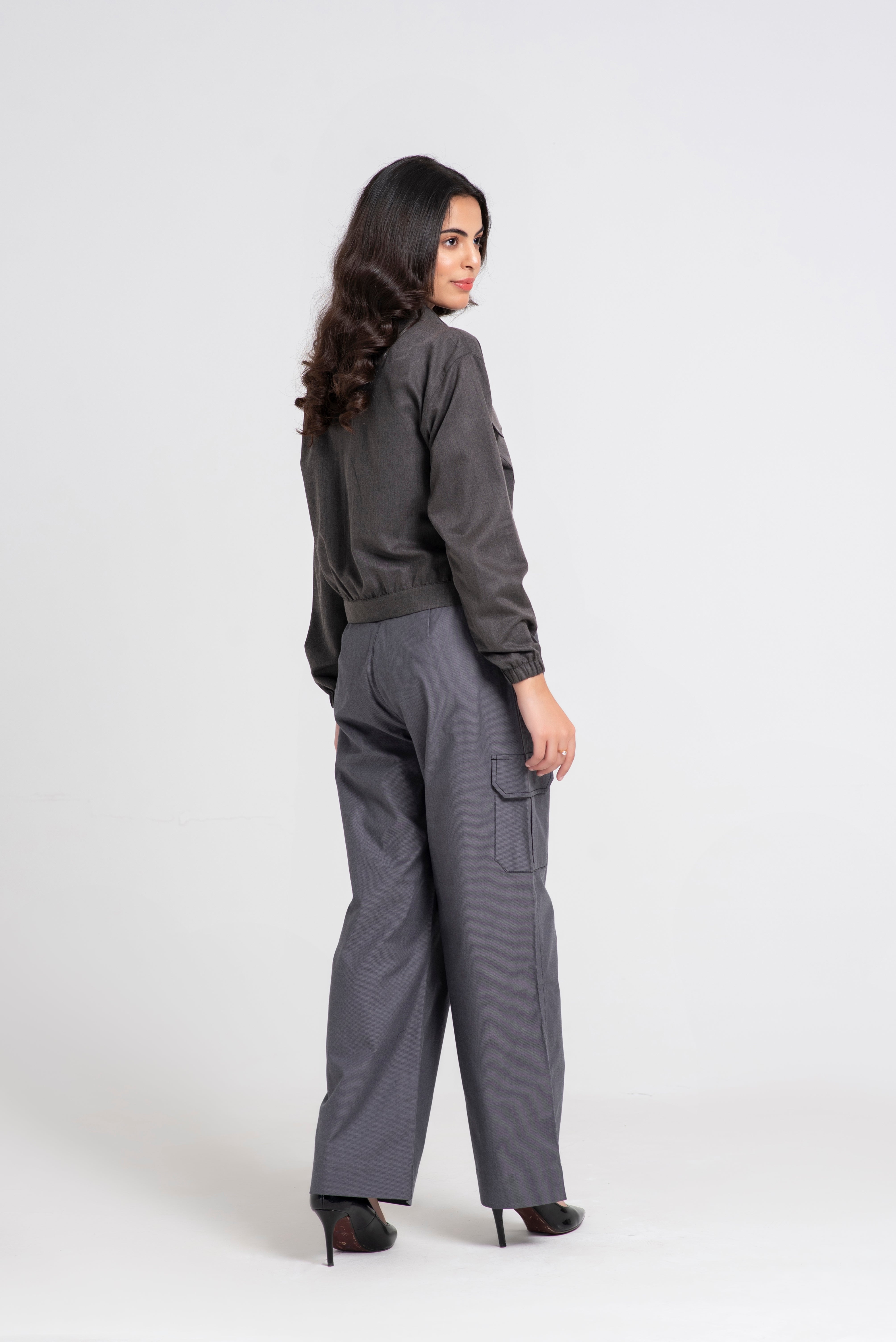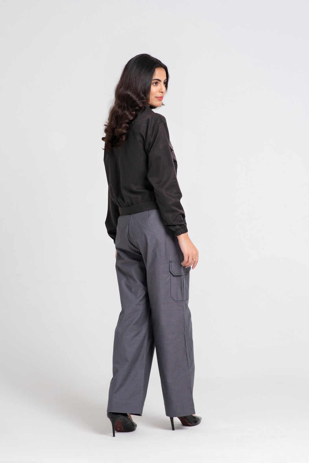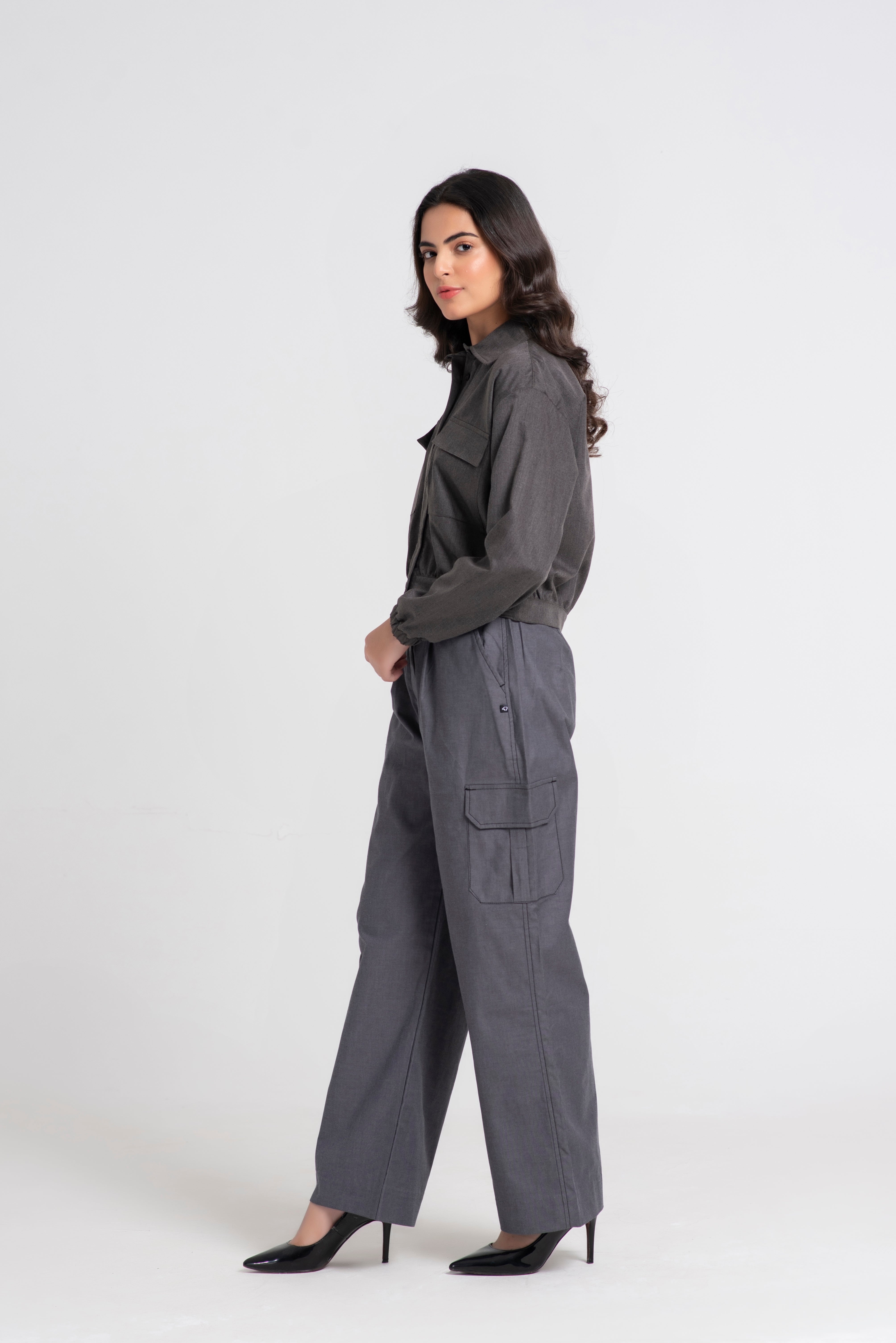 Description: This button-down shirt blends utility and style with a band neckline, elastic-cuffed sleeves, a waist-defining belt, and dual front pockets.