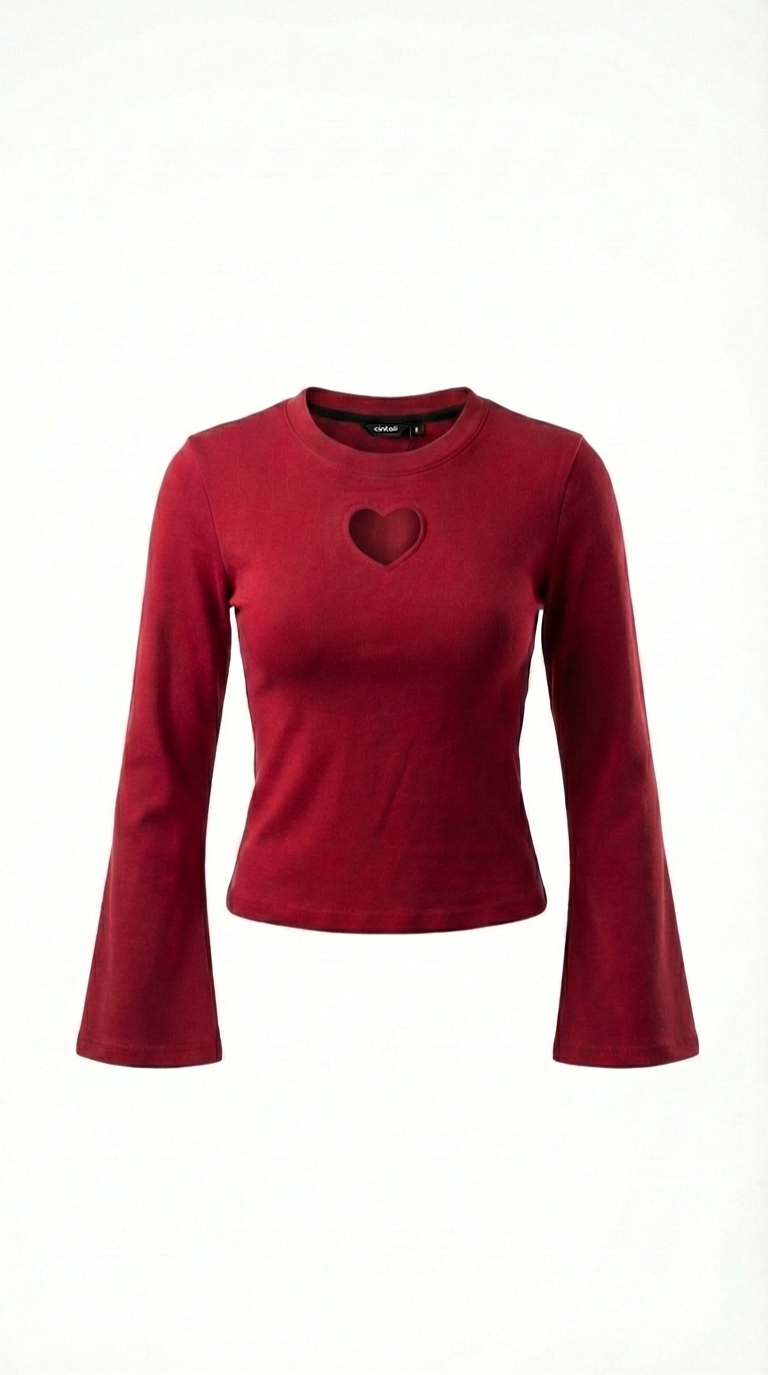 A long-sleeve top featuring a delicate heart-shaped cutout at the center neckline.
