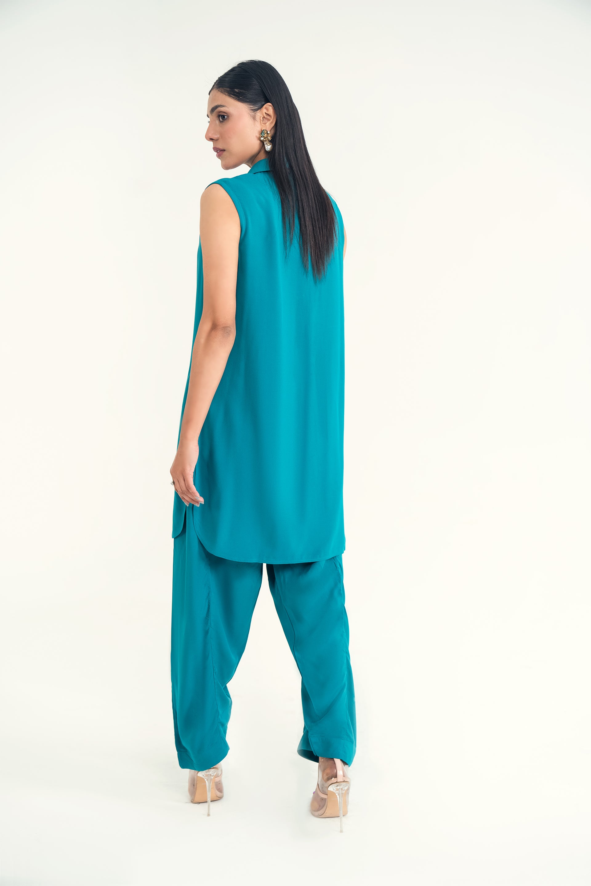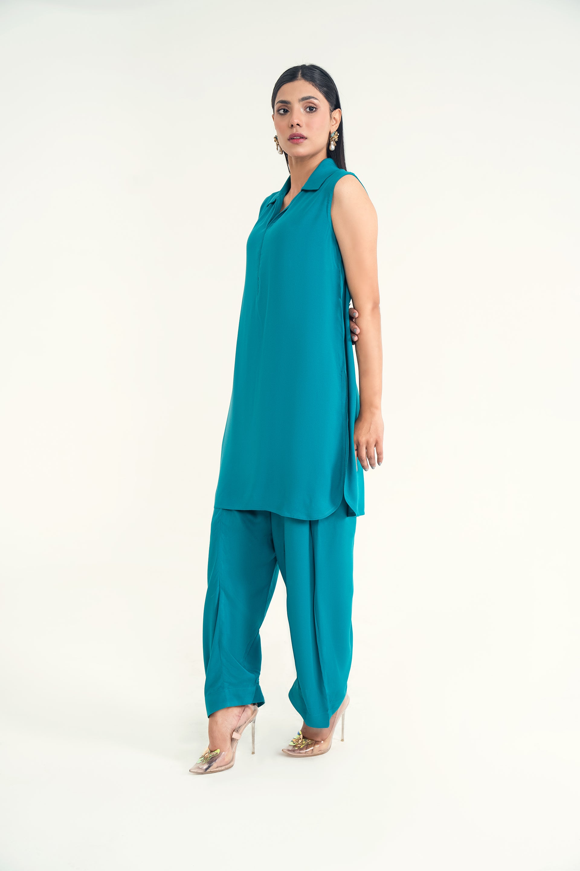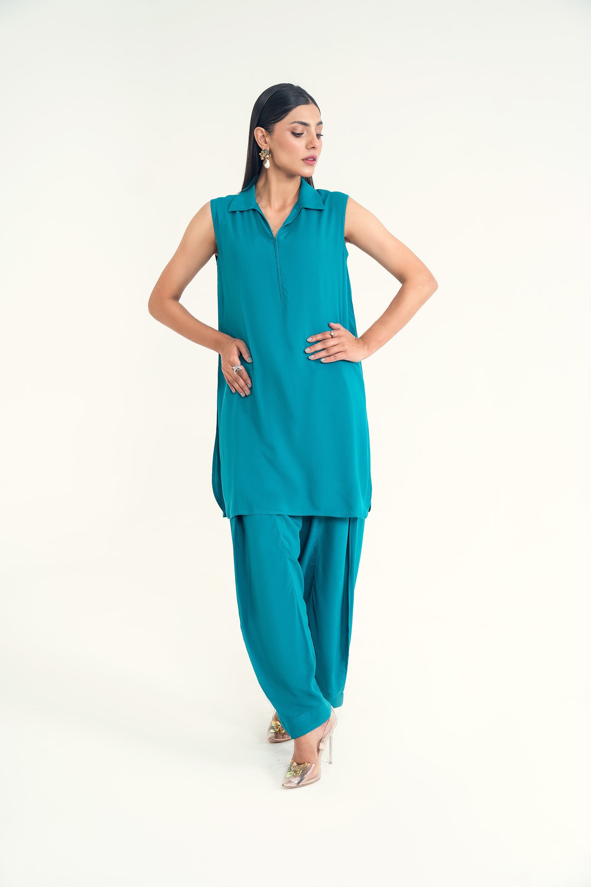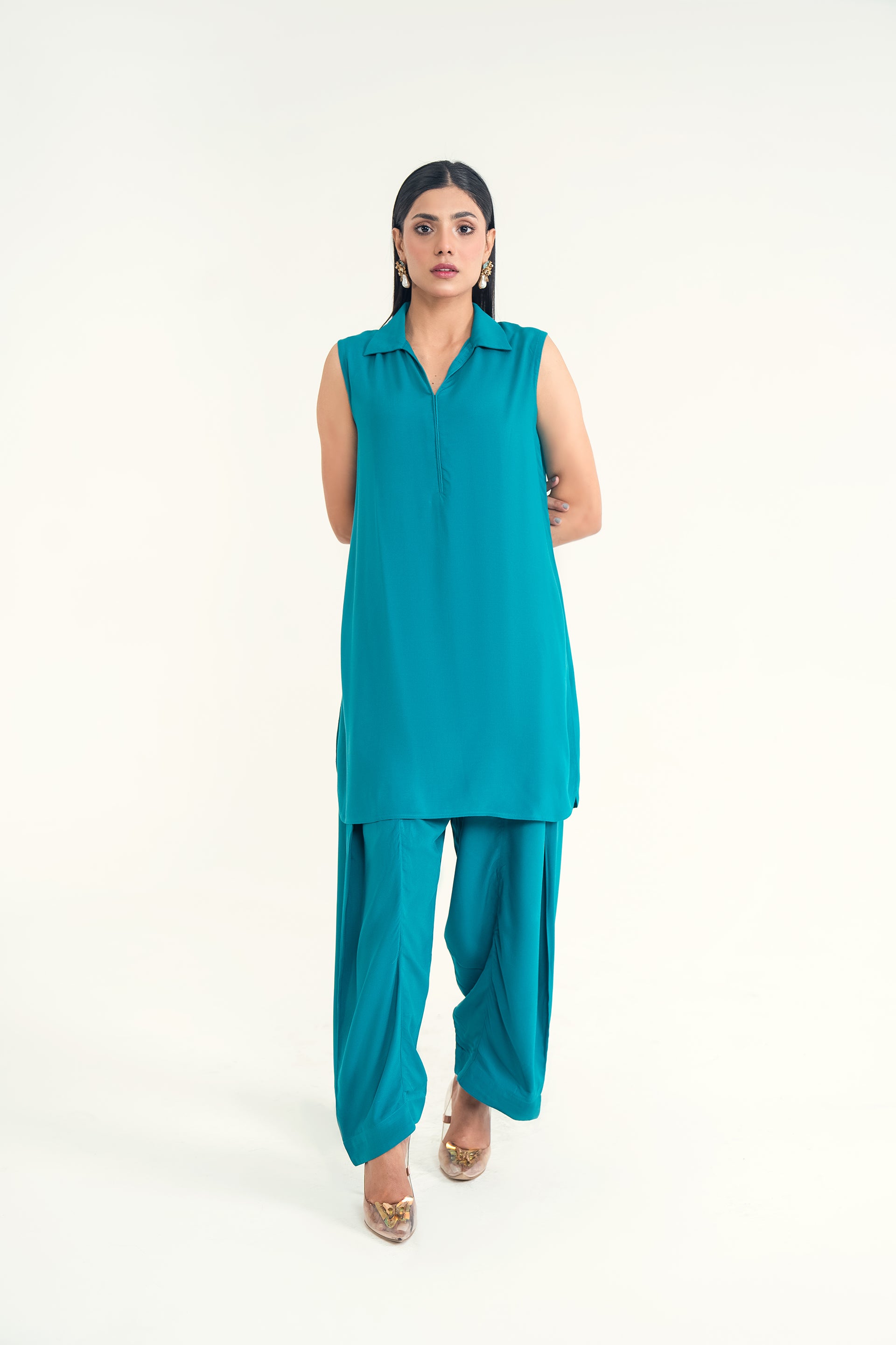 A lightweight woven Gleam ensemble with a collar neckline and classic shalwar, blending Eastern tradition with modern charm—perfect for spring and summer elegance.