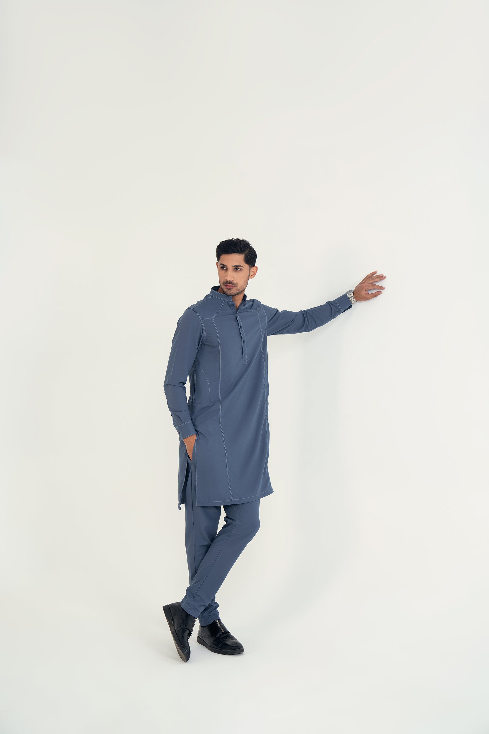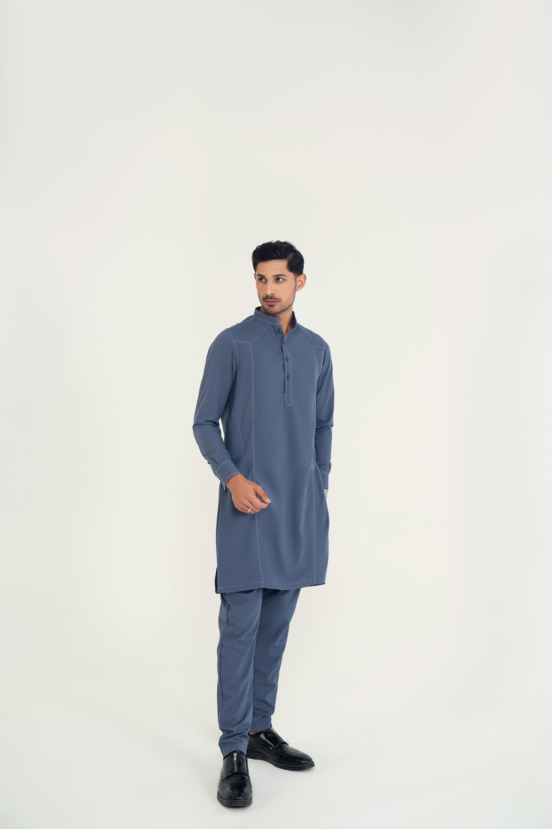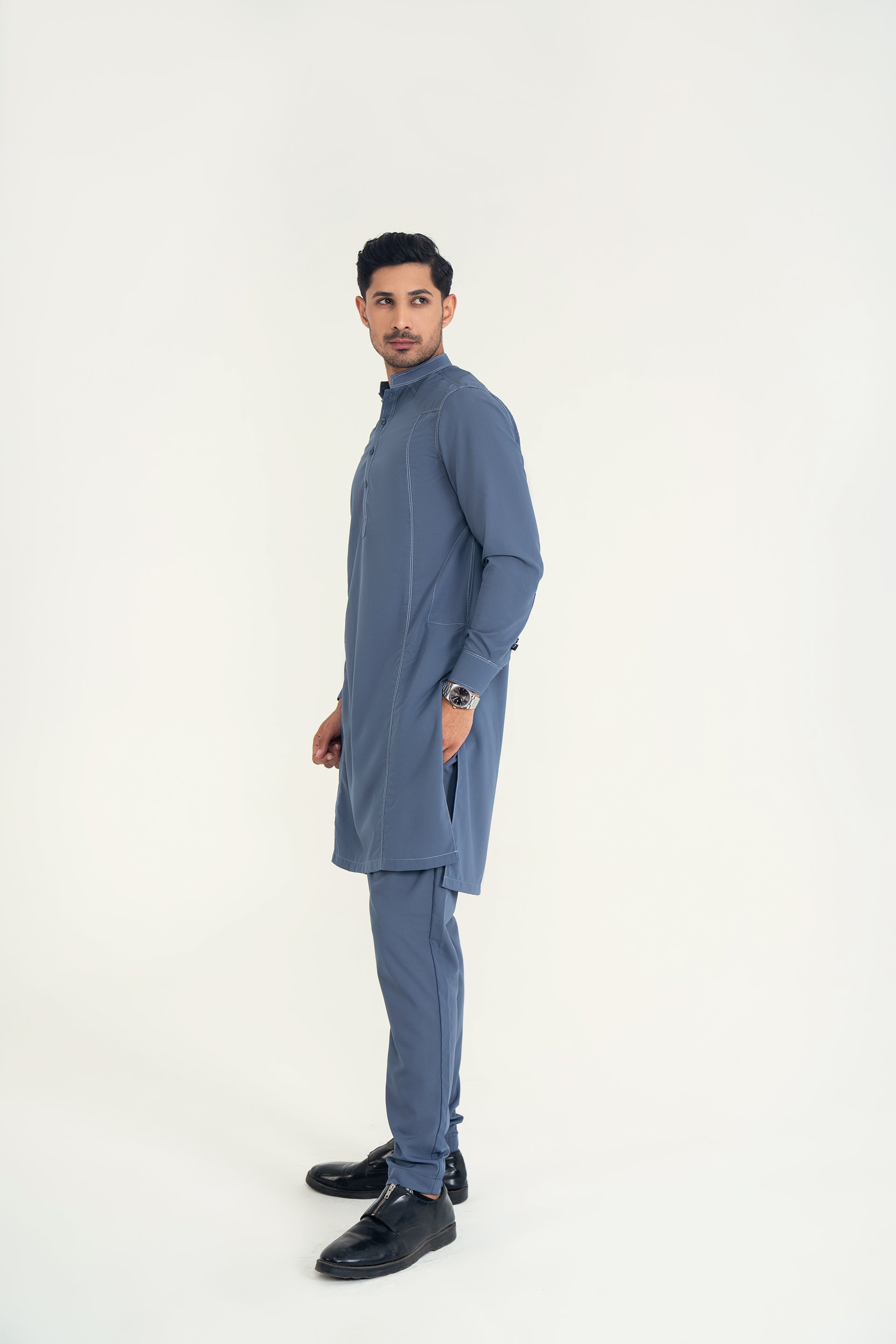 A sophisticated 2-piece kurta set featuring a mandarin ban, button placket, and subtle design lines on the front, paired with coordinating trousers for a polished blend of traditional style and modern elegance.