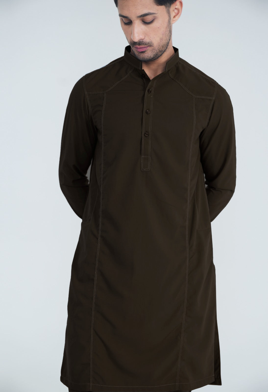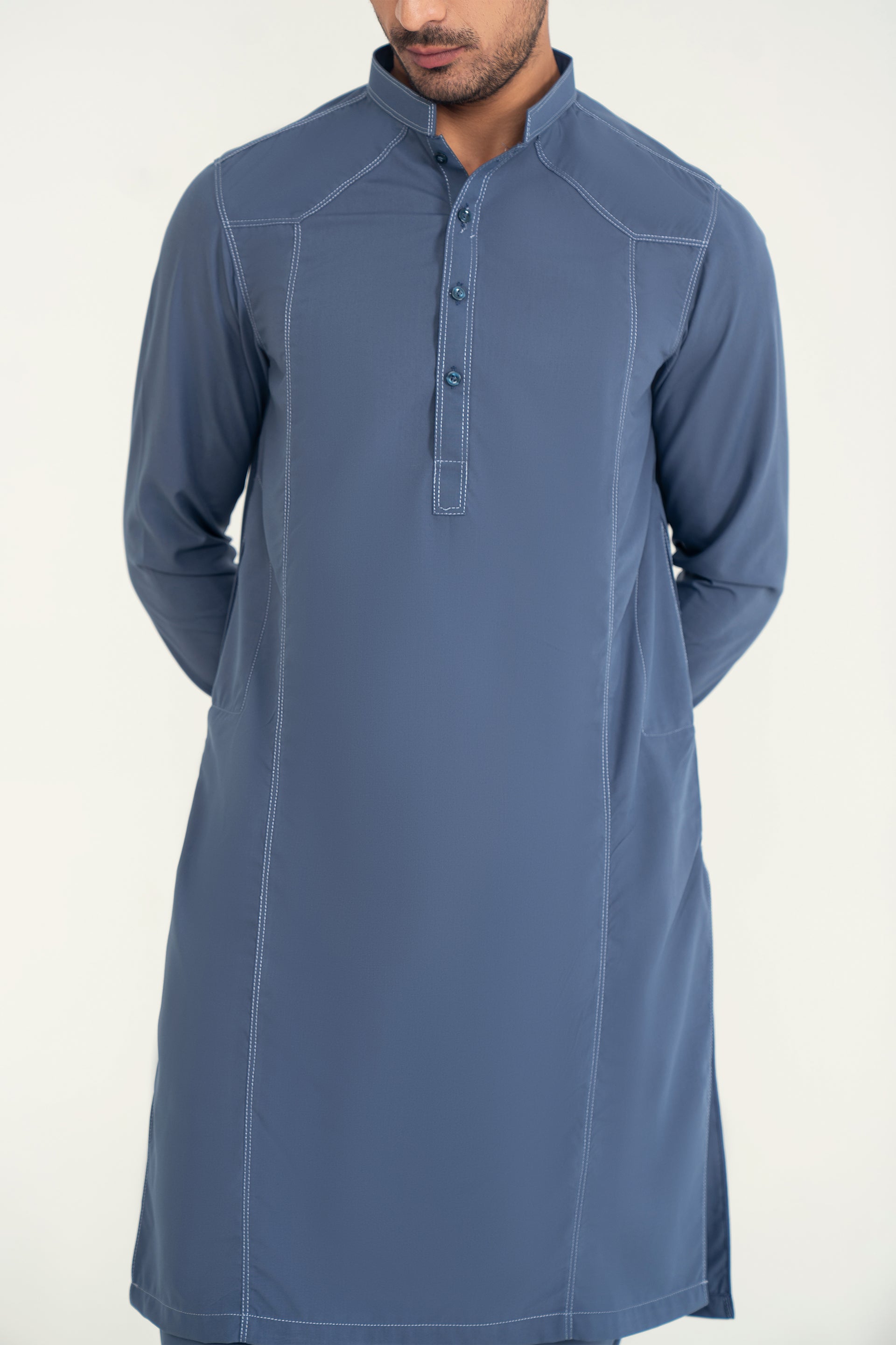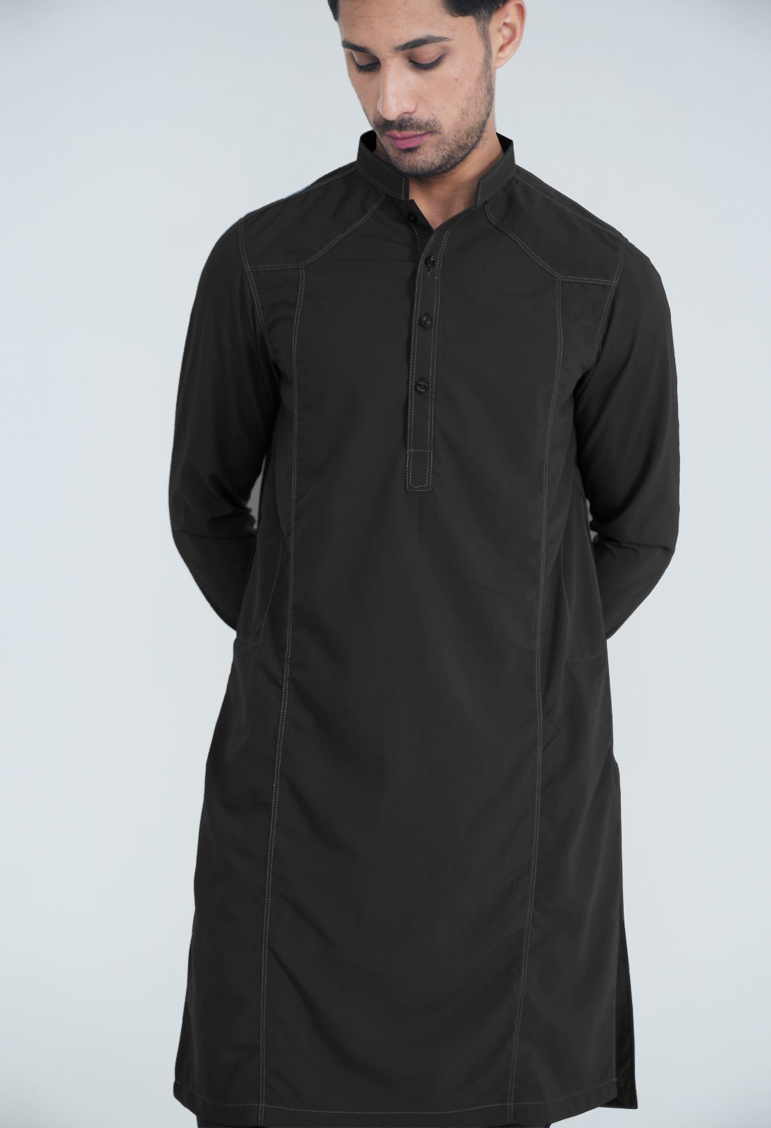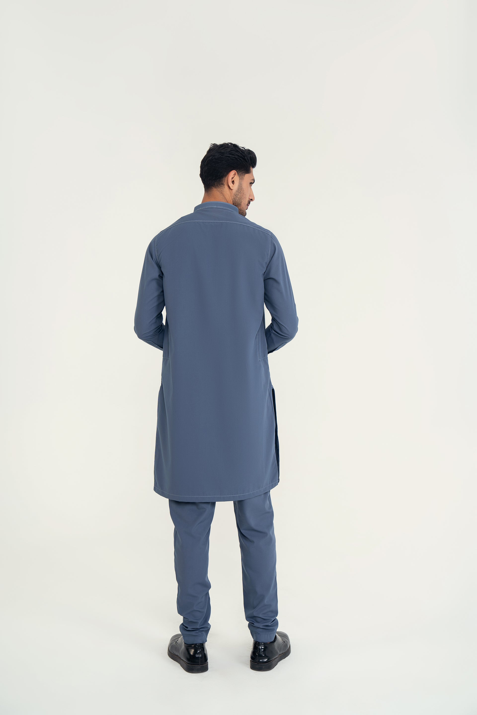 A sophisticated 2-piece kurta set featuring a mandarin ban, button placket, and subtle design lines on the front, paired with coordinating trousers for a polished blend of traditional style and modern elegance.