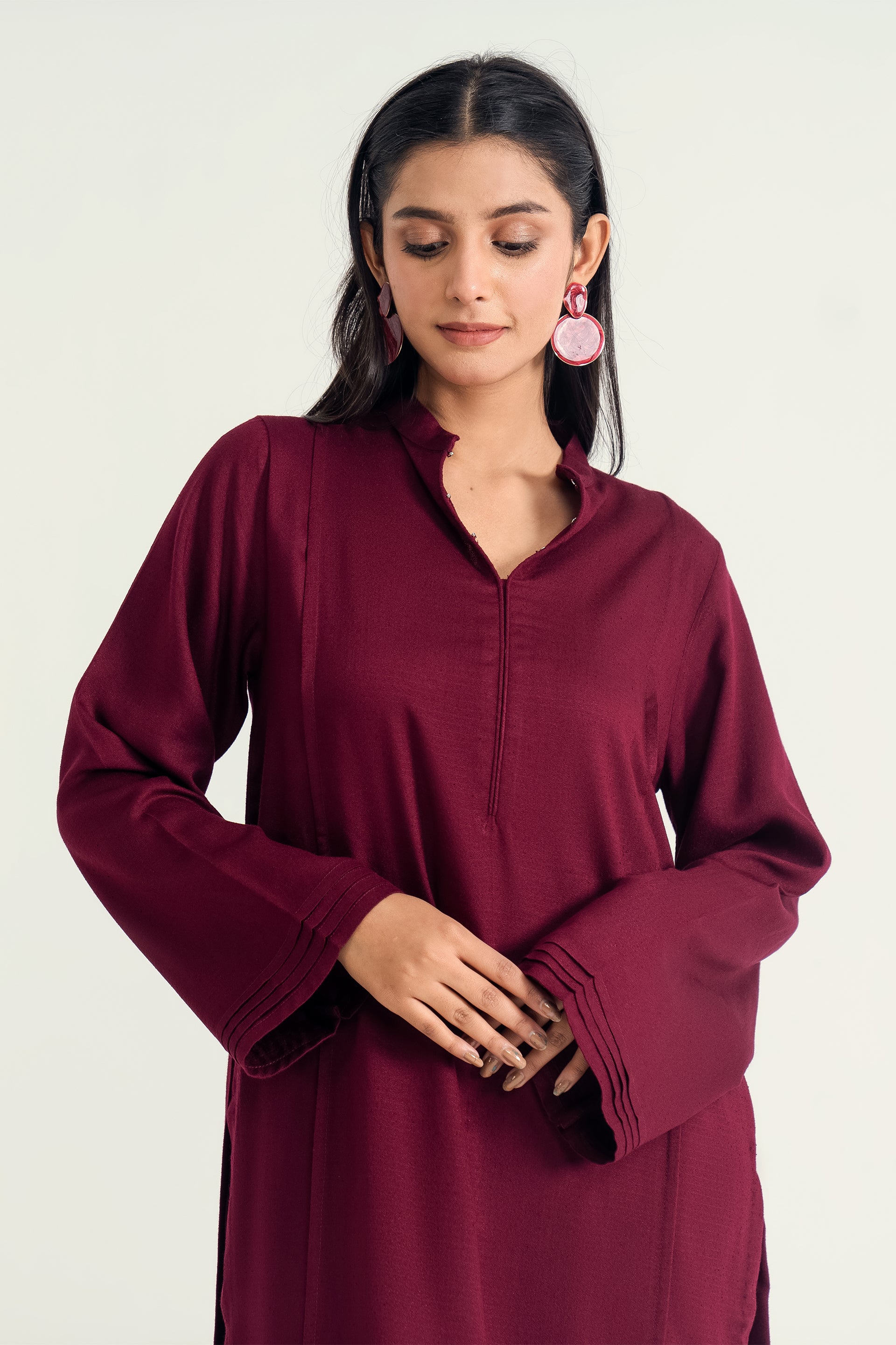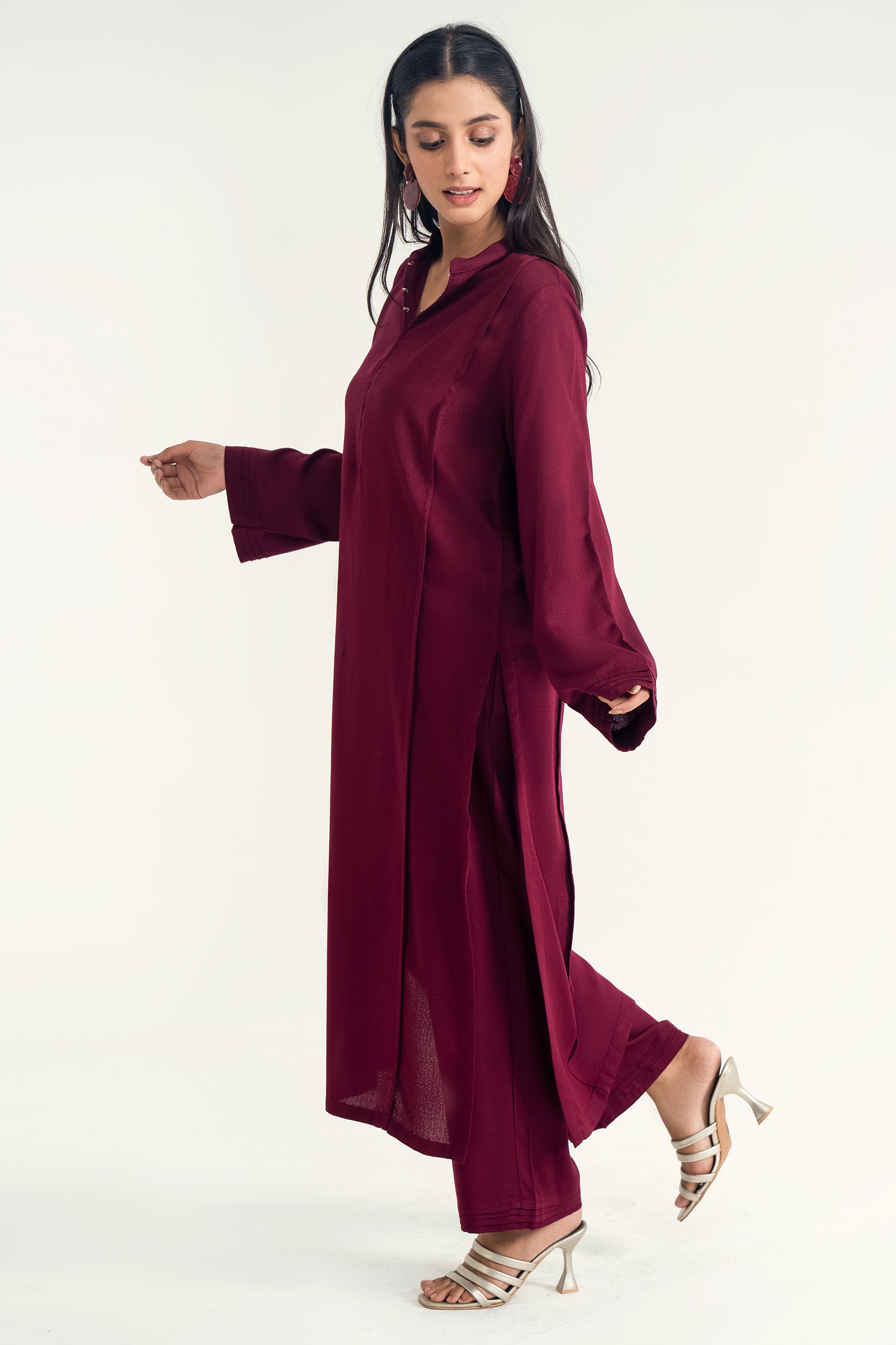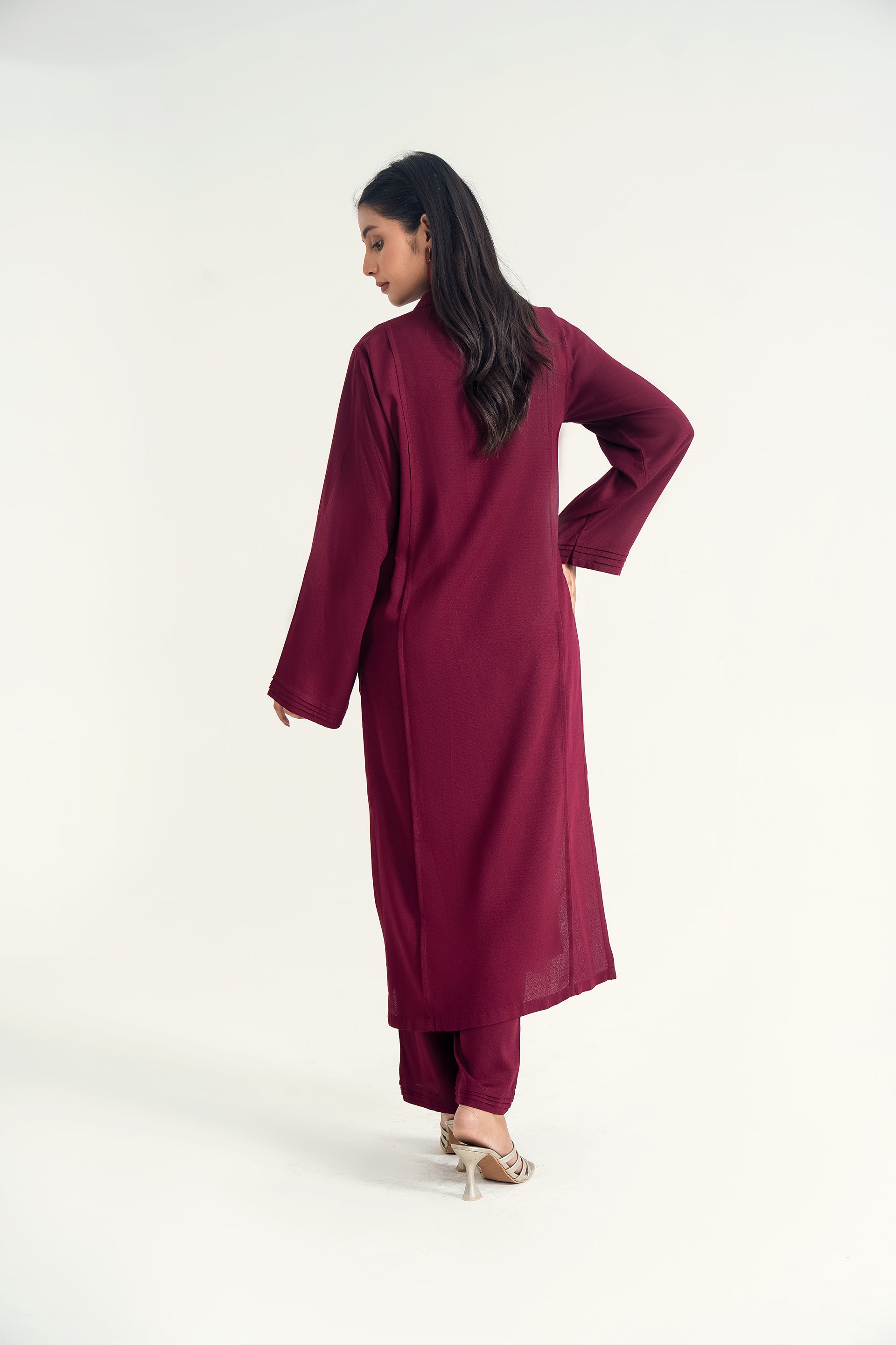 The Mandarin Collar Set in silk karandi features with fine pleats and a flowy, minimalist silhouette, paired with cigarette pants for a timeless blend of winter elegance and everyday versatility.