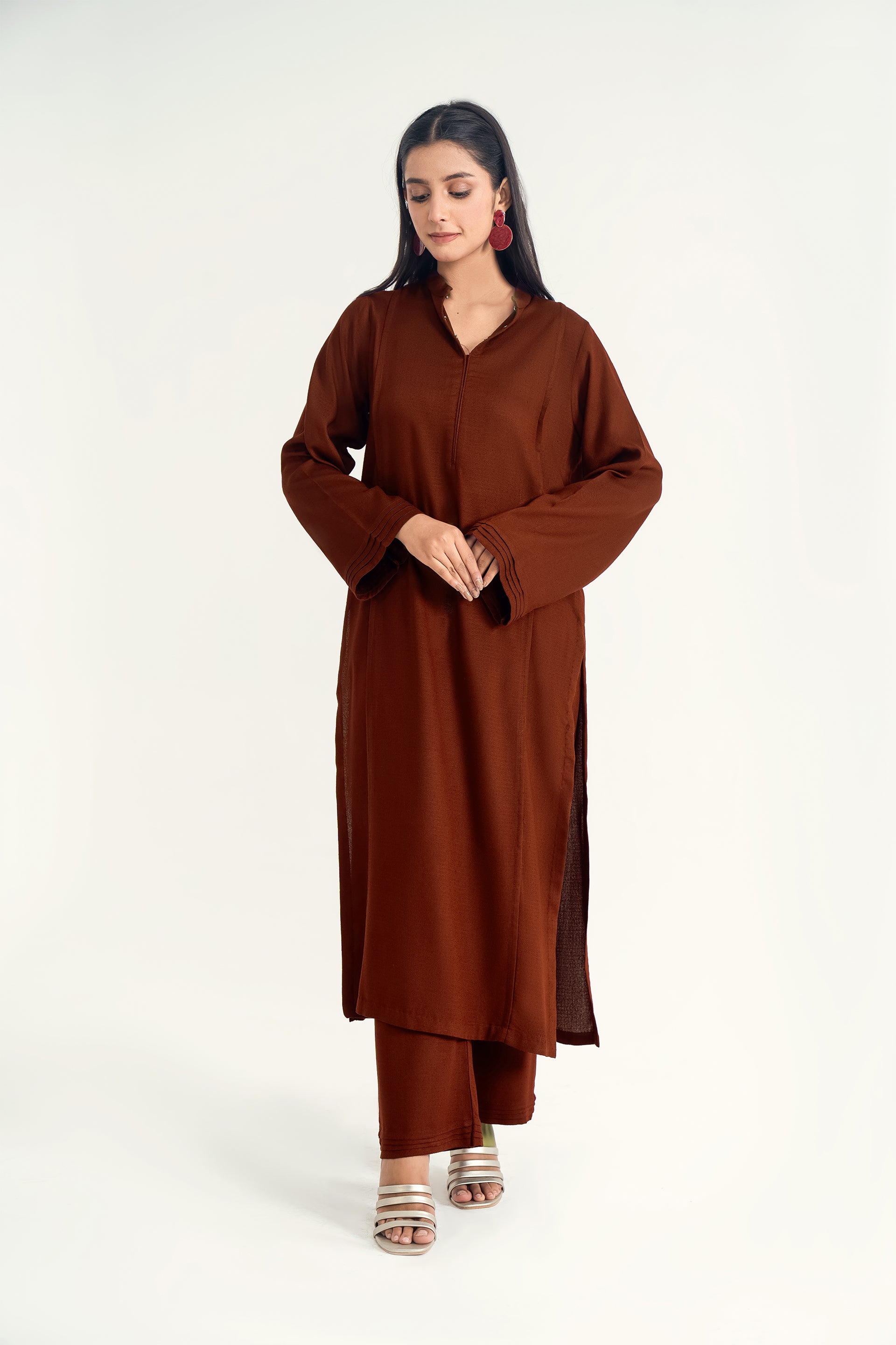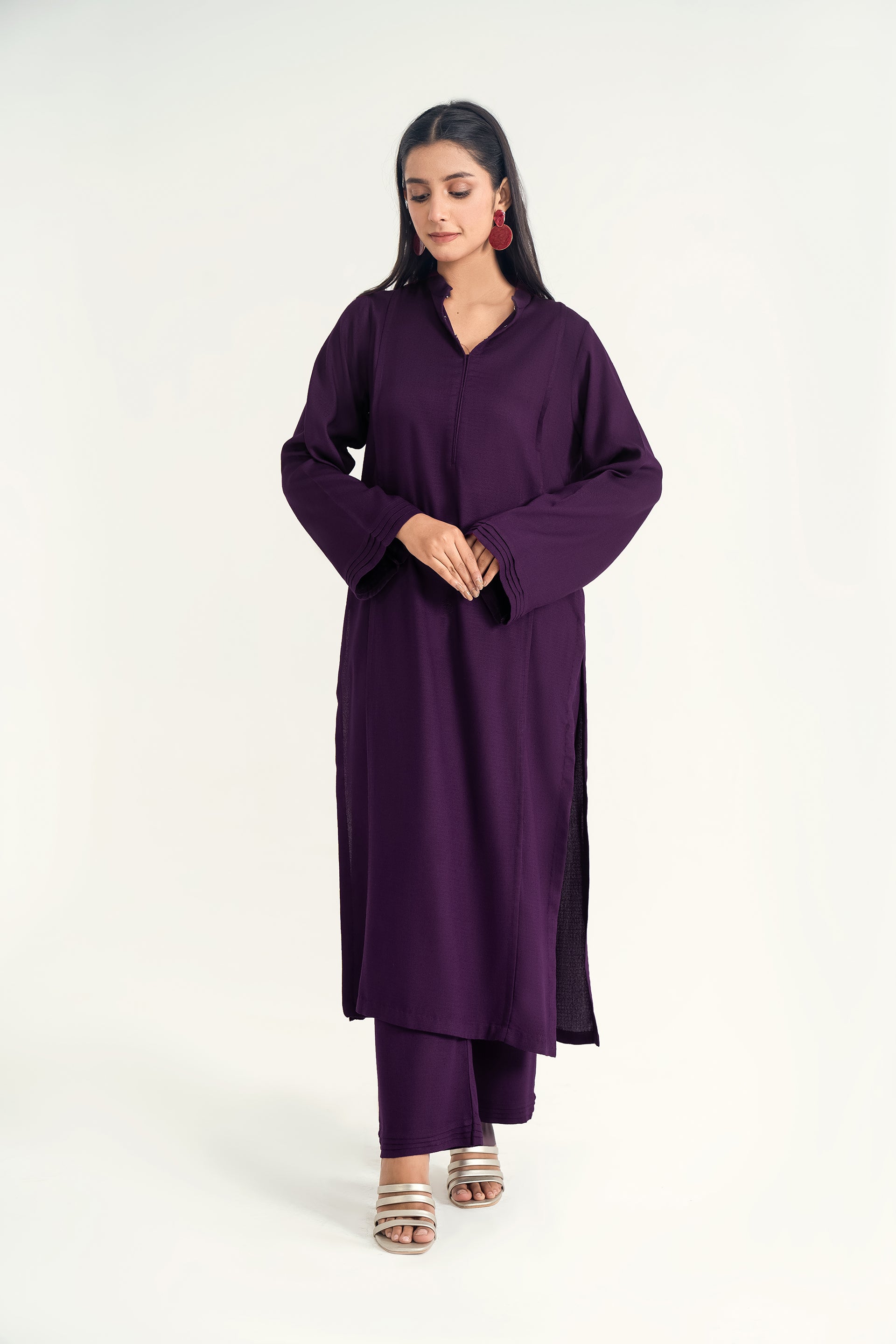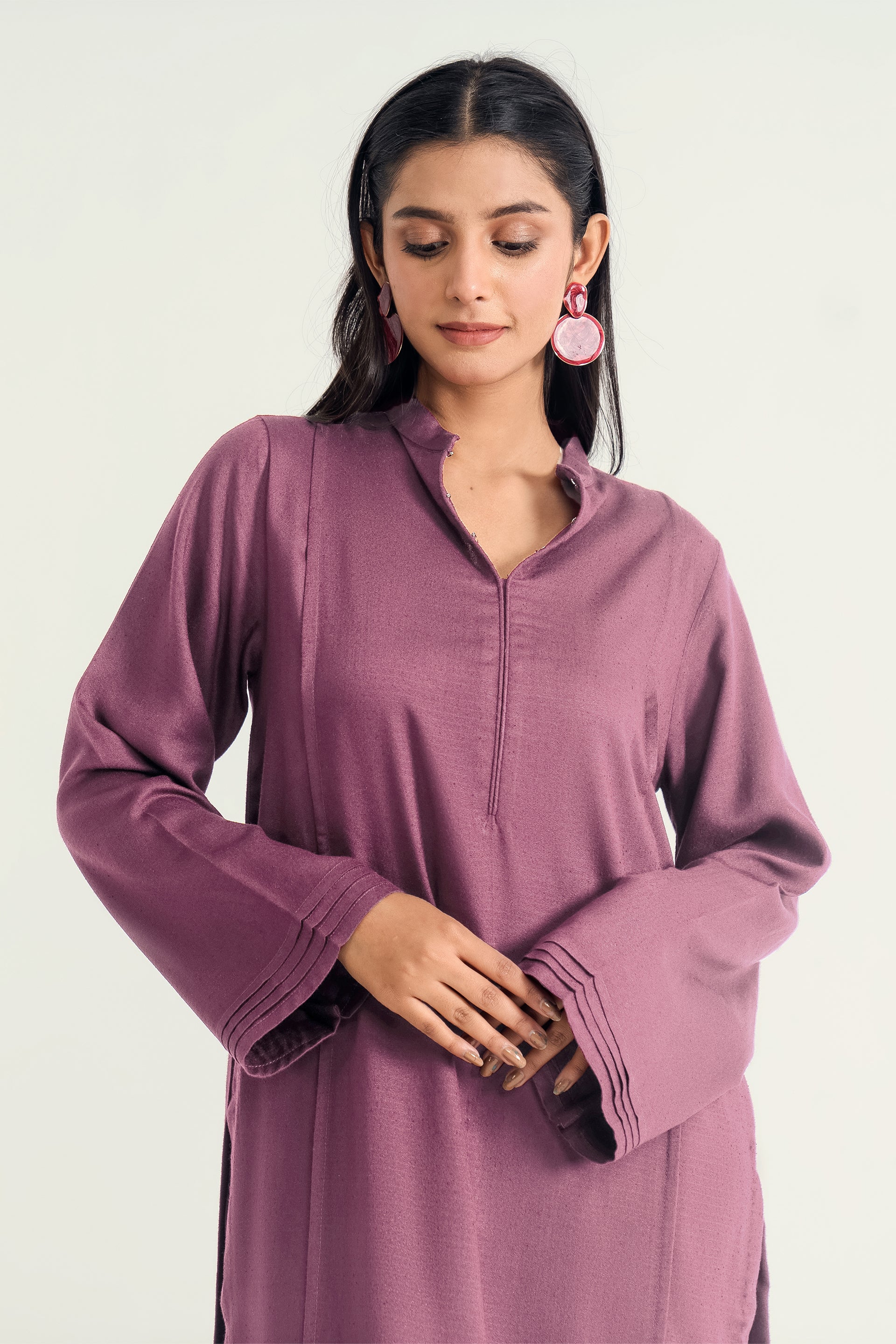 The Mandarin Collar Set in silk karandi features with fine pleats and a flowy, minimalist silhouette, paired with cigarette pants for a timeless blend of winter elegance and everyday versatility.