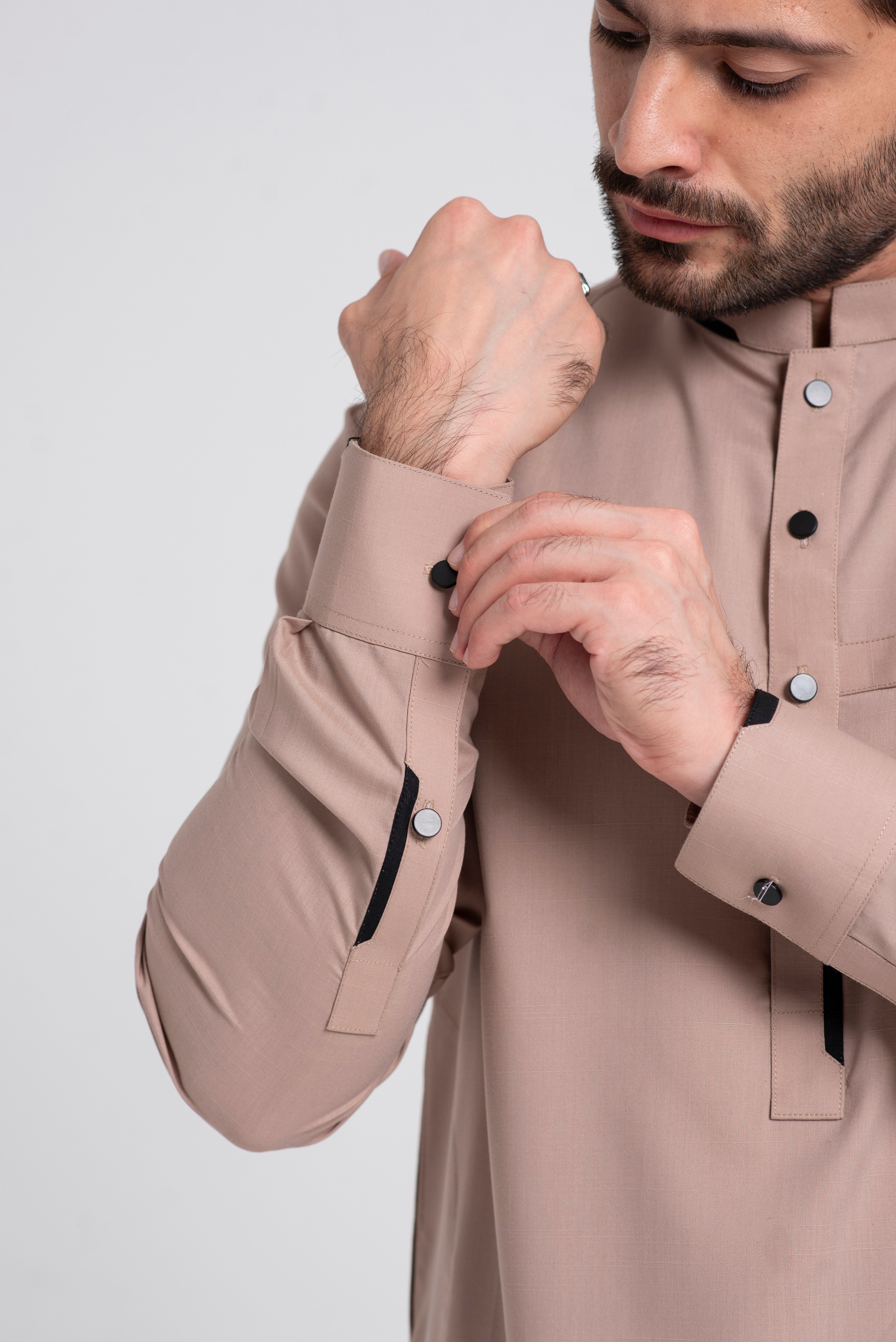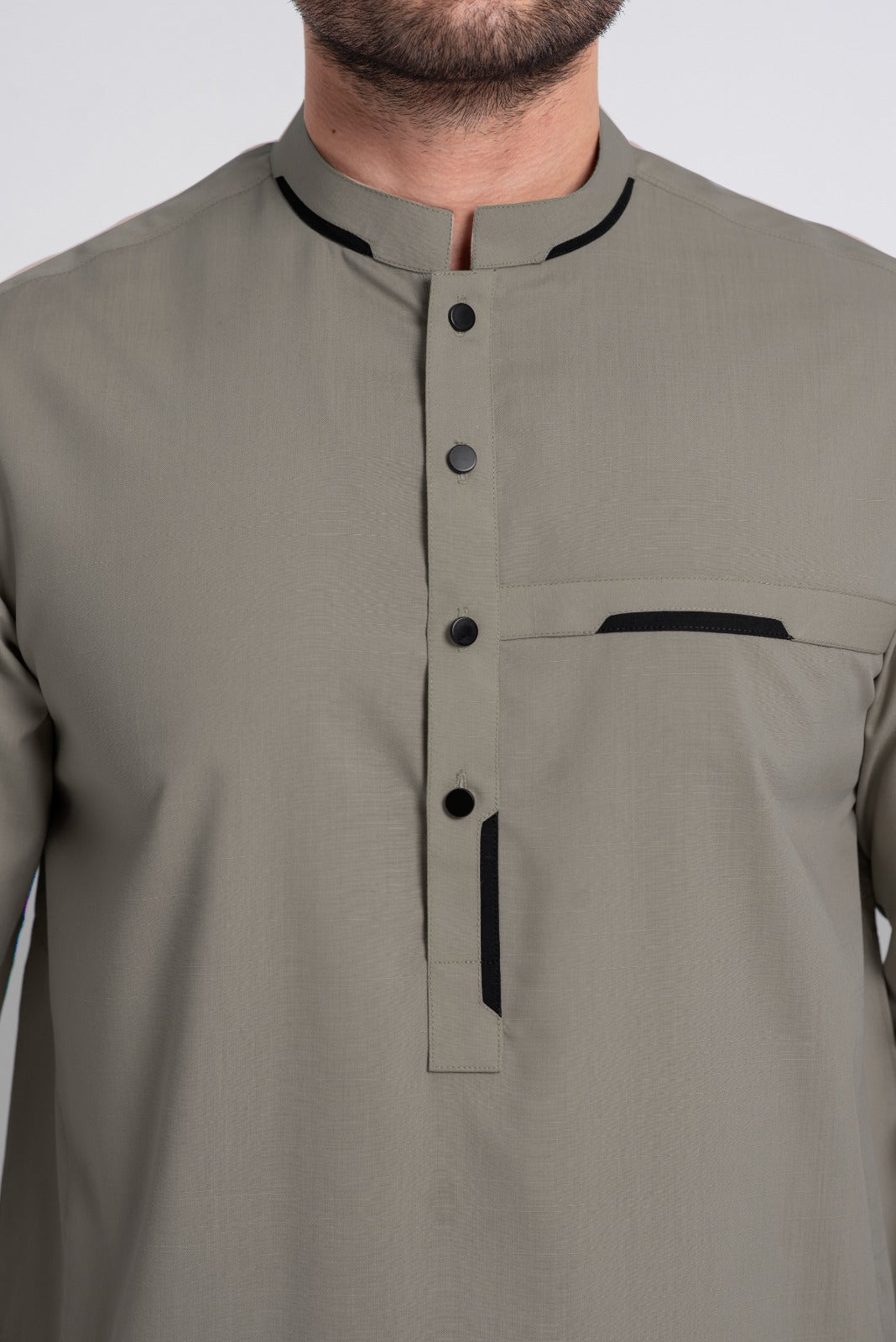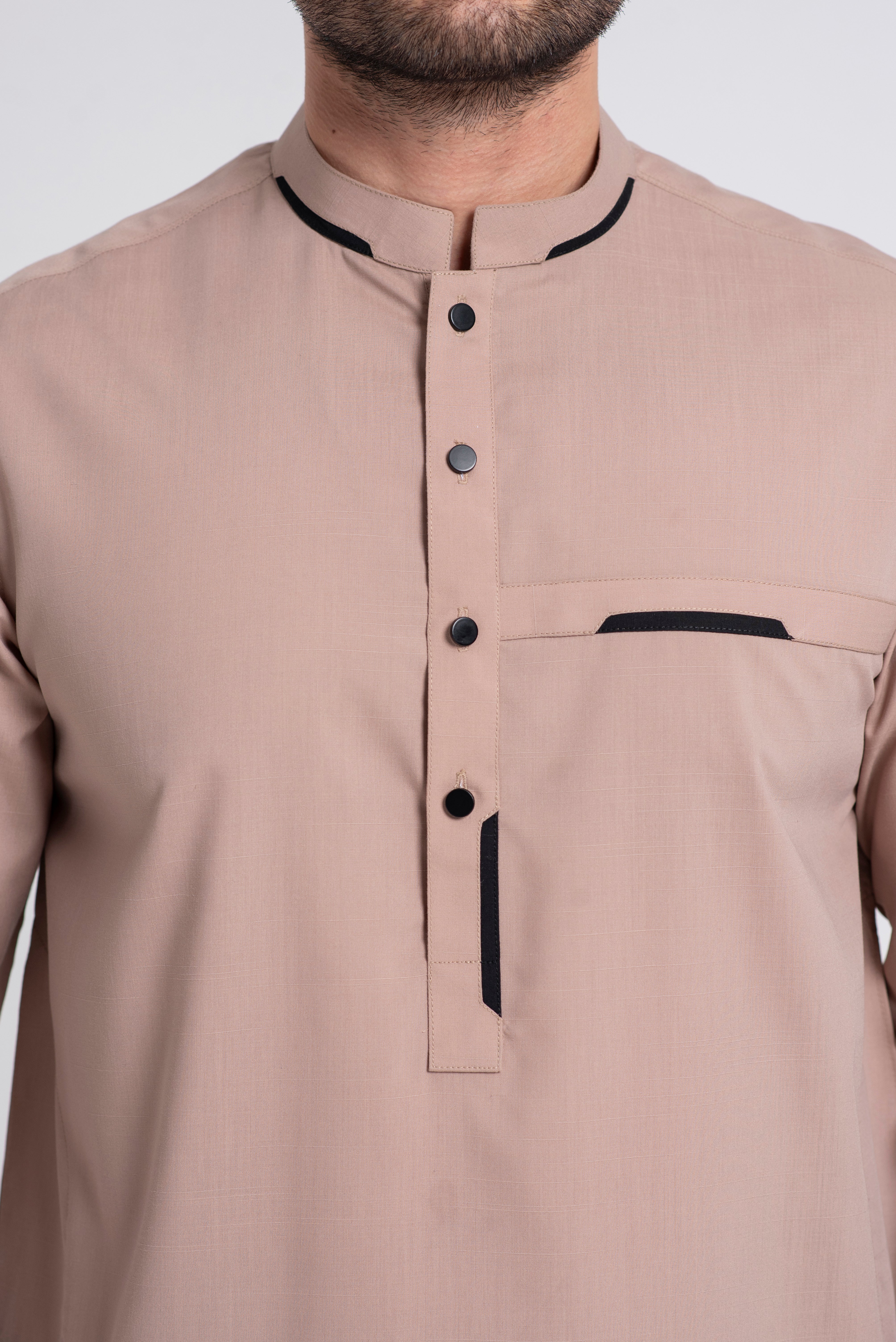 A stylish men’s kurta featuring a mandarin ban with contrasting black fabric, a buttoned placket, and a chest pocket accented with black detailing. Tailored in a straight fit, this design blends modern sophistication with traditional elegance.
