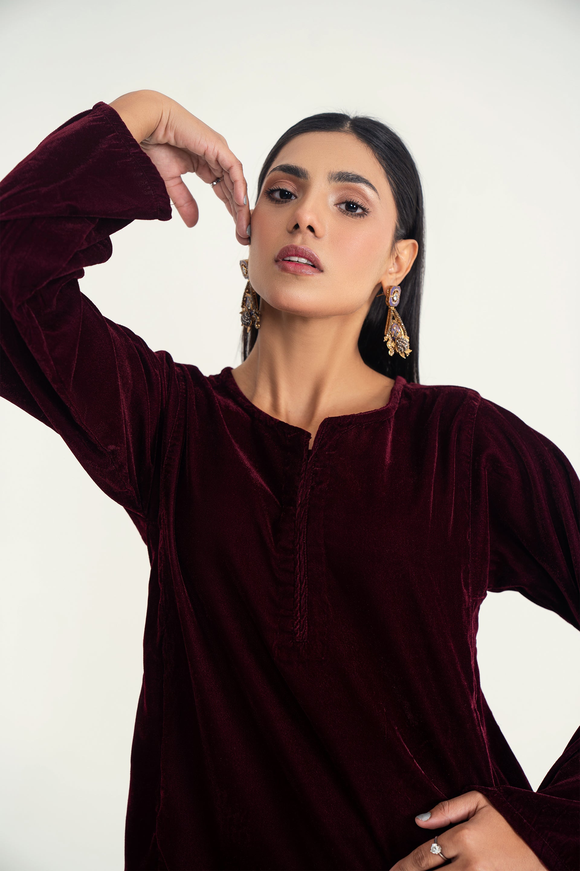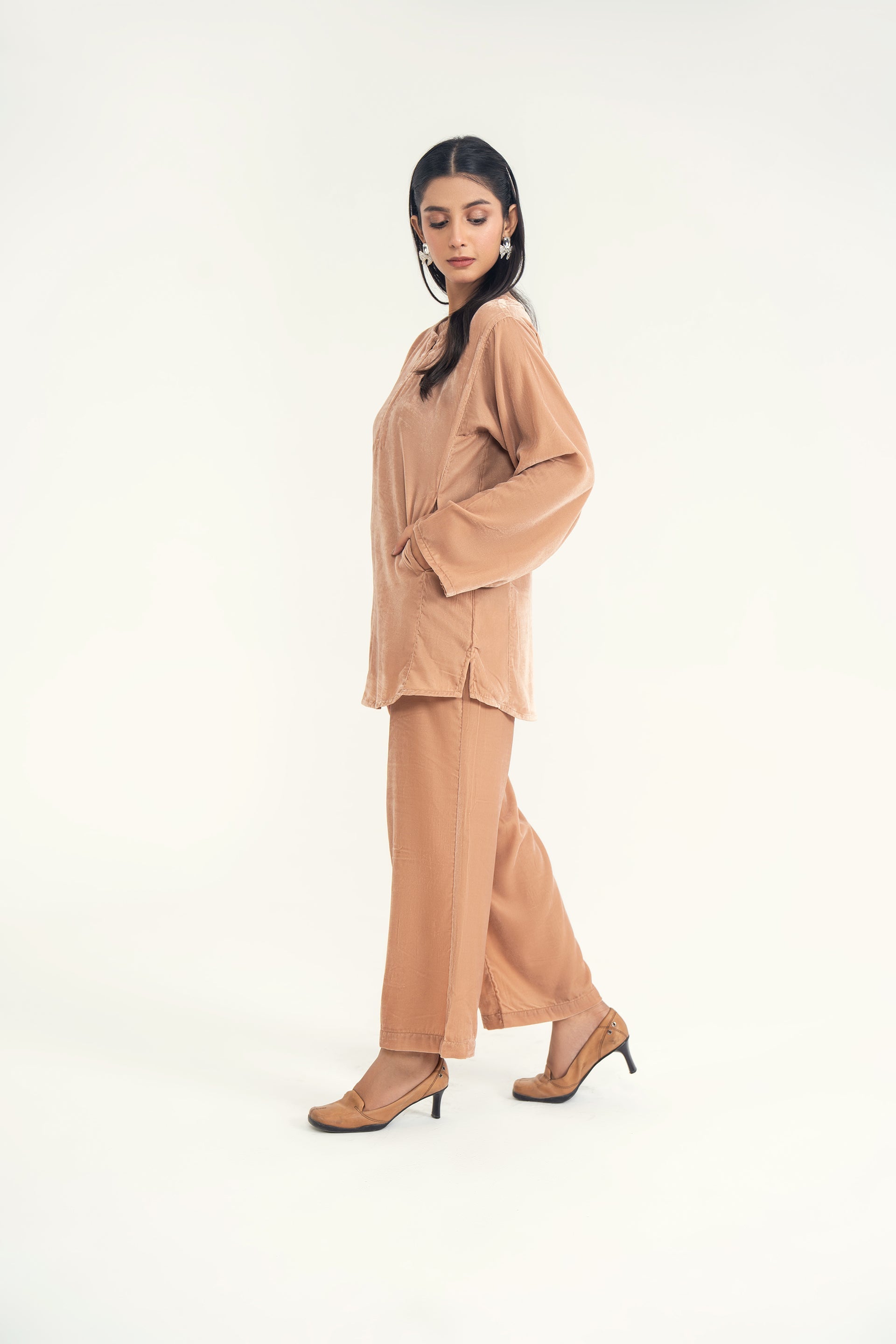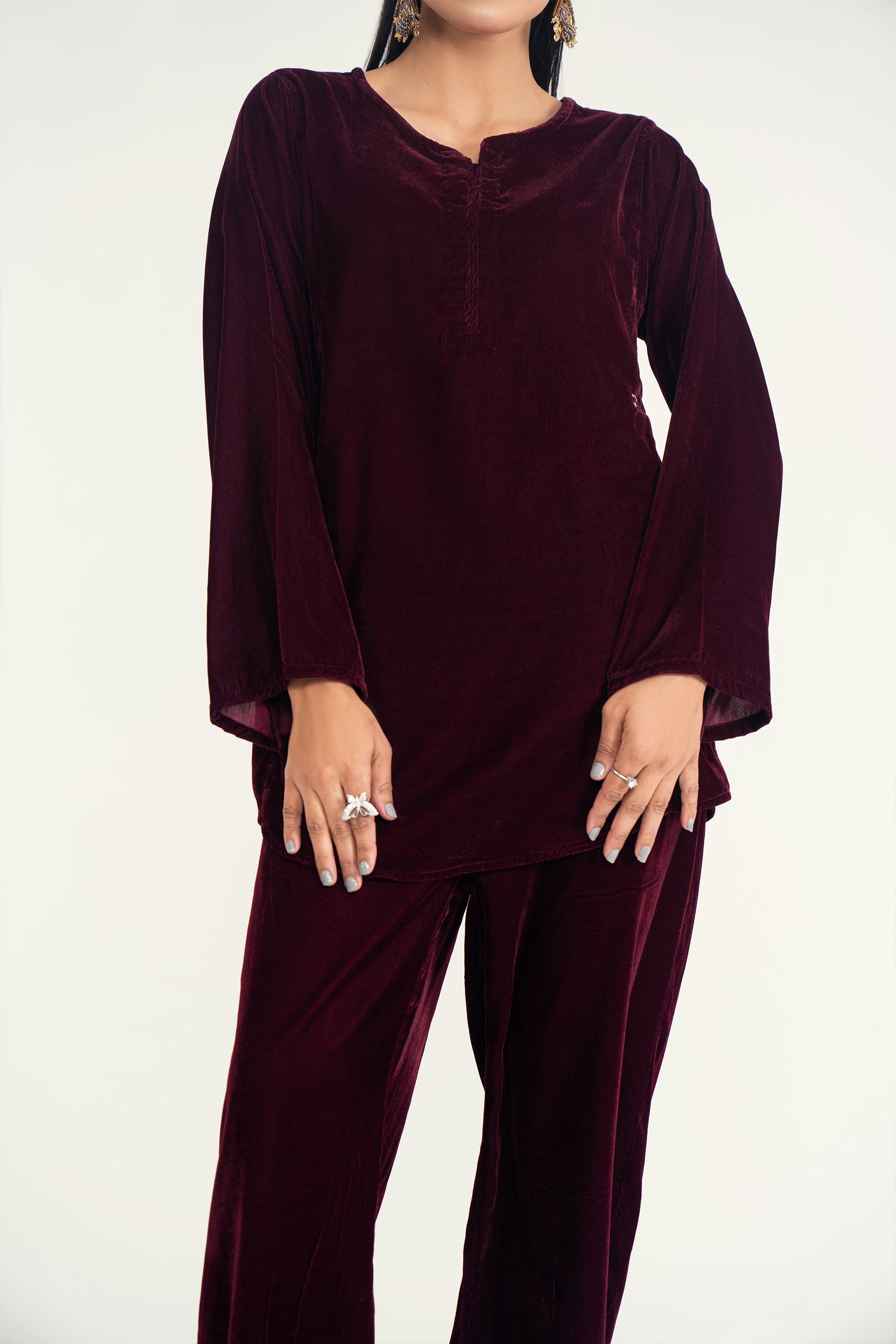 A premium velvet shirt featuring a round neckline with cording detail, sleek side panels with hidden pockets, and a short top paired with cropped flared pants.