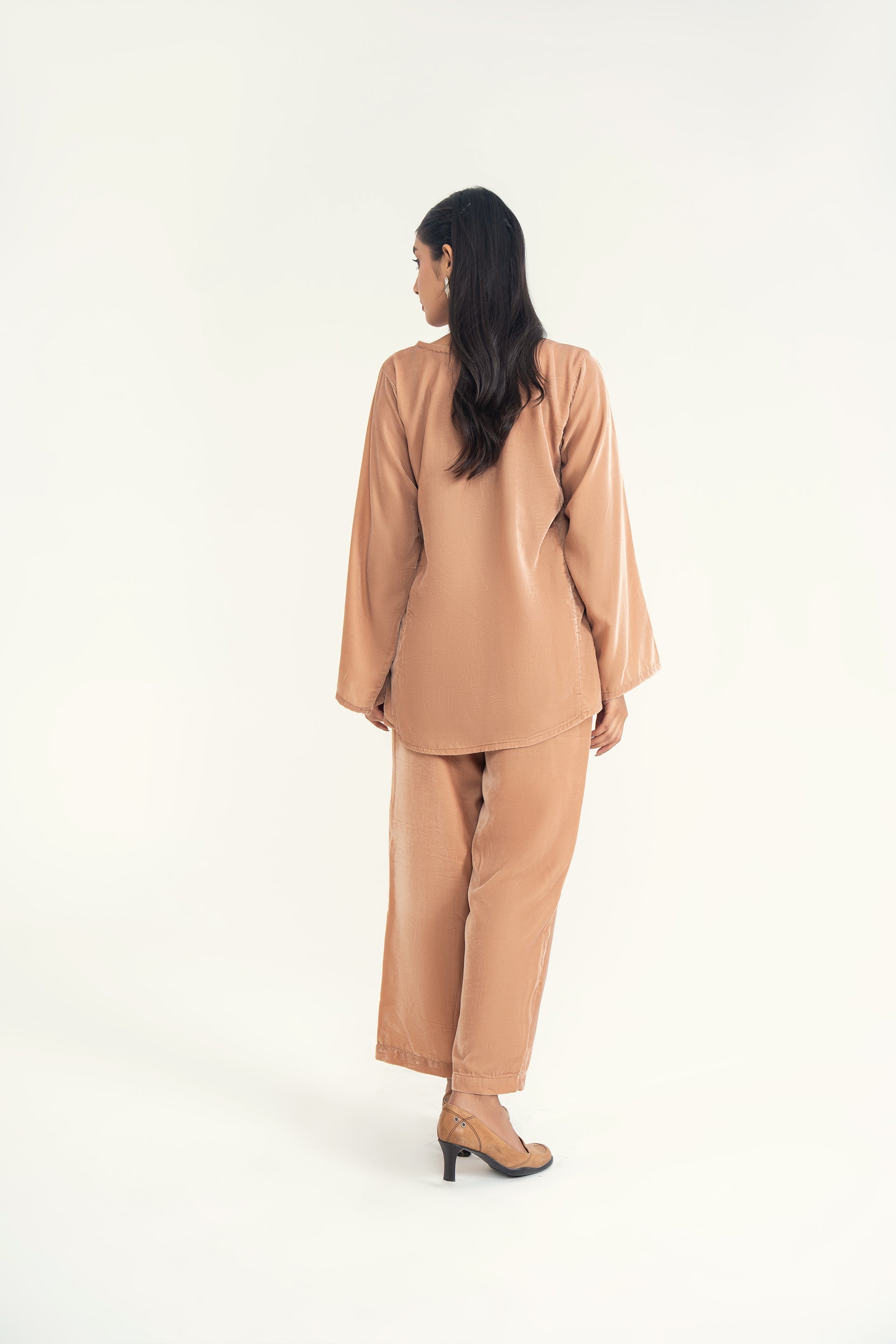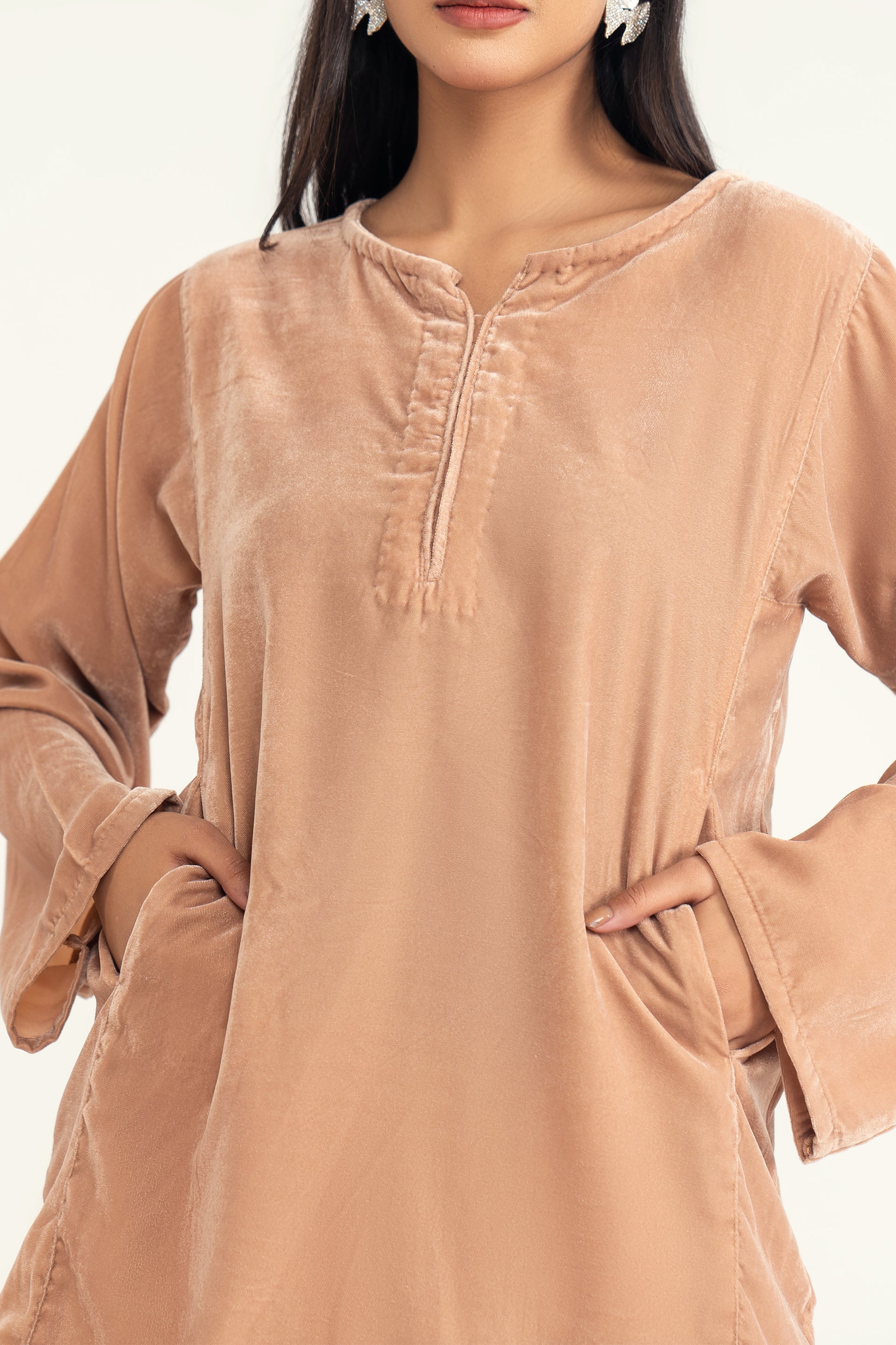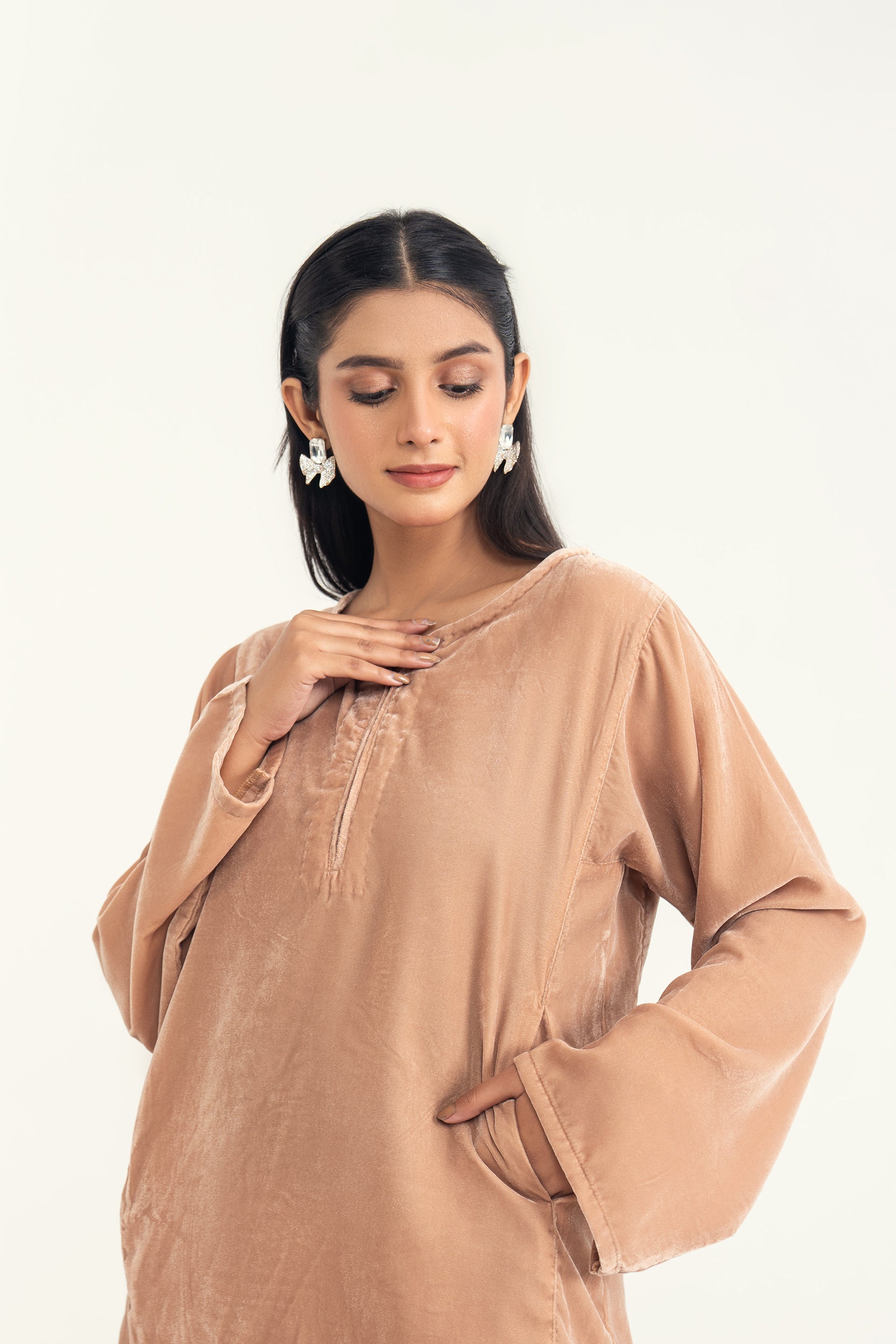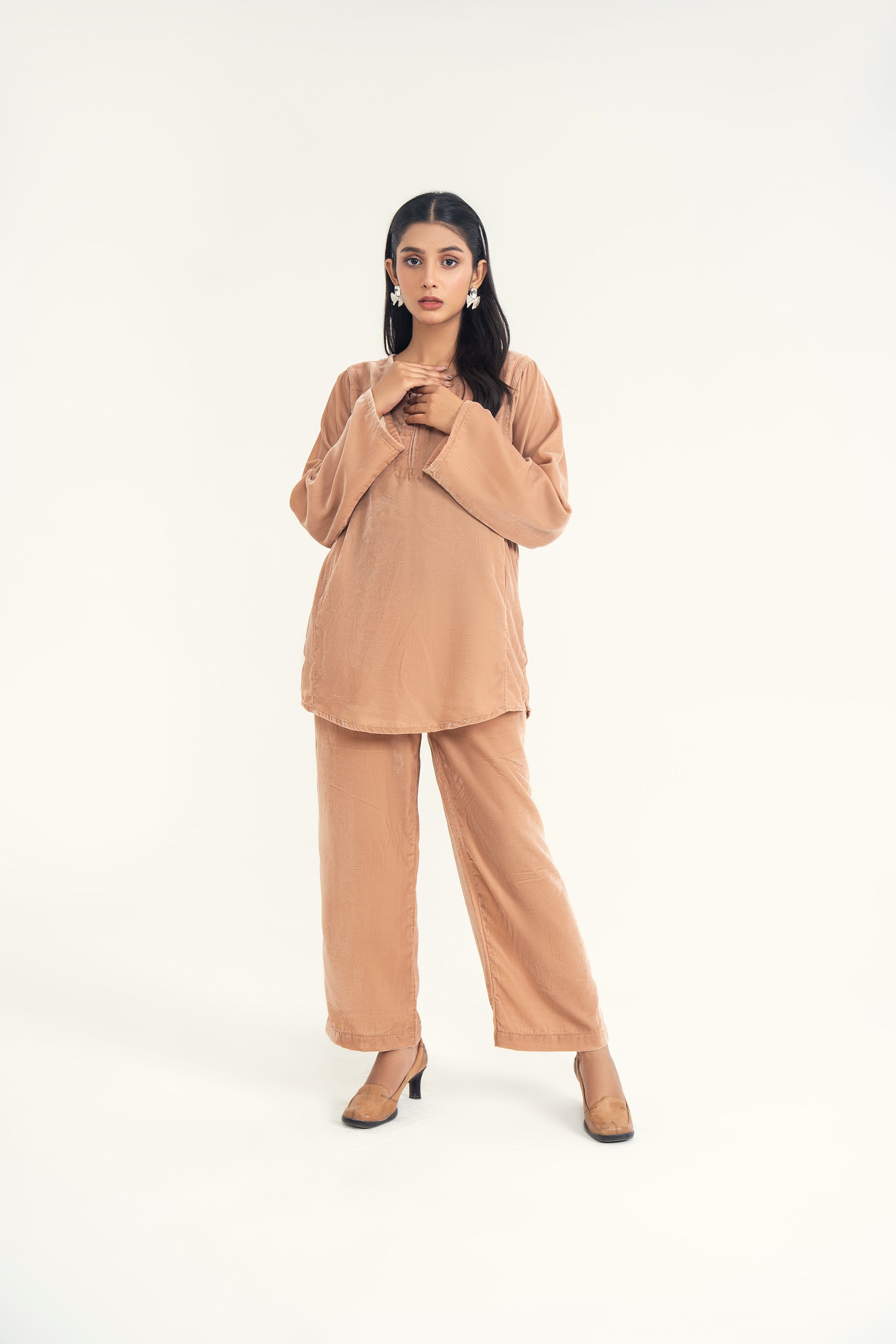 A premium velvet shirt featuring a round neckline with cording detail, sleek side panels with hidden pockets, and a short top paired with cropped flared pants.