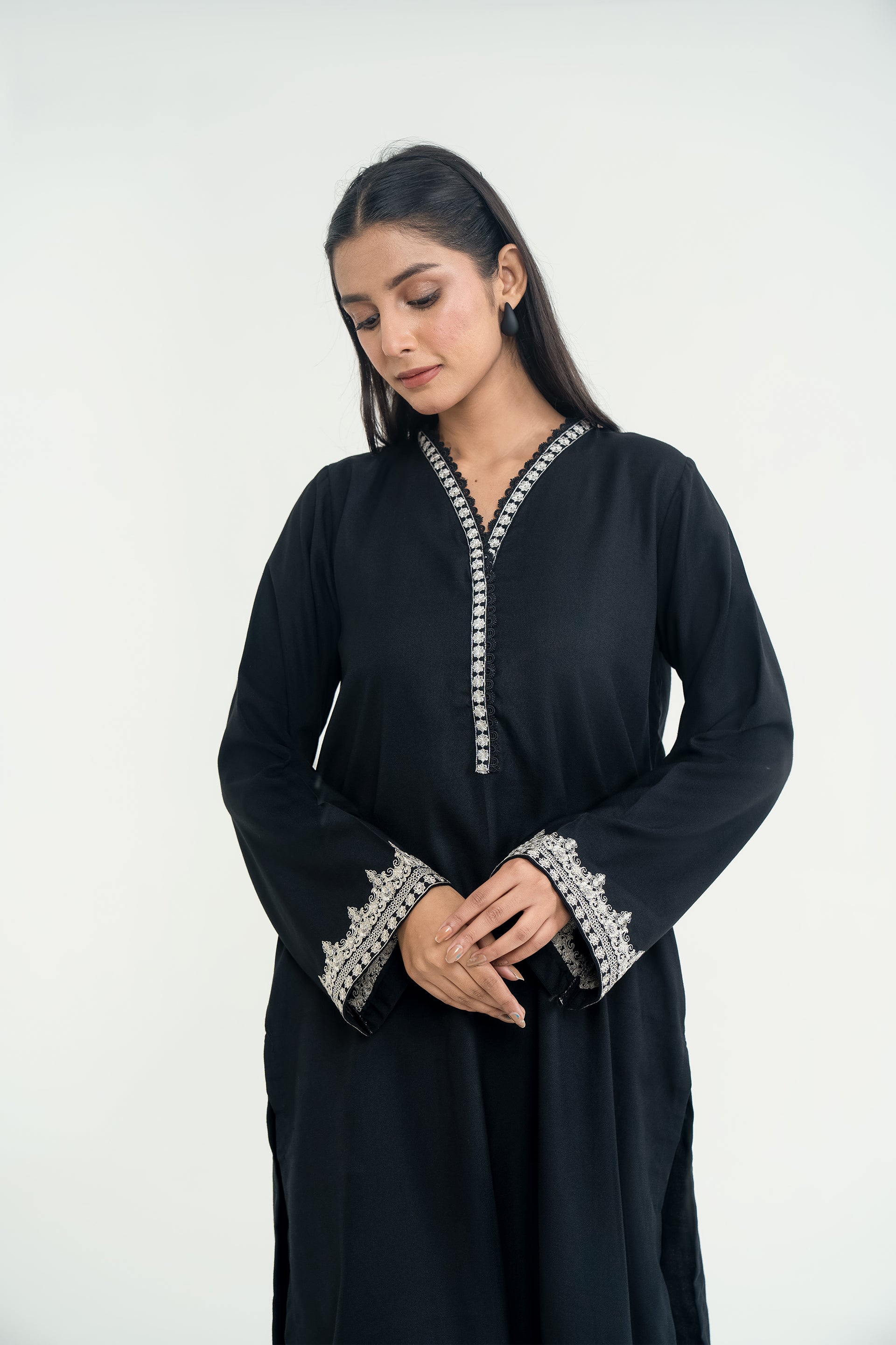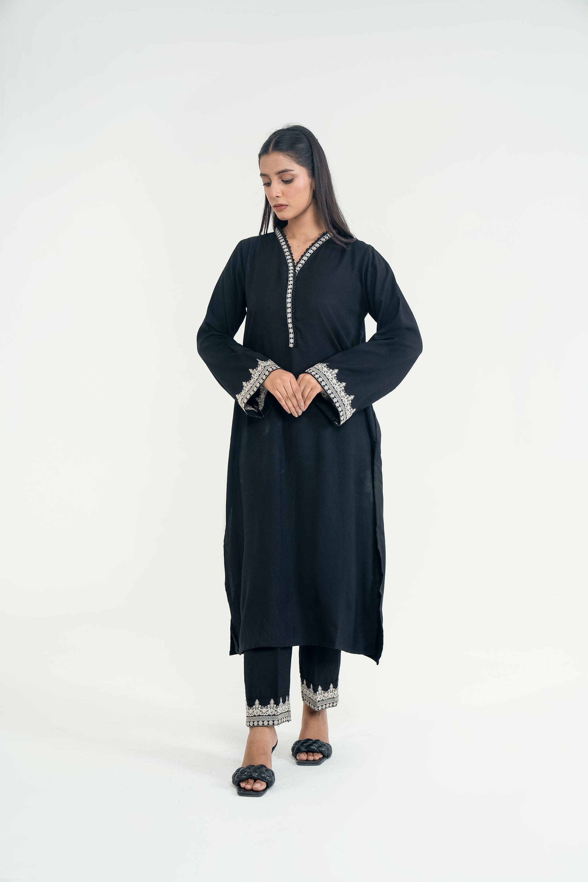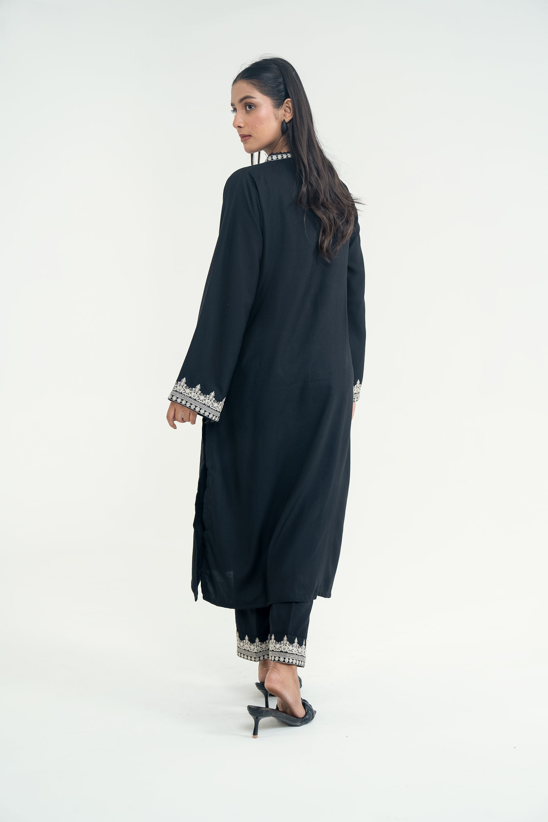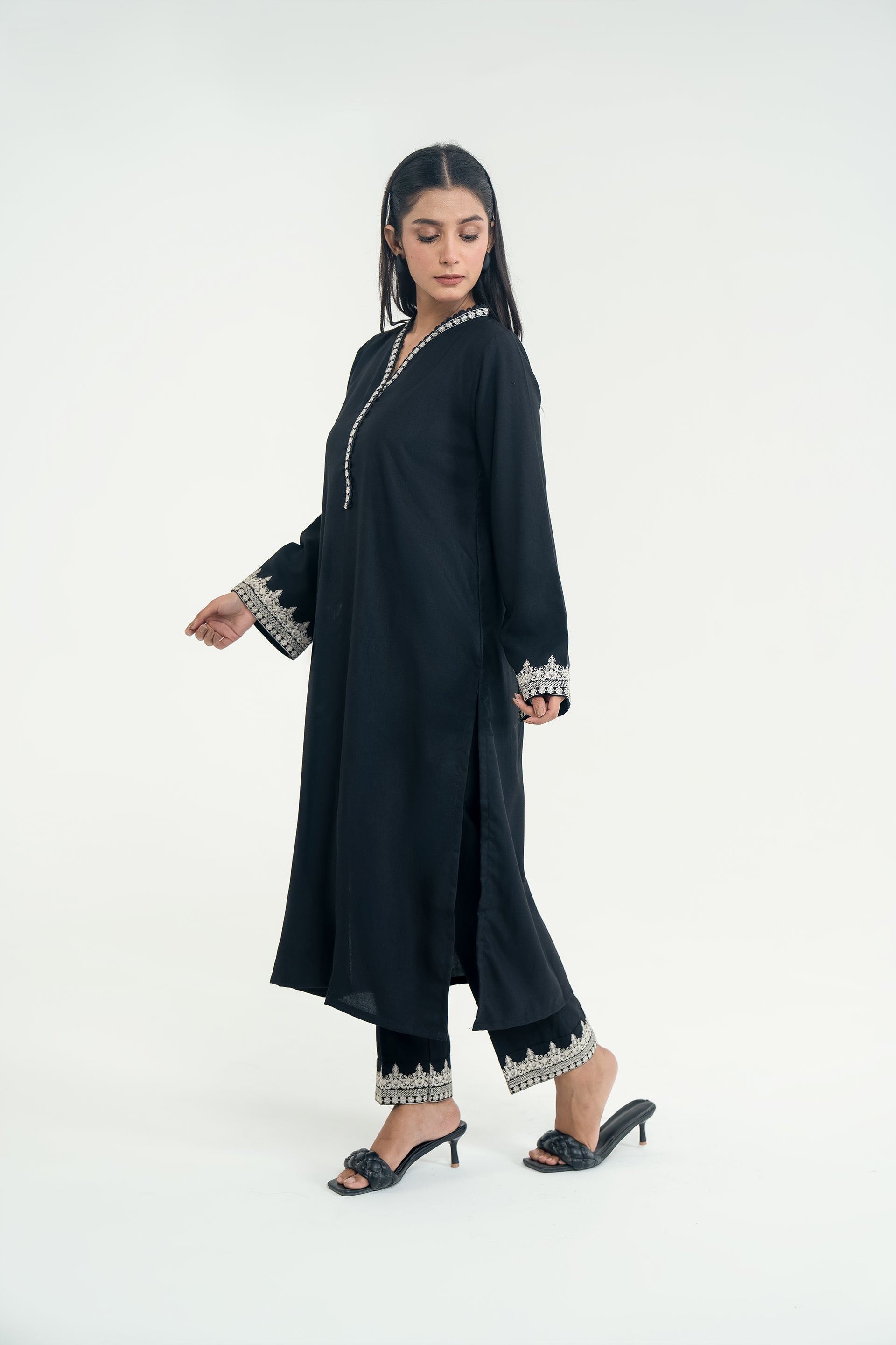 A jet-black Marina long shirt ensemble featuring white multi-head embroidery, a V-neckline with lace-detailed sleeves, and embroidered straight pants.