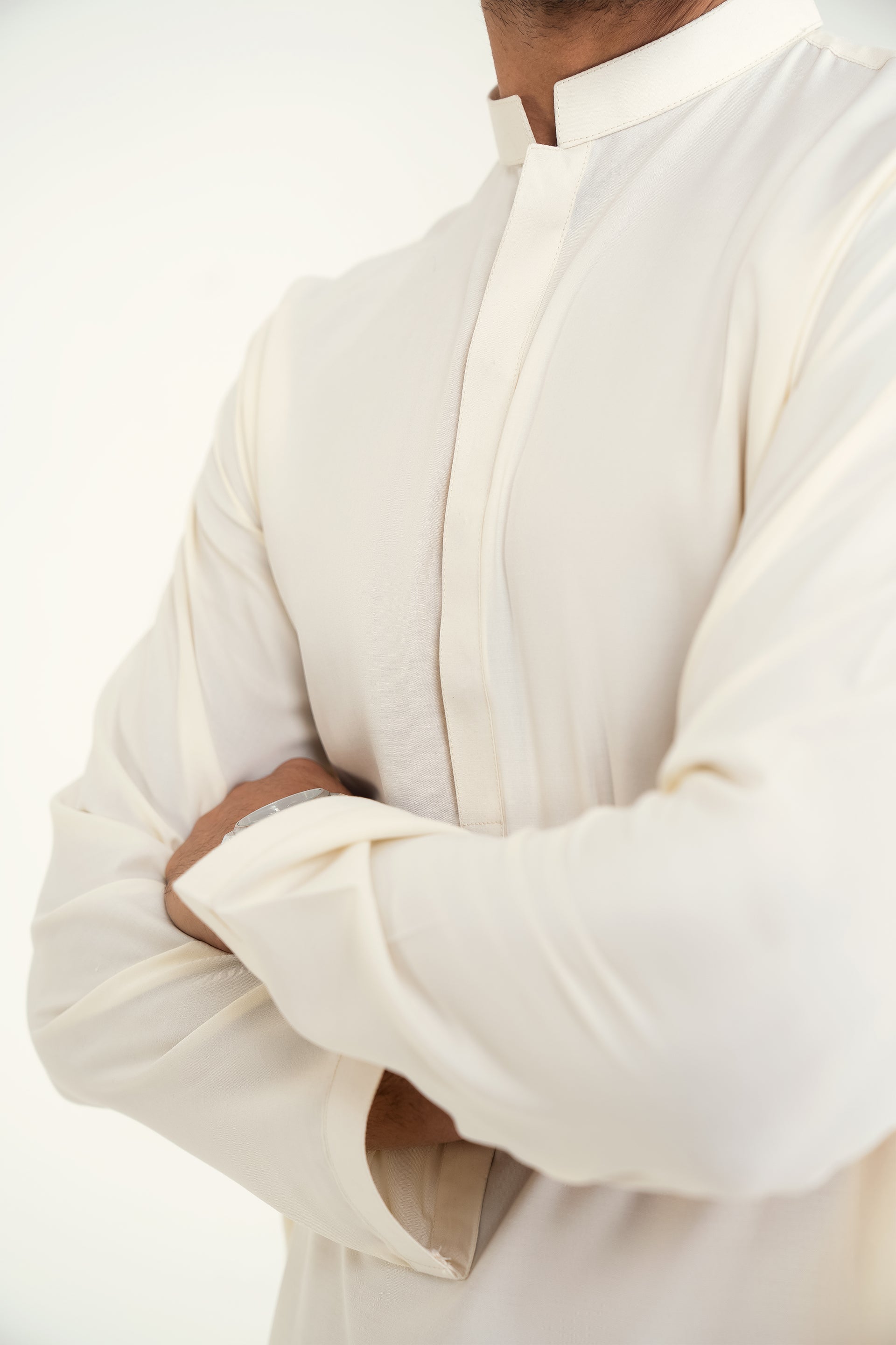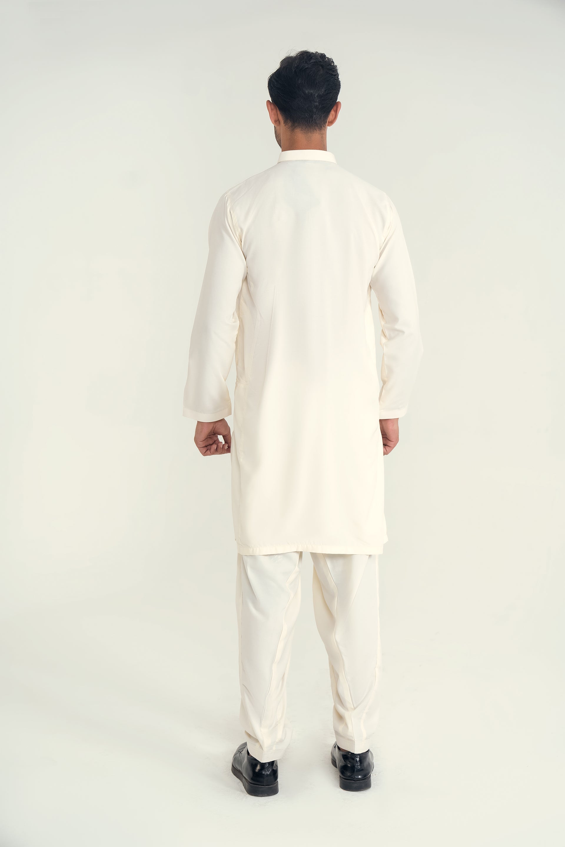 A modern men’s 2-piece shalwar kameez featuring a ban and hidden button placket, tailored in a straight relaxed fit for comfort and ease, while offering a sleek and sophisticated look.