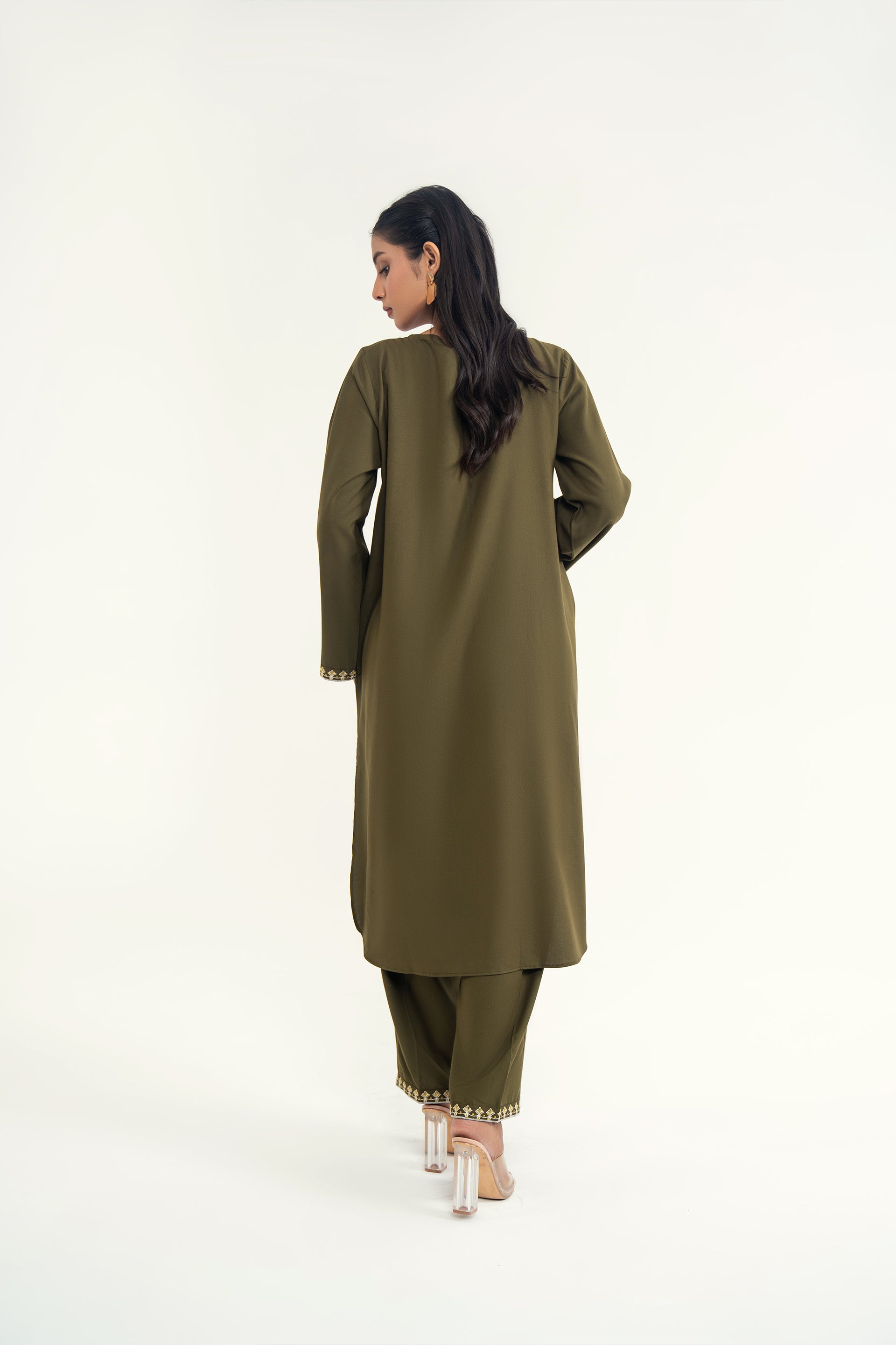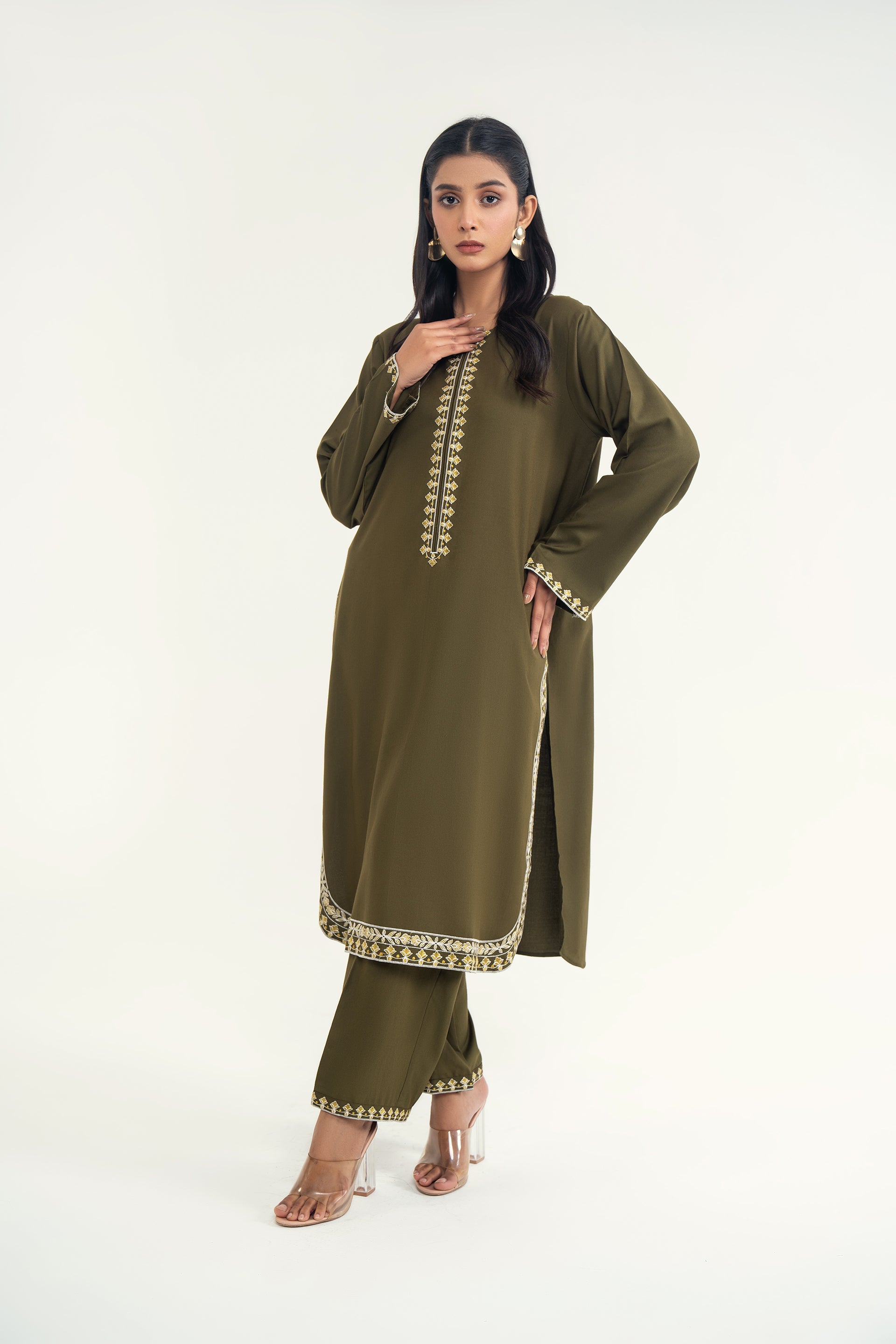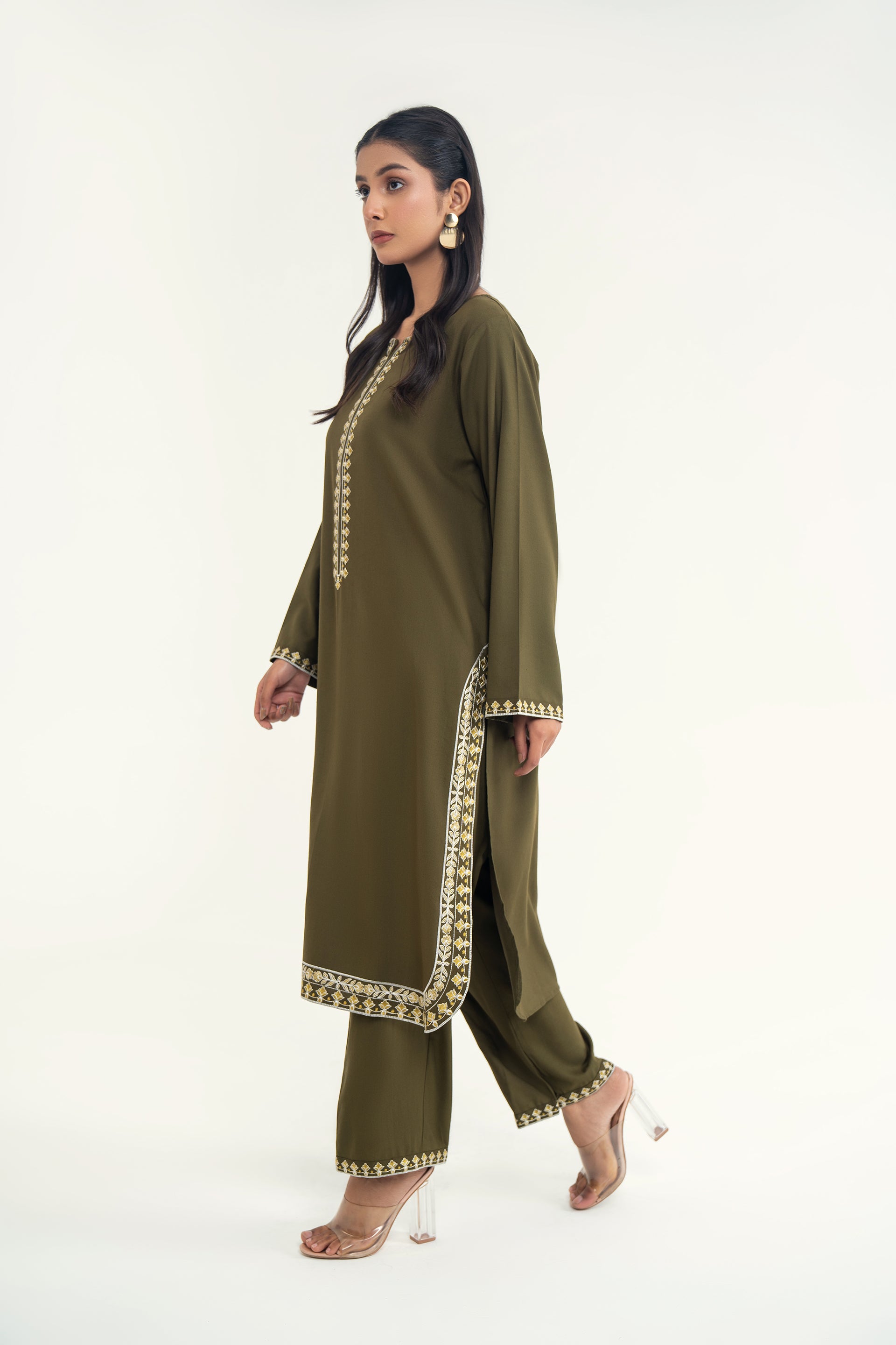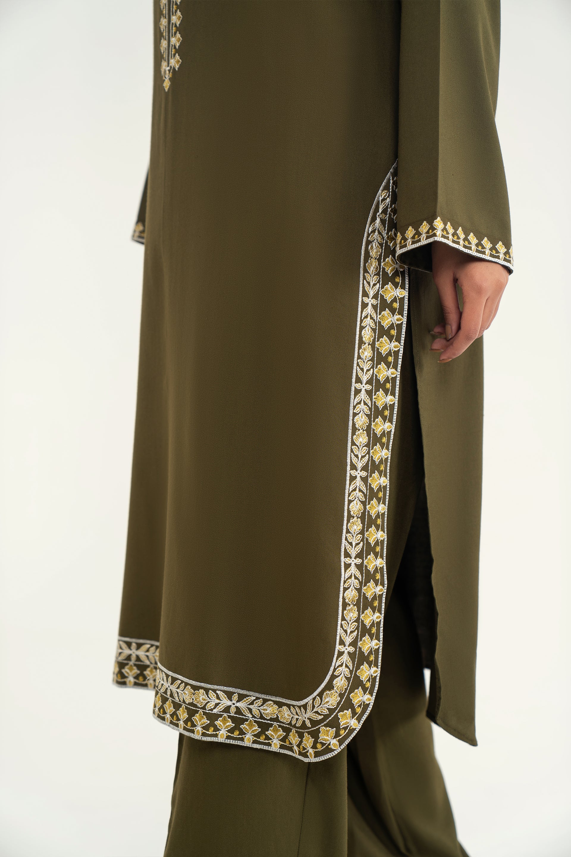 An olive green Marina olivia ensemble with green and white embroidery on the neckline, sleeves, and hem, paired with embroidered straight pants for a refined and cozy winter look.