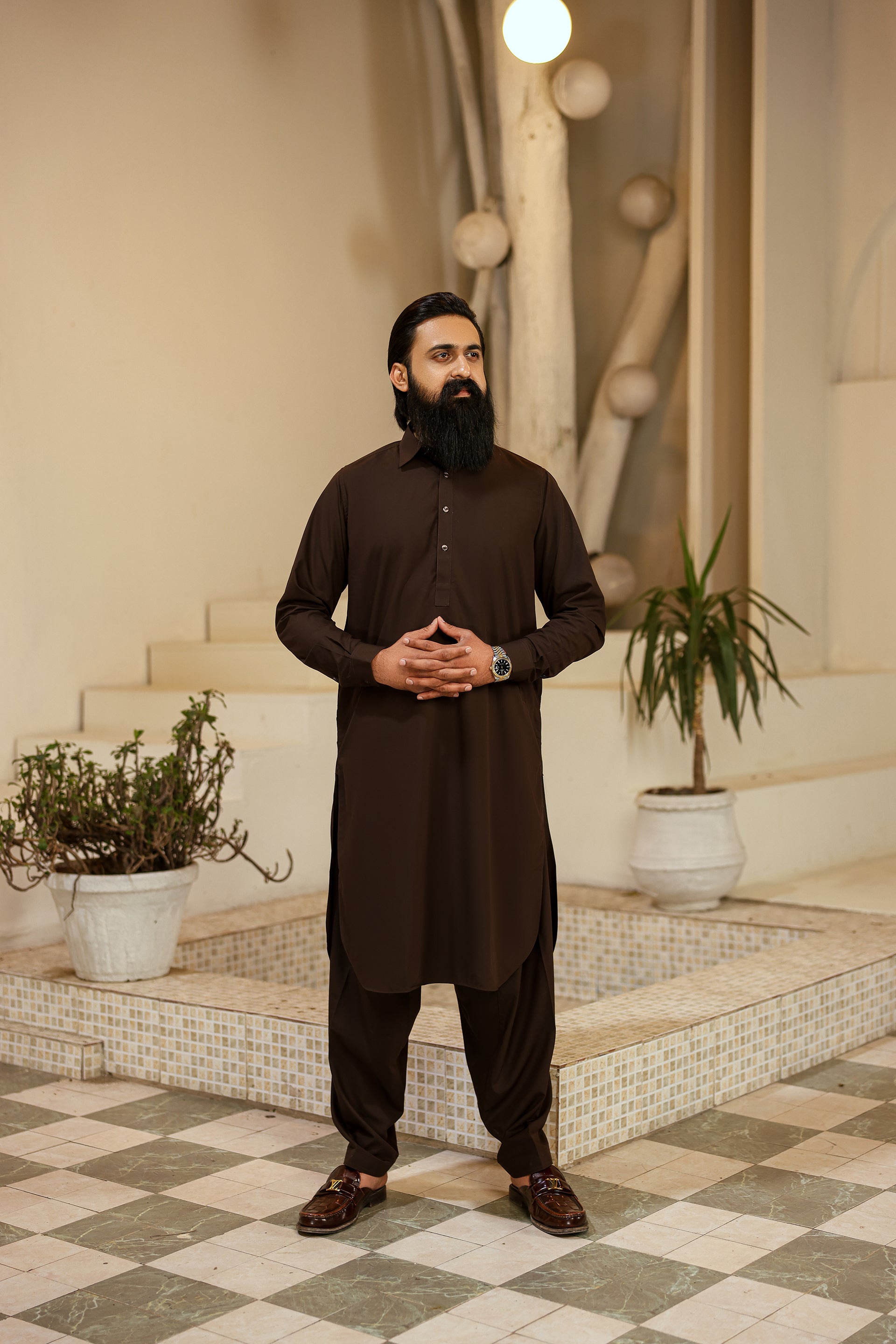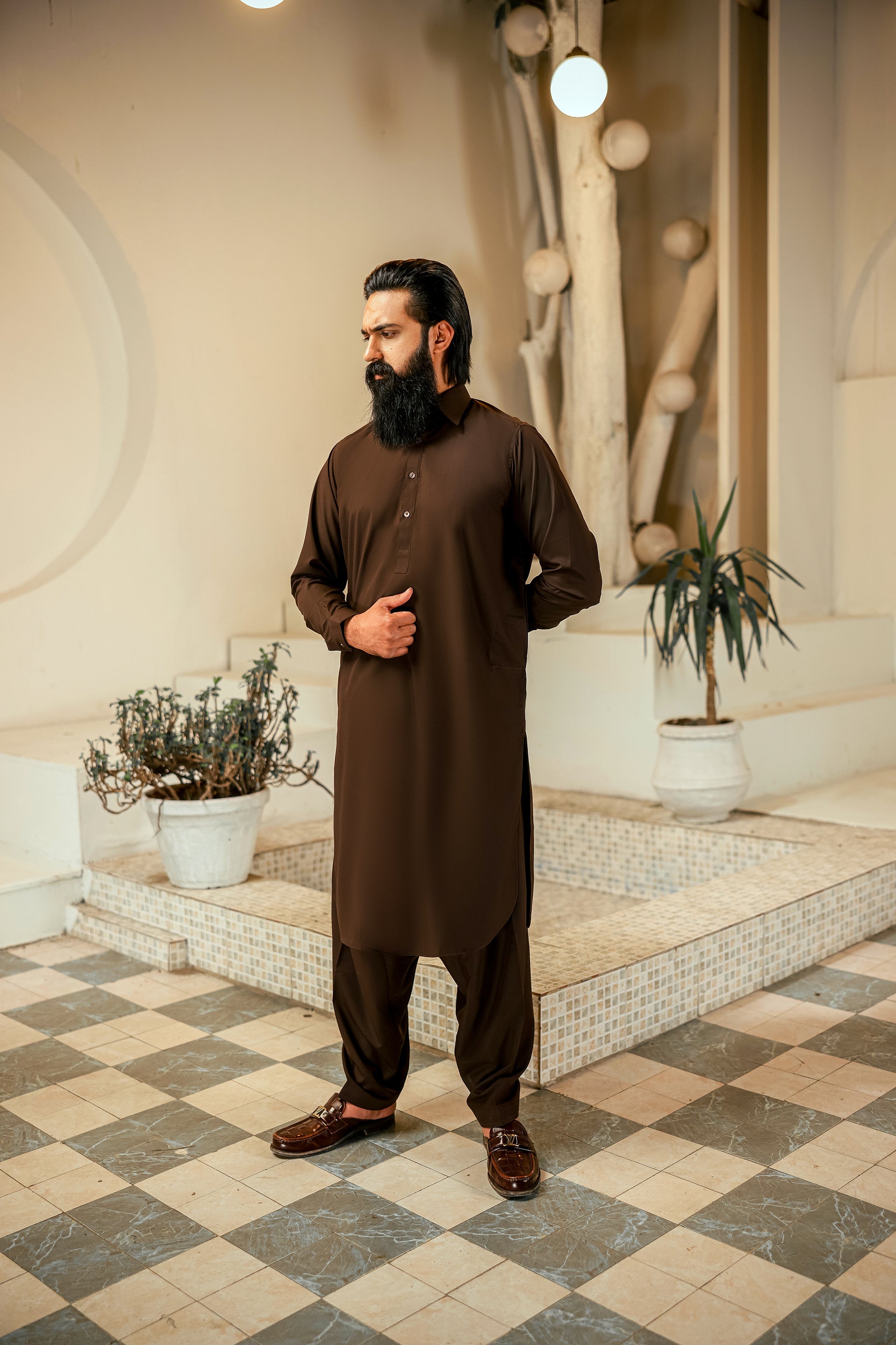 A refined shalwar kameez crafted from premium fabric, featuring a classic straight cut with a sleek buttoned placket and full sleeves — perfect for an elegant traditional look.