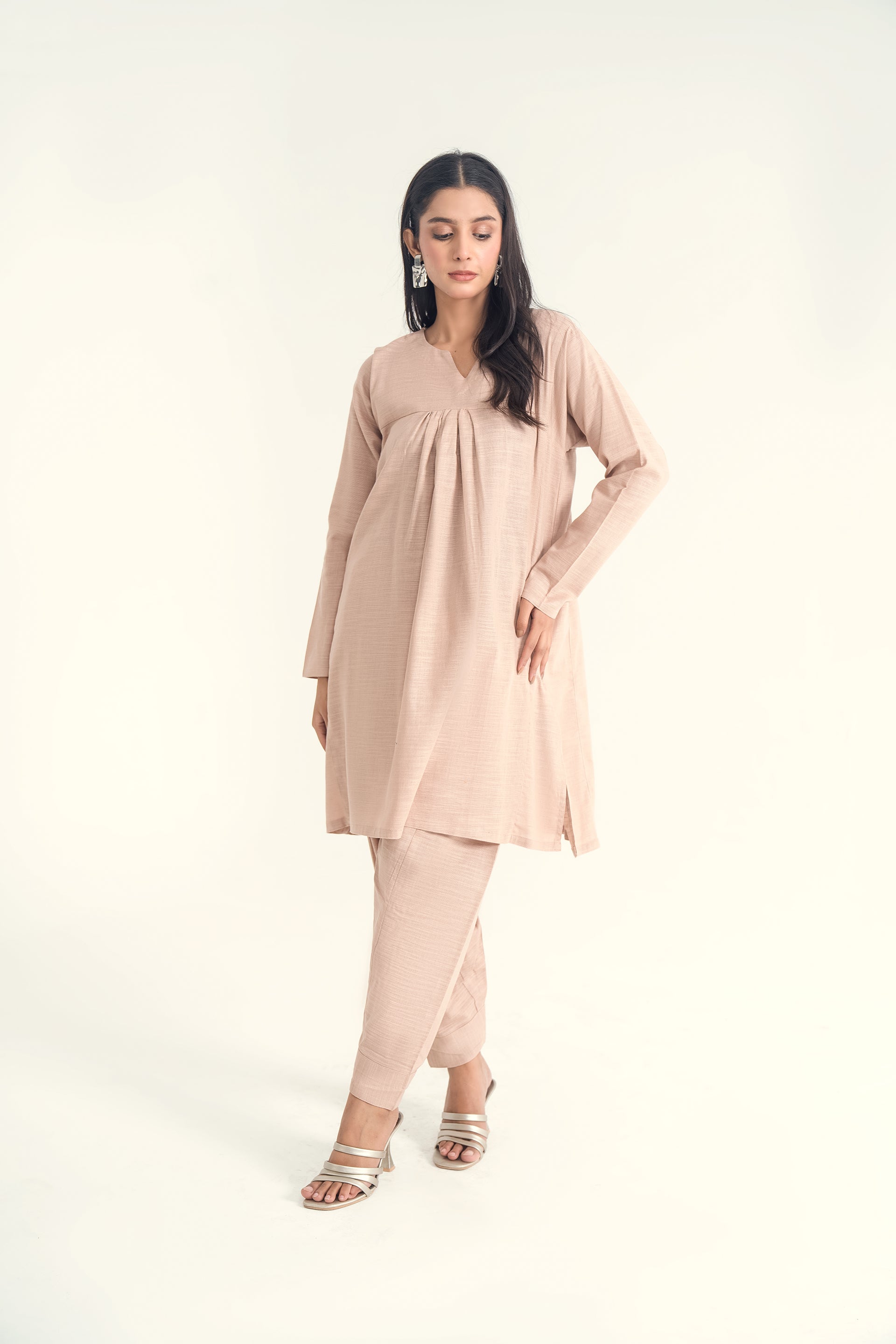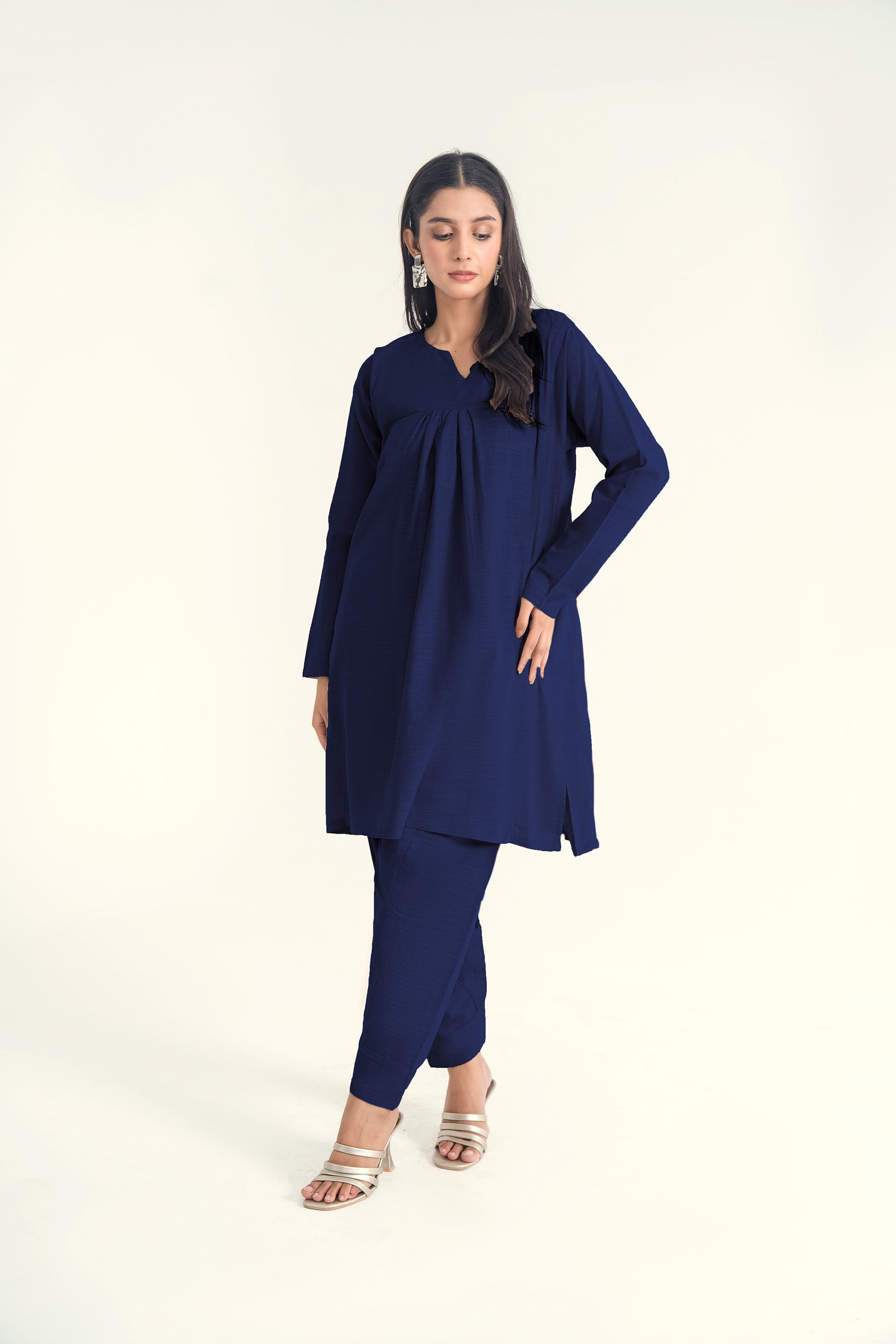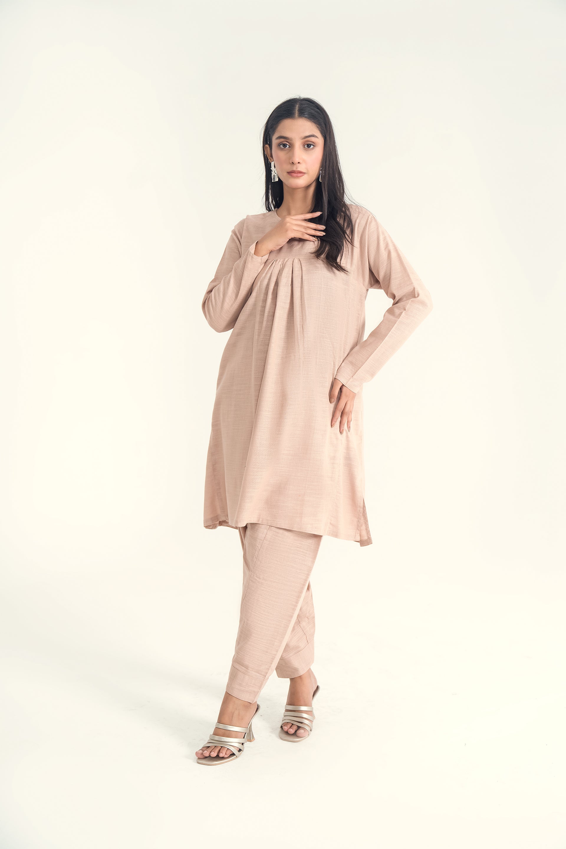 The Regal Pair is a cozy khaddar ensemble with a classic neckline and gathered detailing, paired with loose trousers for a timeless, elegant, and effortlessly chic winter look.
