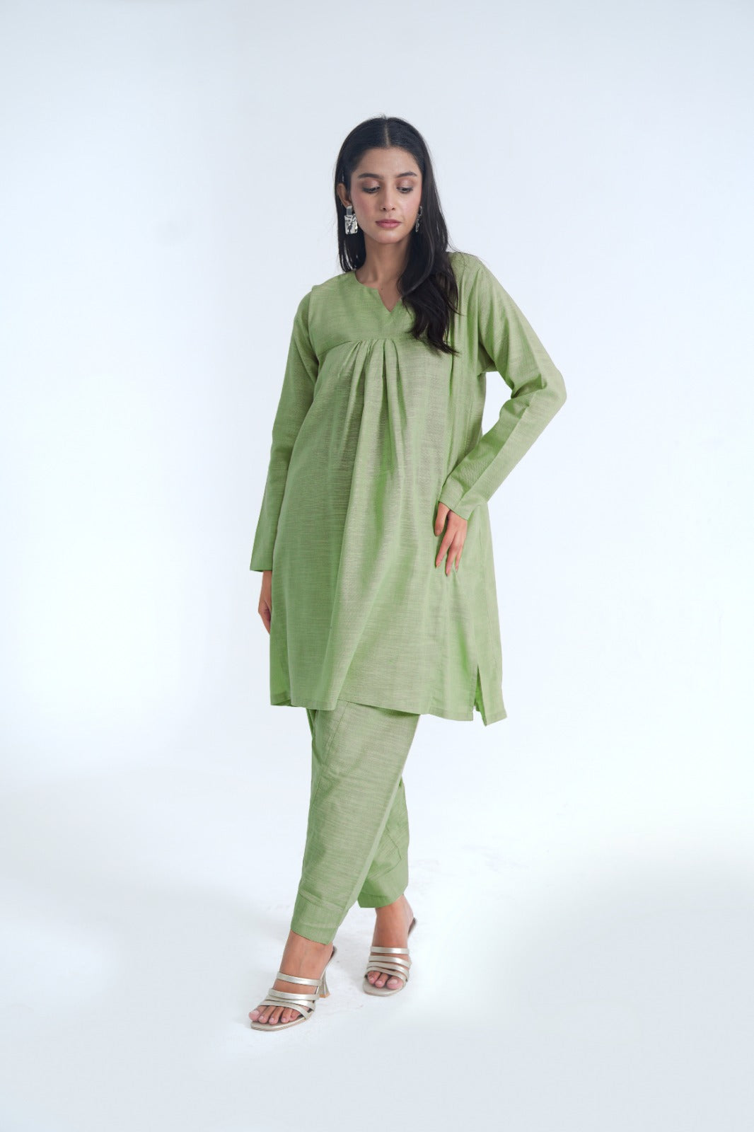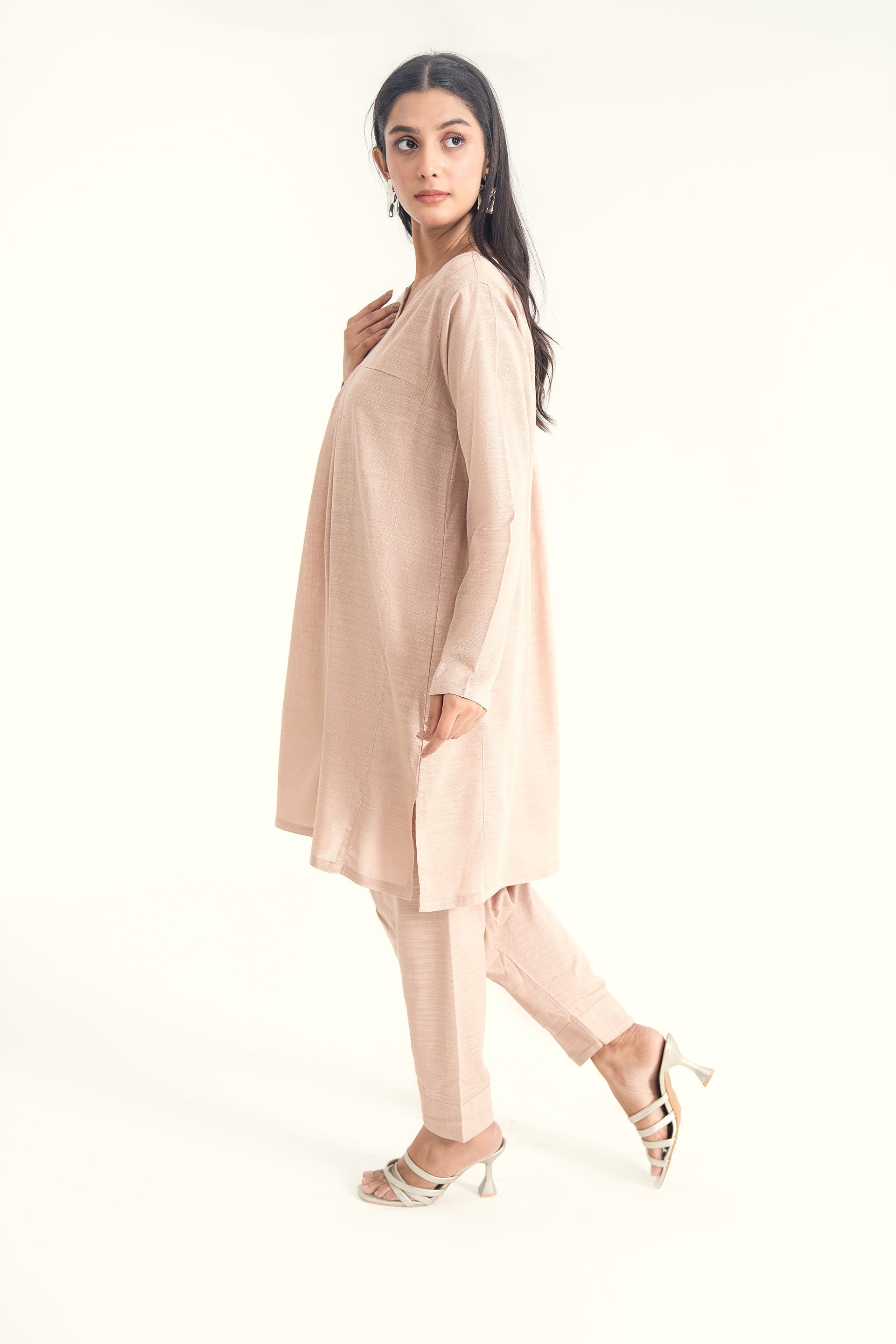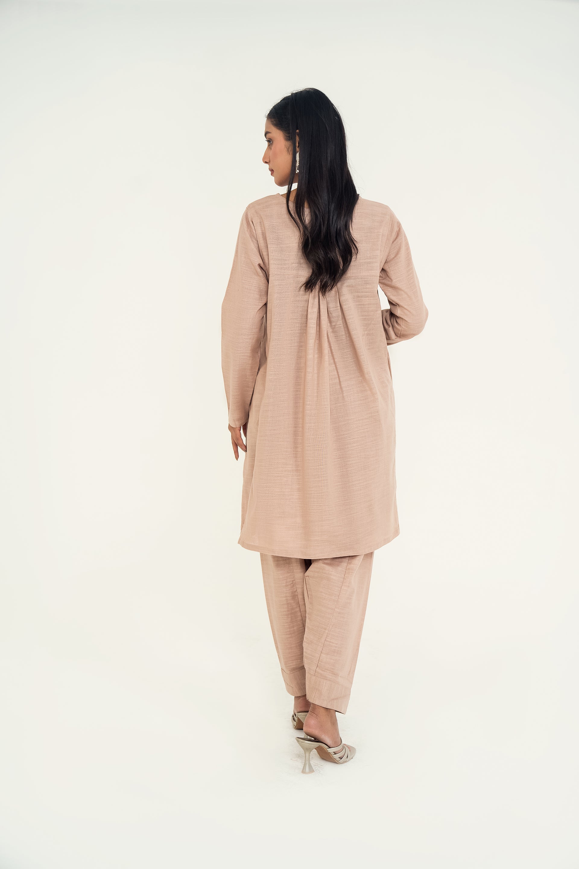 The Regal Pair is a cozy khaddar ensemble with a classic neckline and gathered detailing, paired with loose trousers for a timeless, elegant, and effortlessly chic winter look.