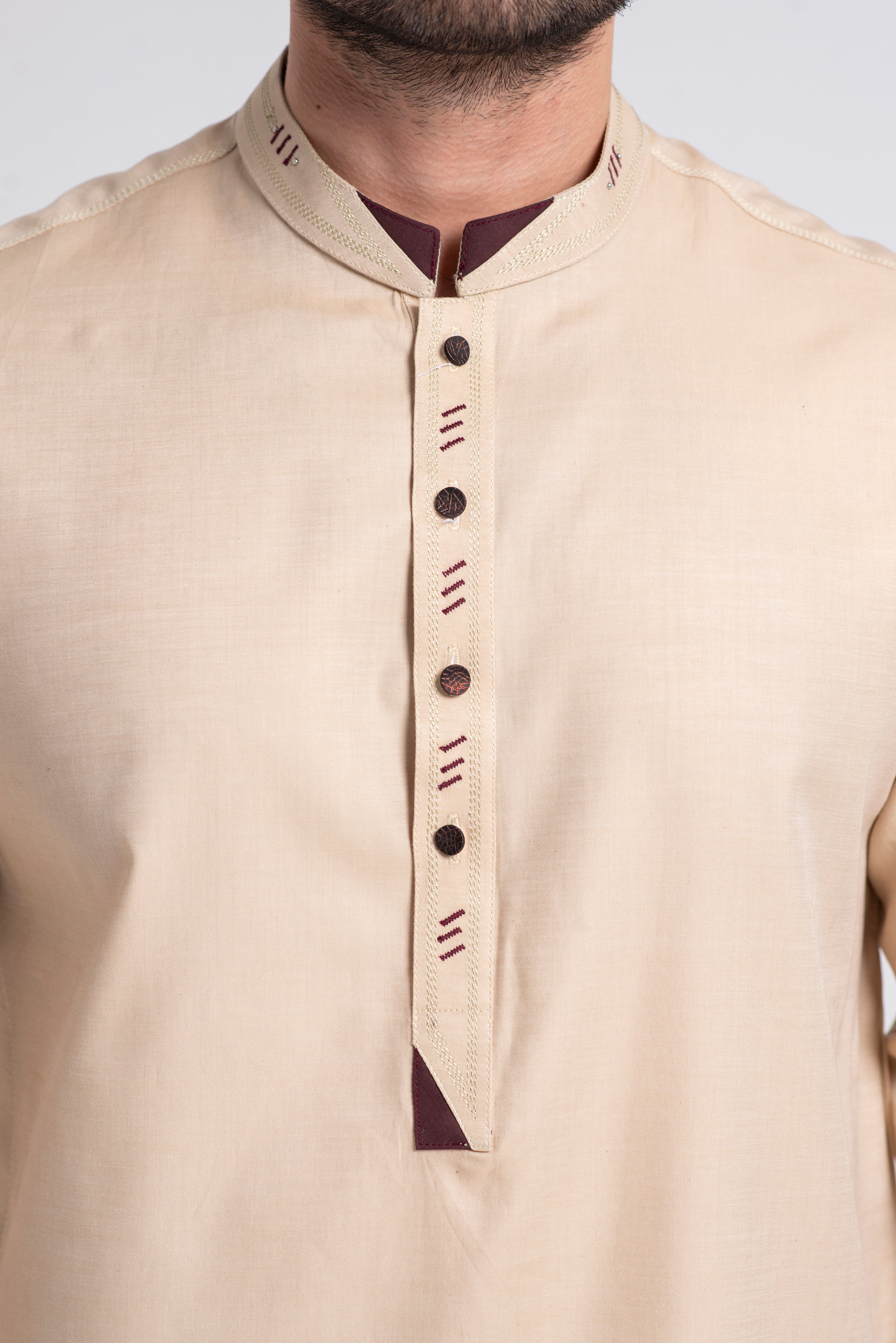 A classic men’s Kurta featuring with a mandarin ban and buttoned placket. Designed in a straight fit, this ensemble blends traditional charm with a refined, contemporary look.