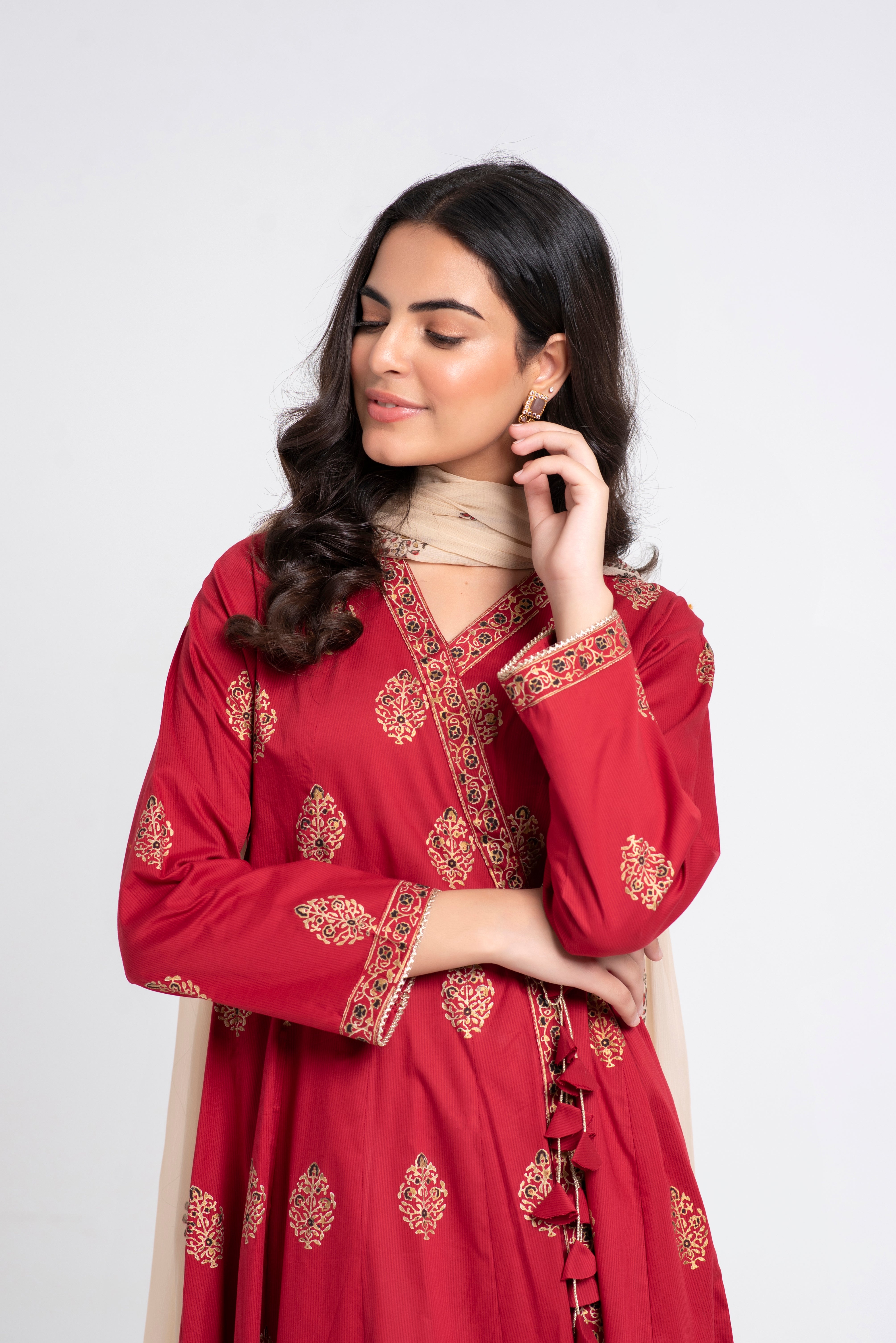 Celebrate tradition with this cotton Angrakha frock, featuring a hand block-printed front panel, a single back motif, and an overlap neckline with a playful side tie-up. Full sleeves and delicate lace detailing add charm to this breathable, festive-ready look