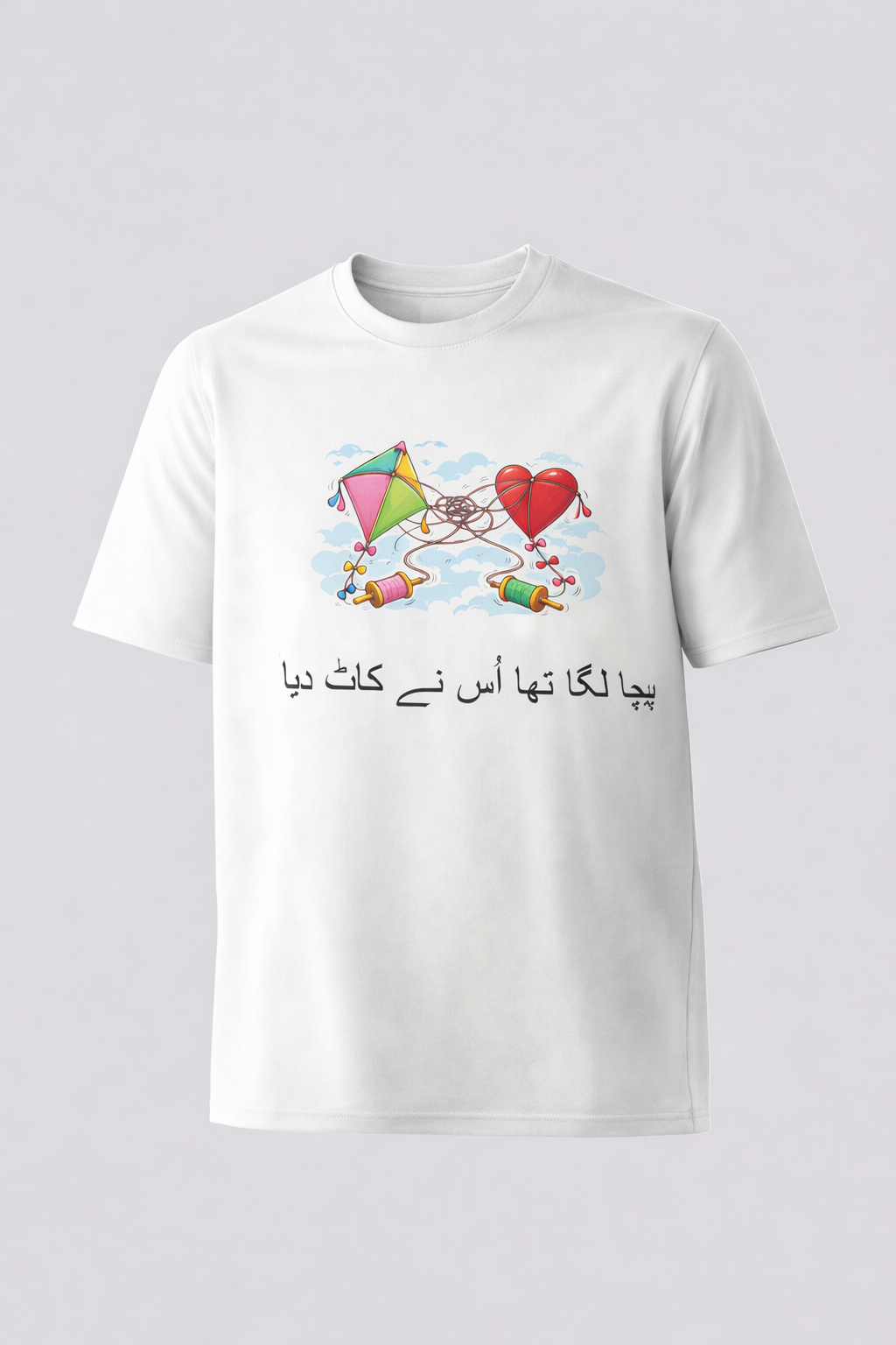 A white tee featuring vibrant Basant inspired DTF printing. The design captures the joy of kite flying through bold colors and playful details.