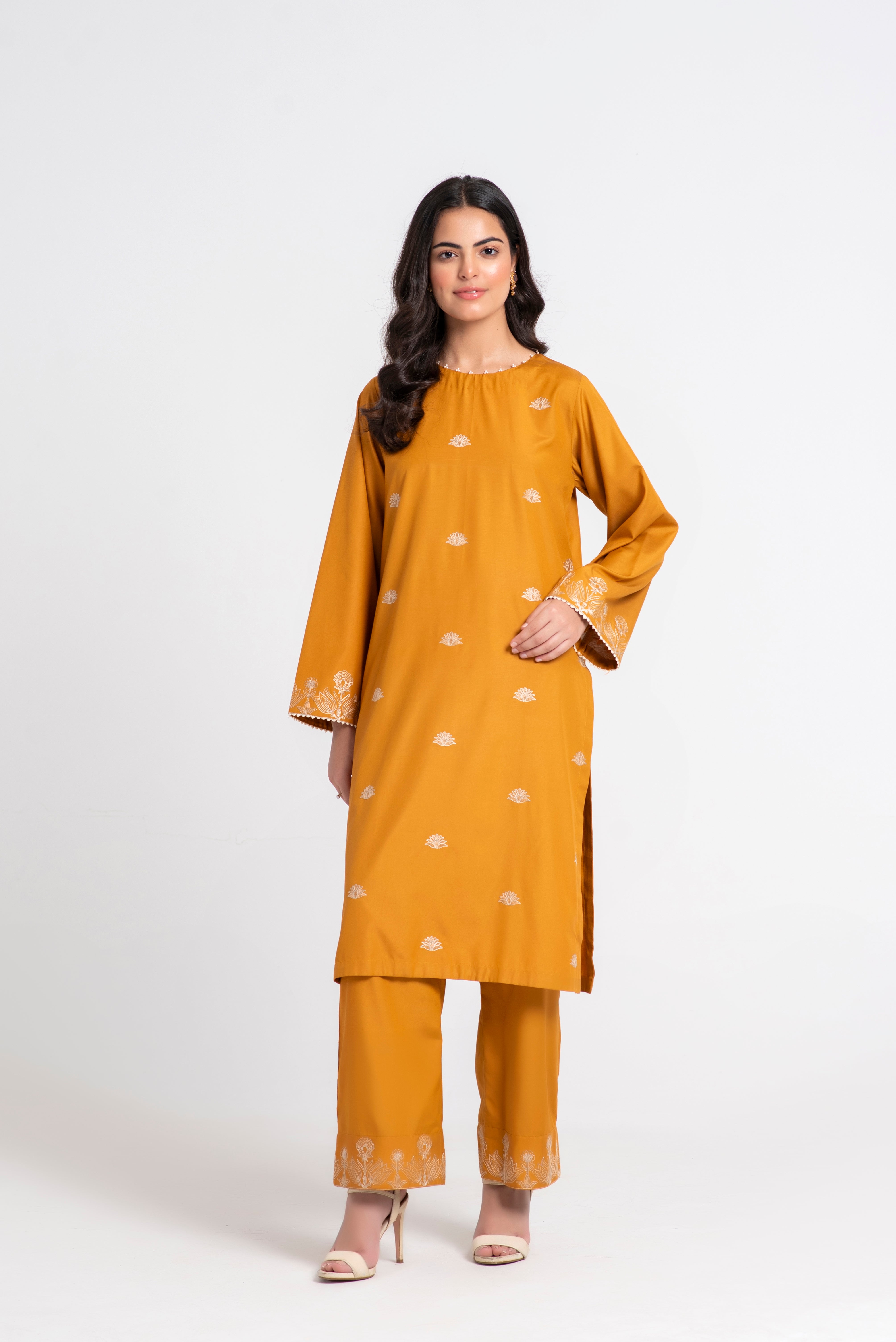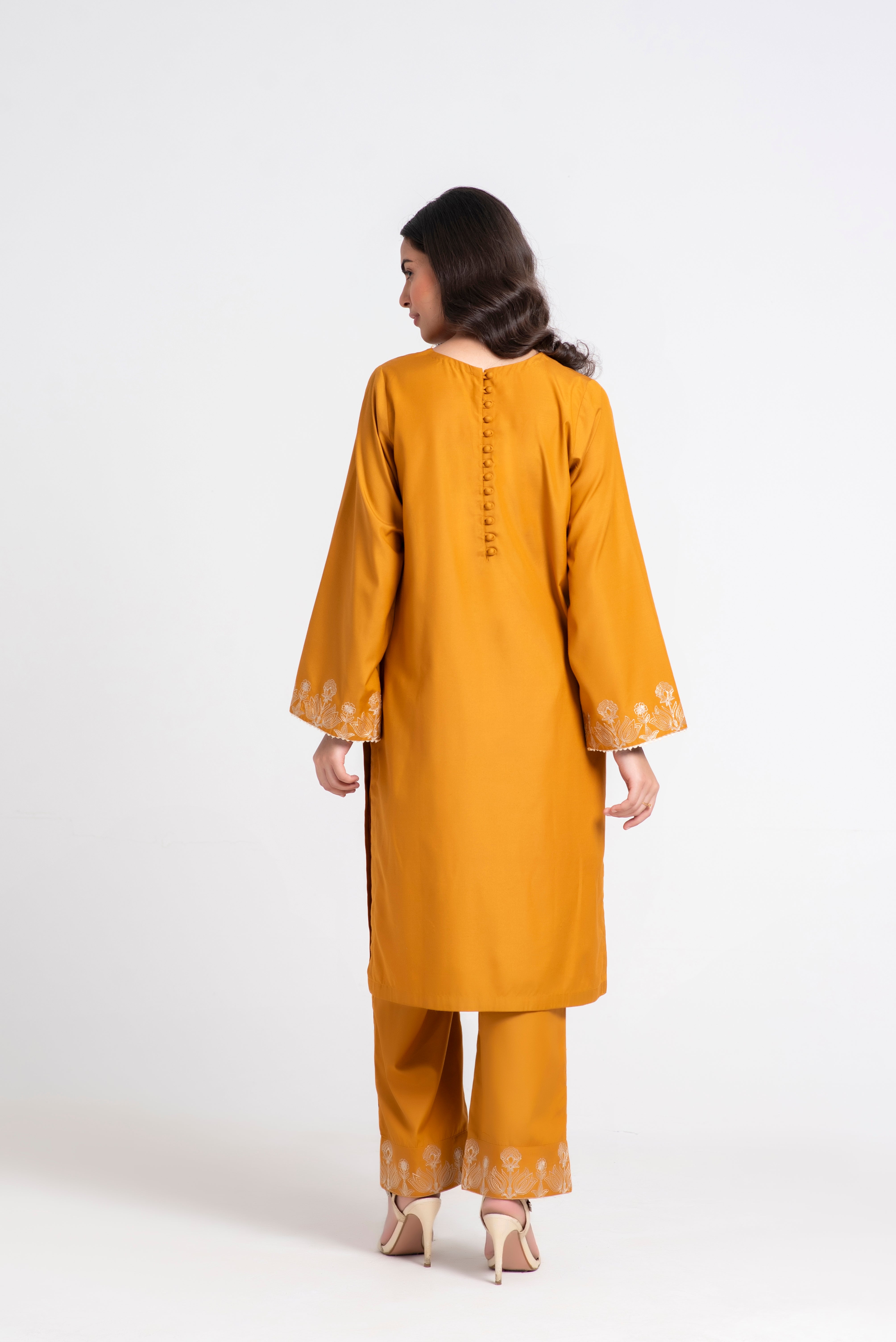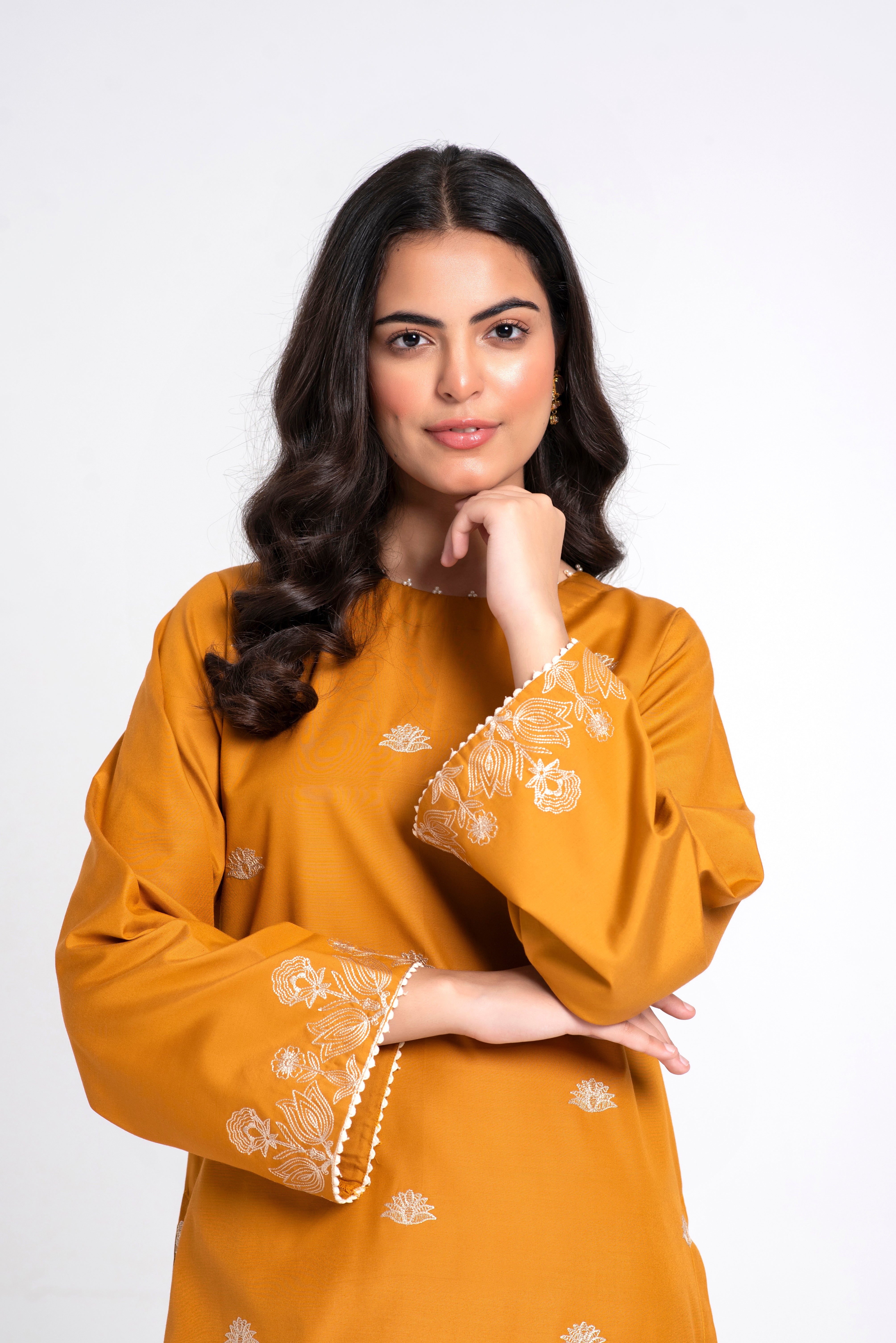 Women’s shirt with a round neckline decorated with Patti pearls, embroidered sleeves, and an all-over pattern. Paired with Panchas trousers featuring matching embroidery for