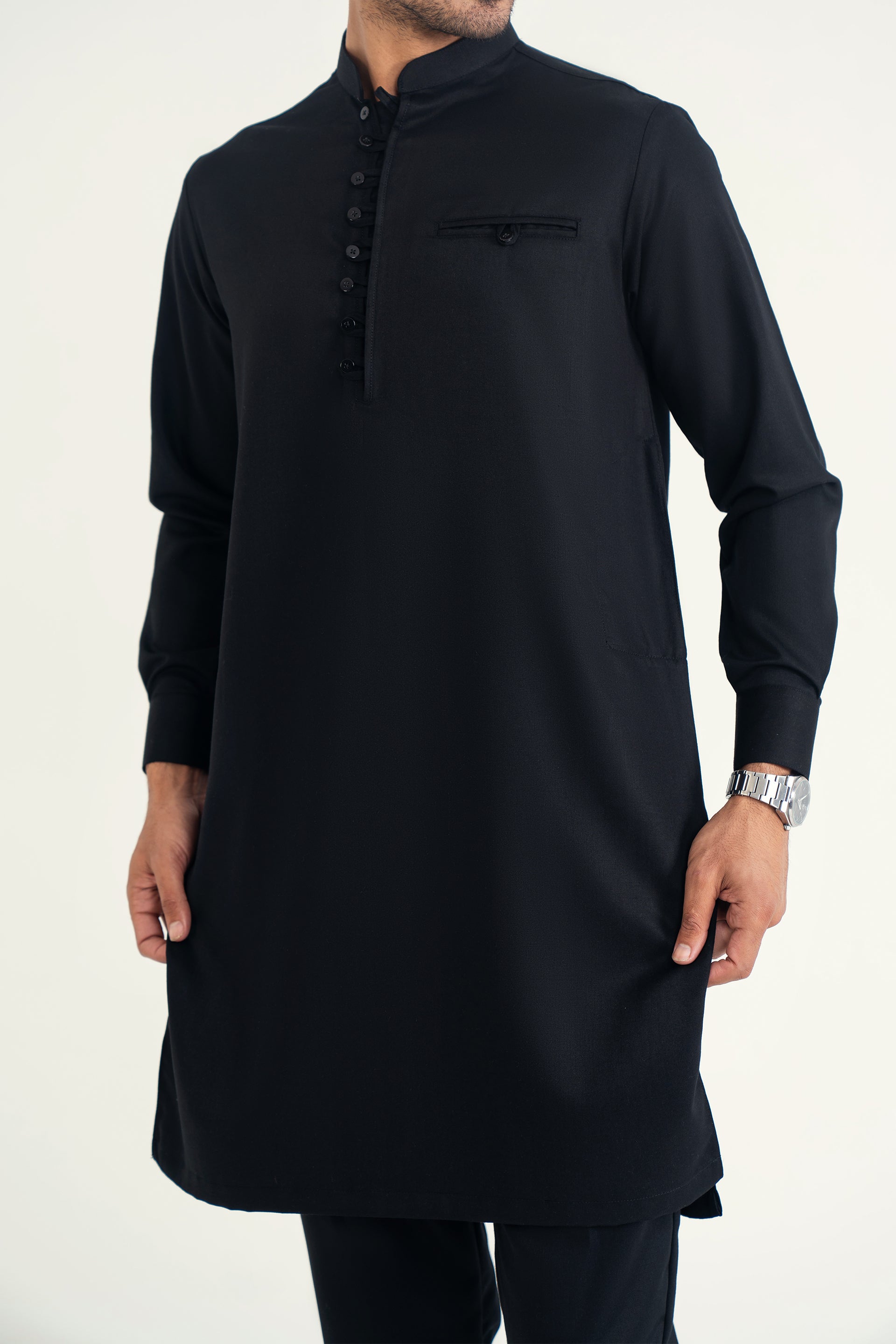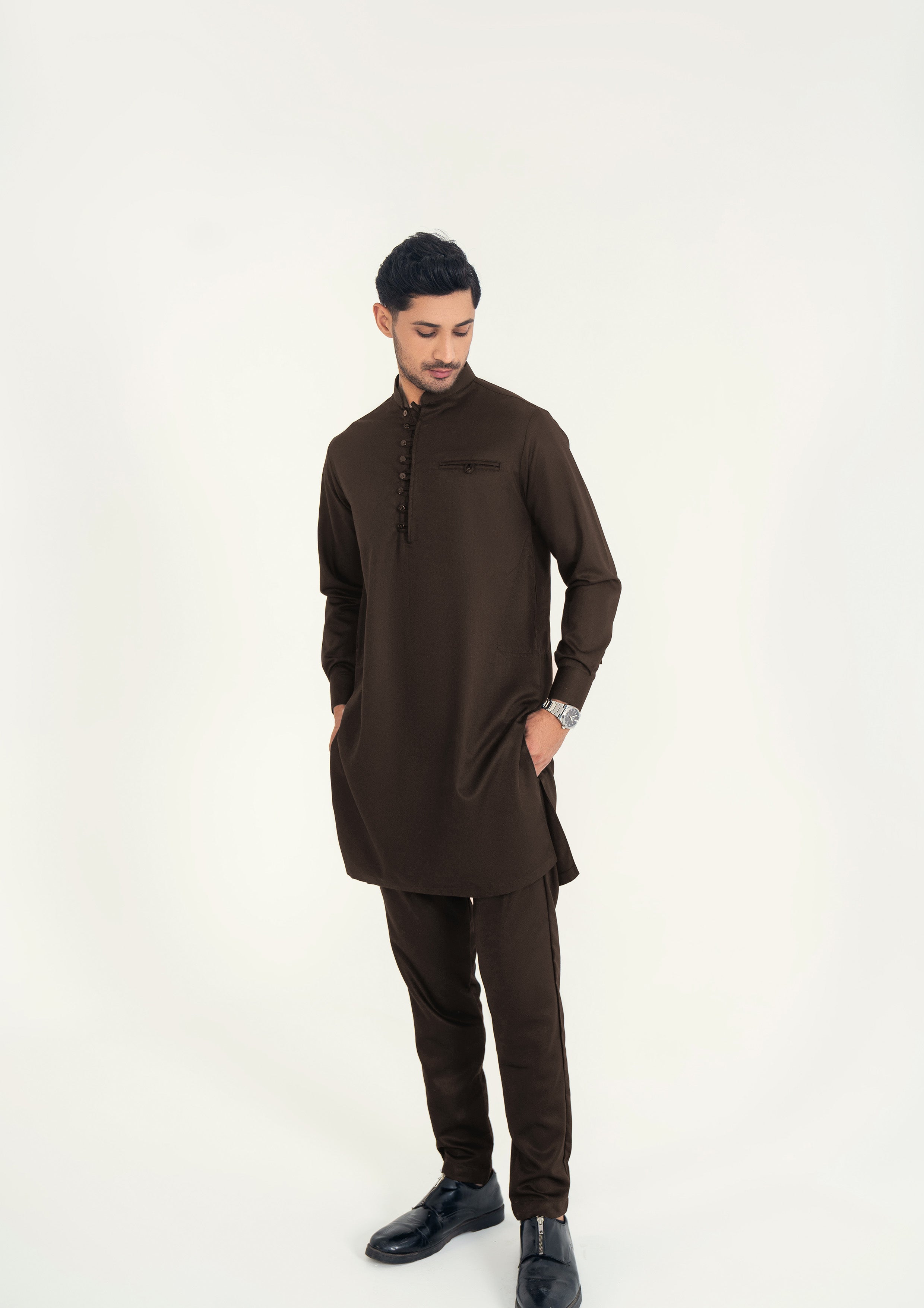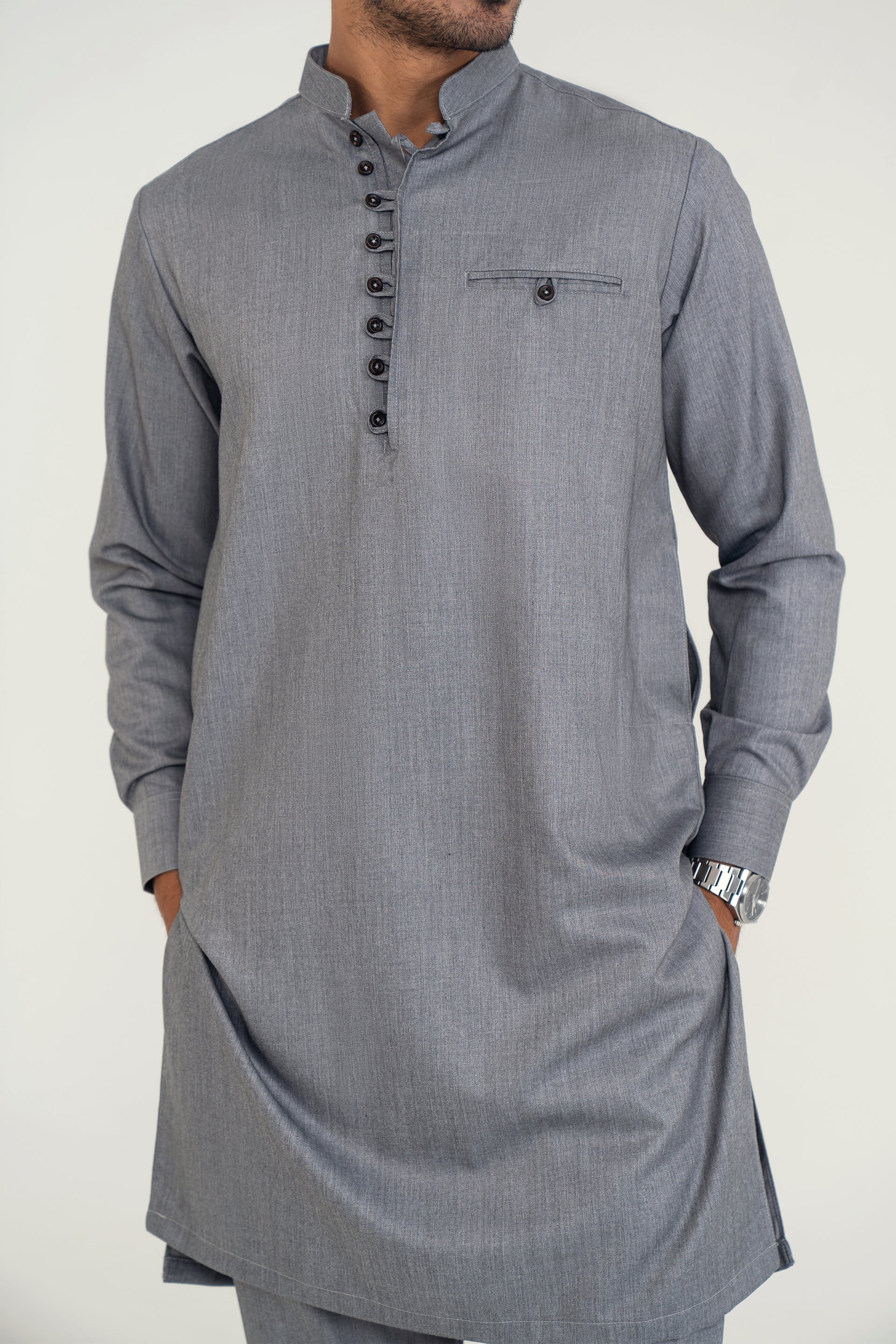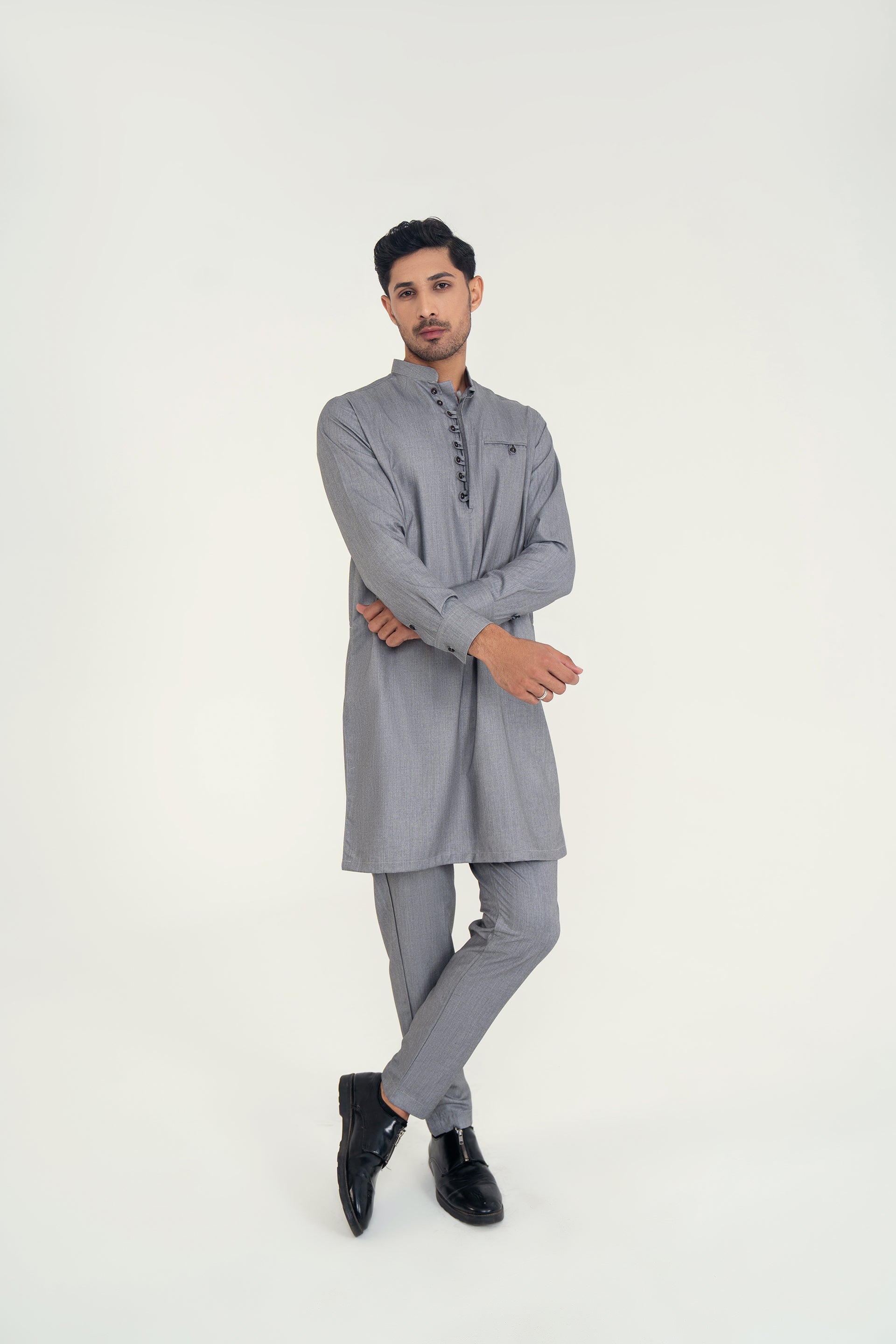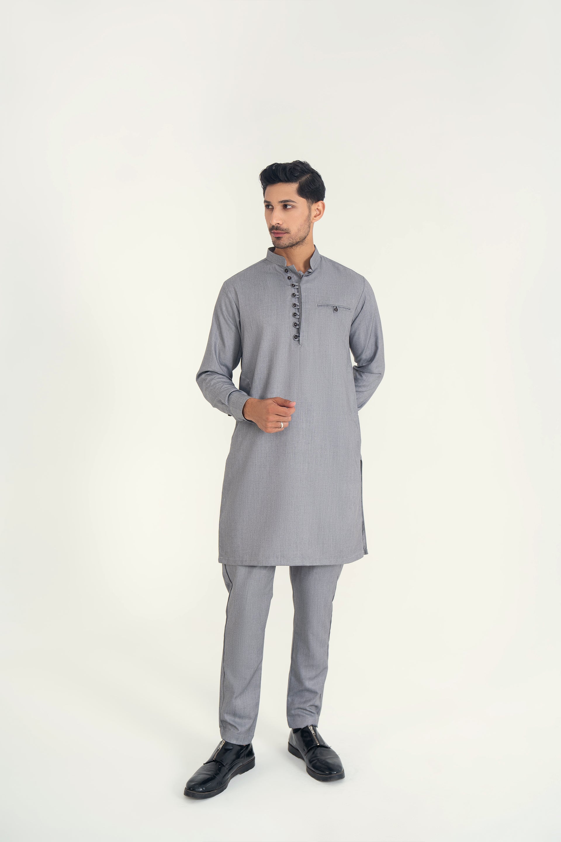 A refined 2-piece kurta set featuring a mandarin ban, button-and-loop detailing on the front, and matching trousers — blending traditional elements with contemporary style for both formal and casual occasions.