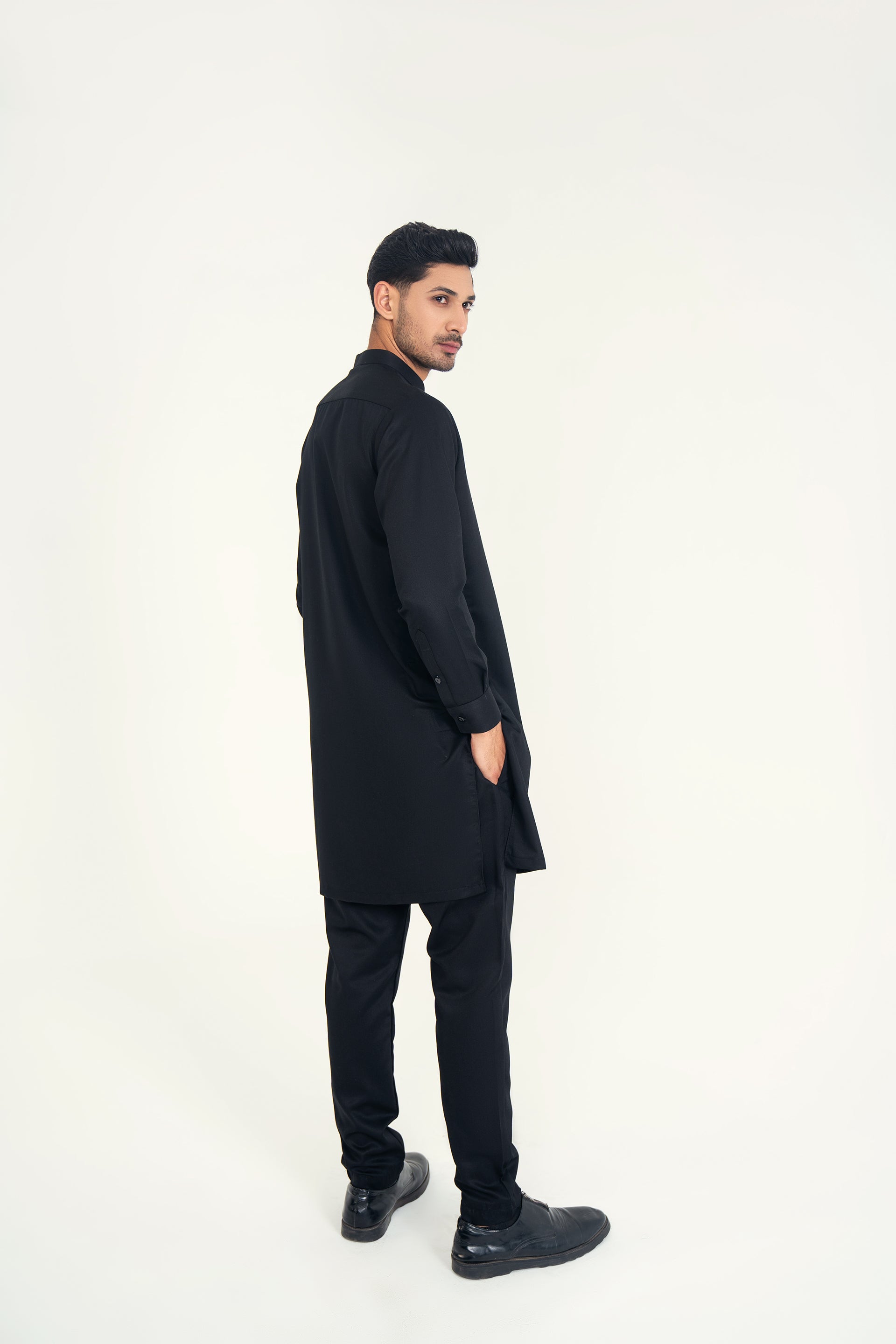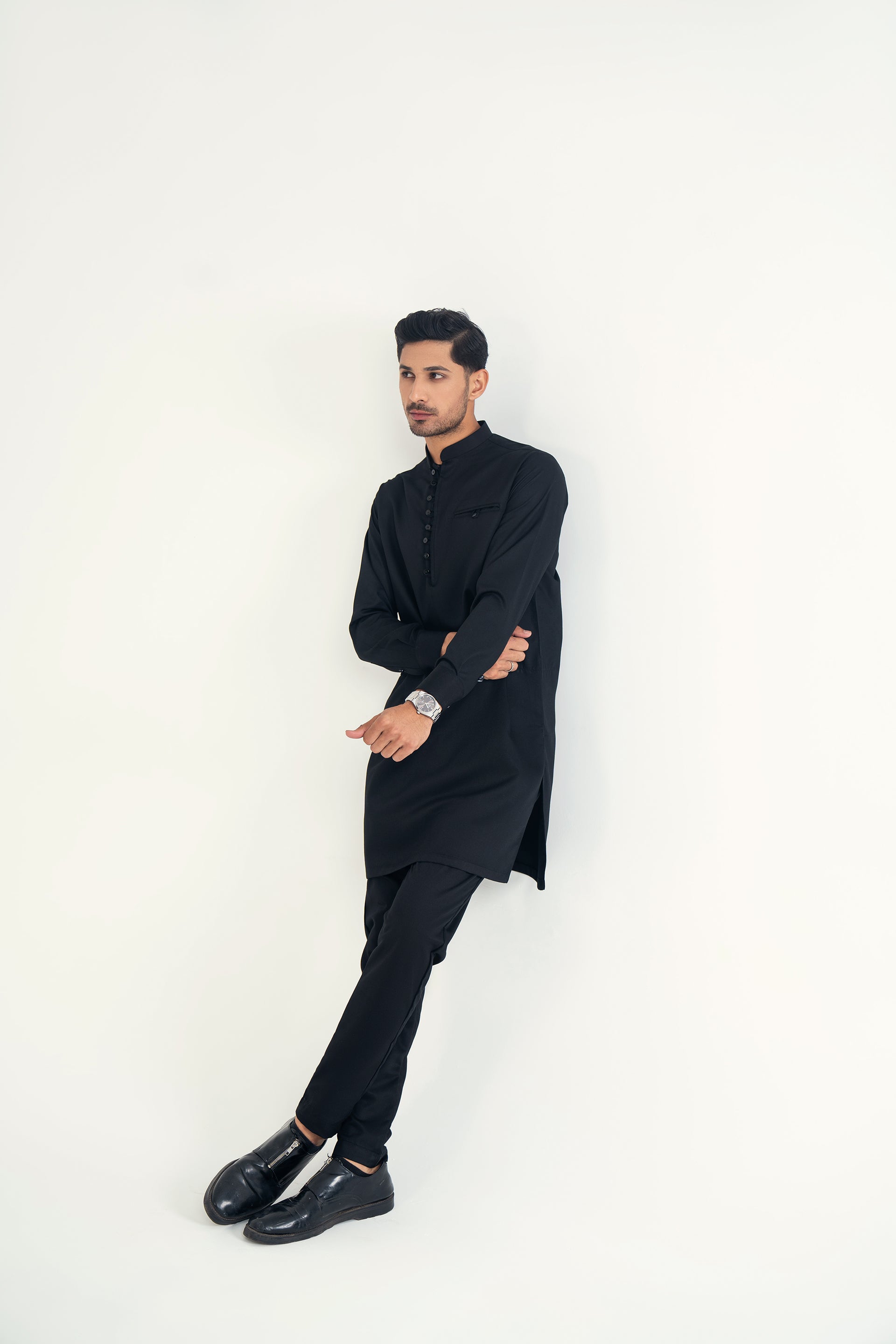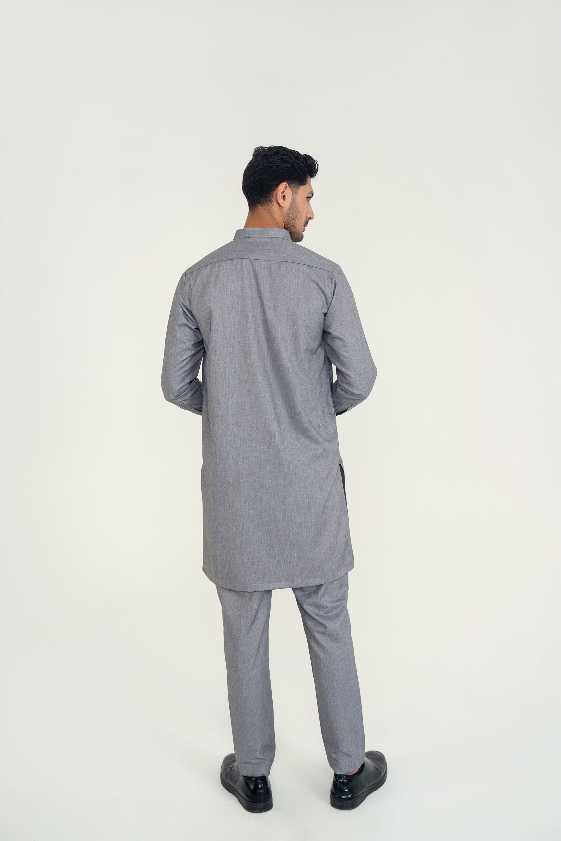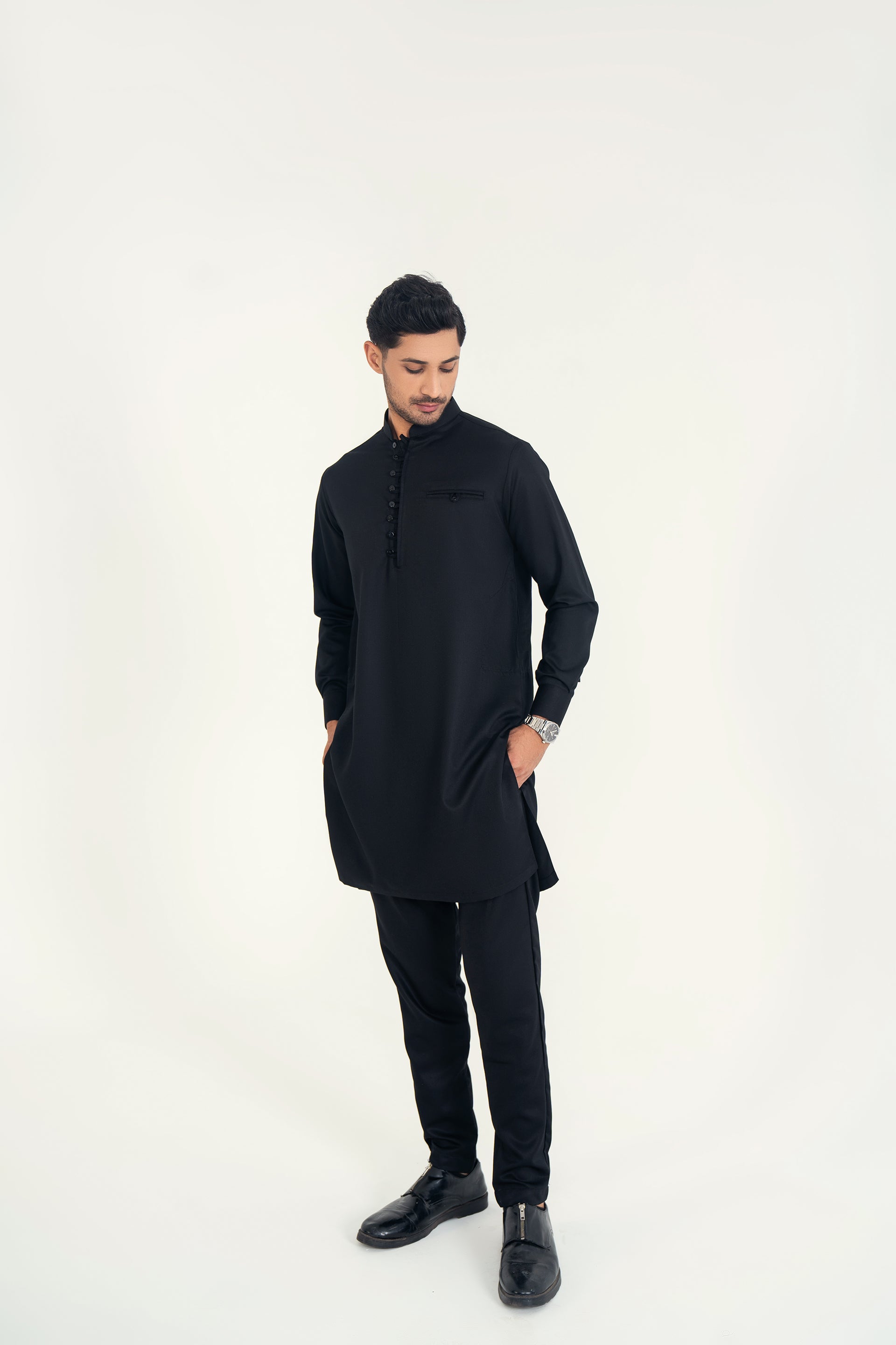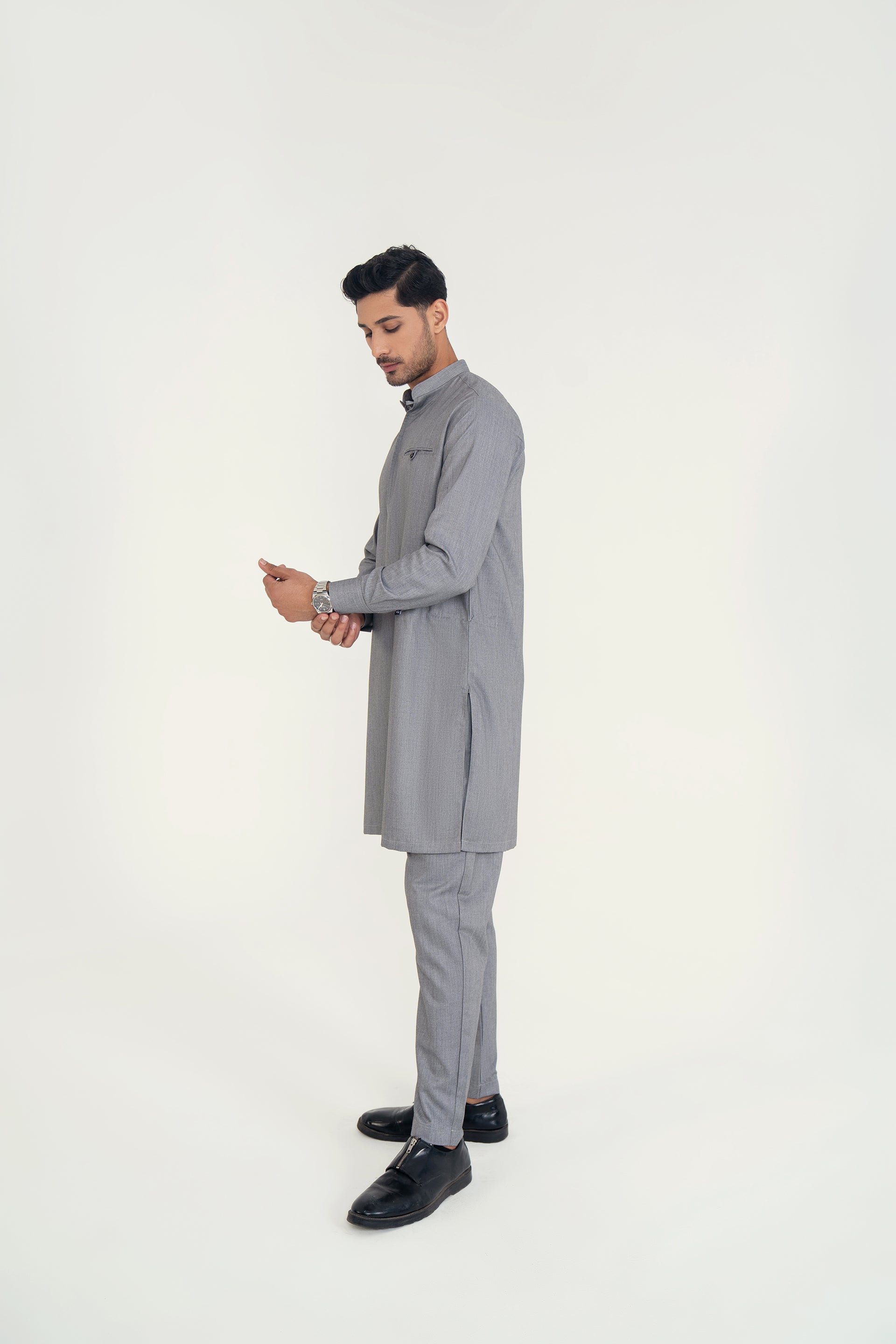 A refined 2-piece kurta set featuring a mandarin ban, button-and-loop detailing on the front, and matching trousers — blending traditional elements with contemporary style for both formal and casual occasions.