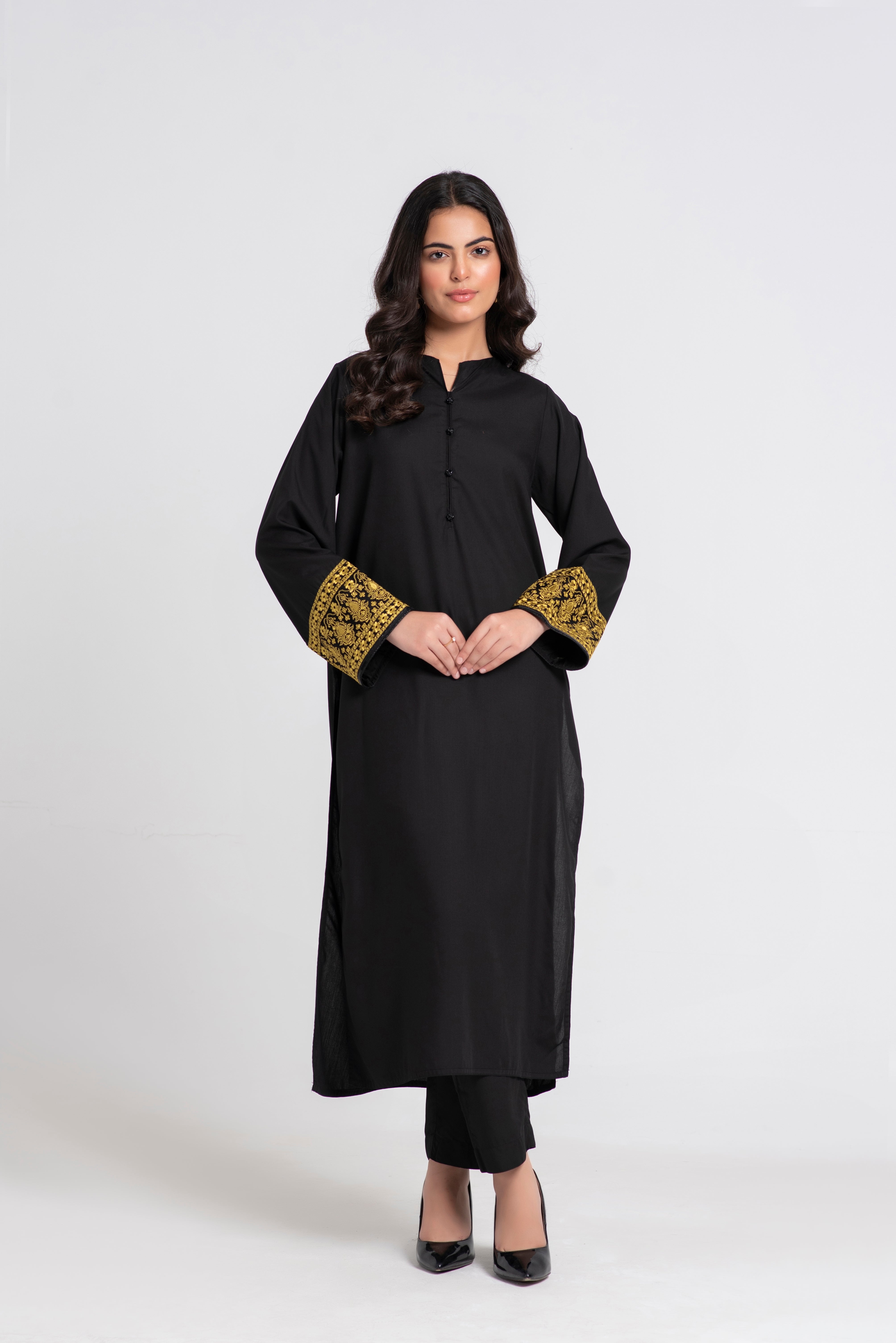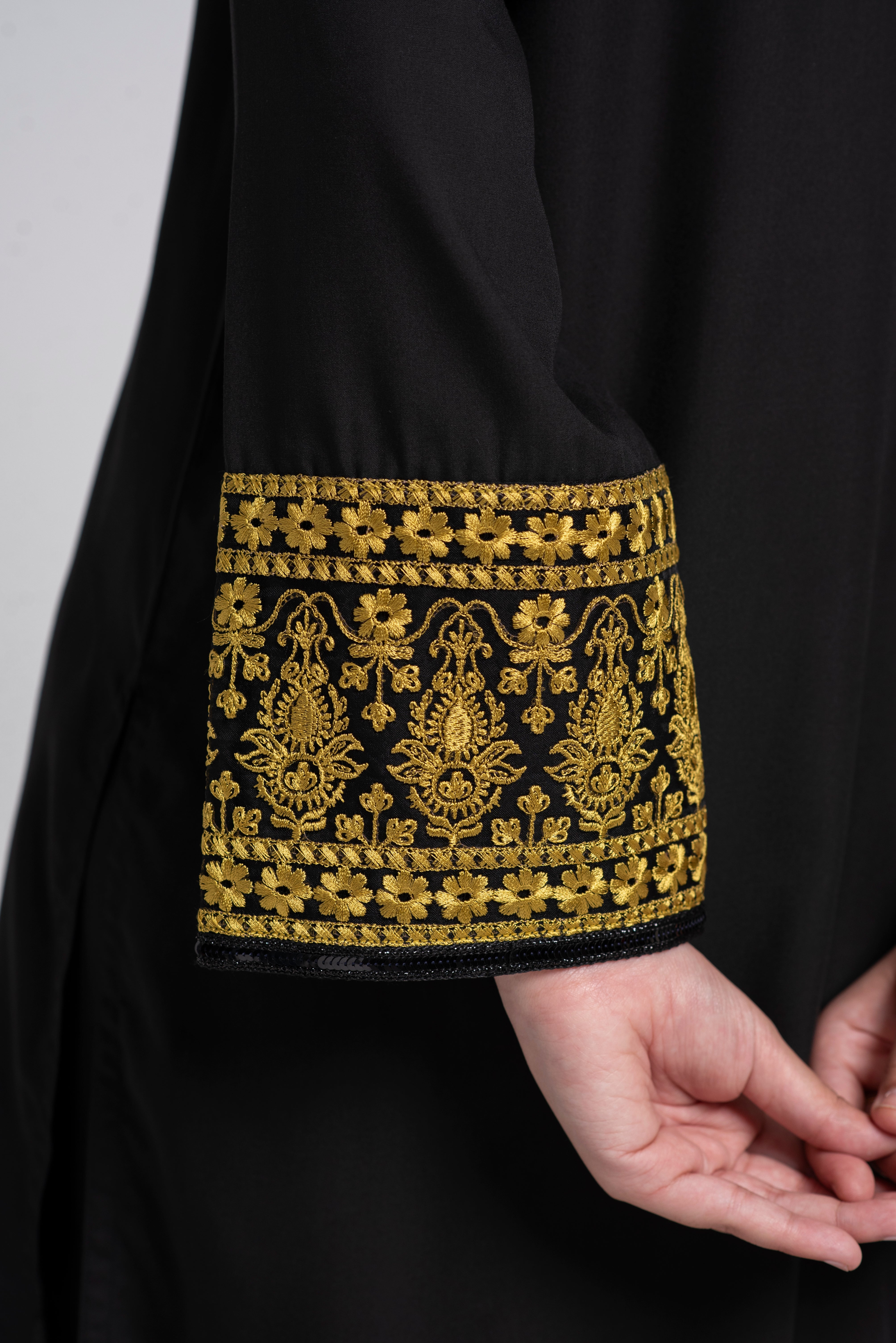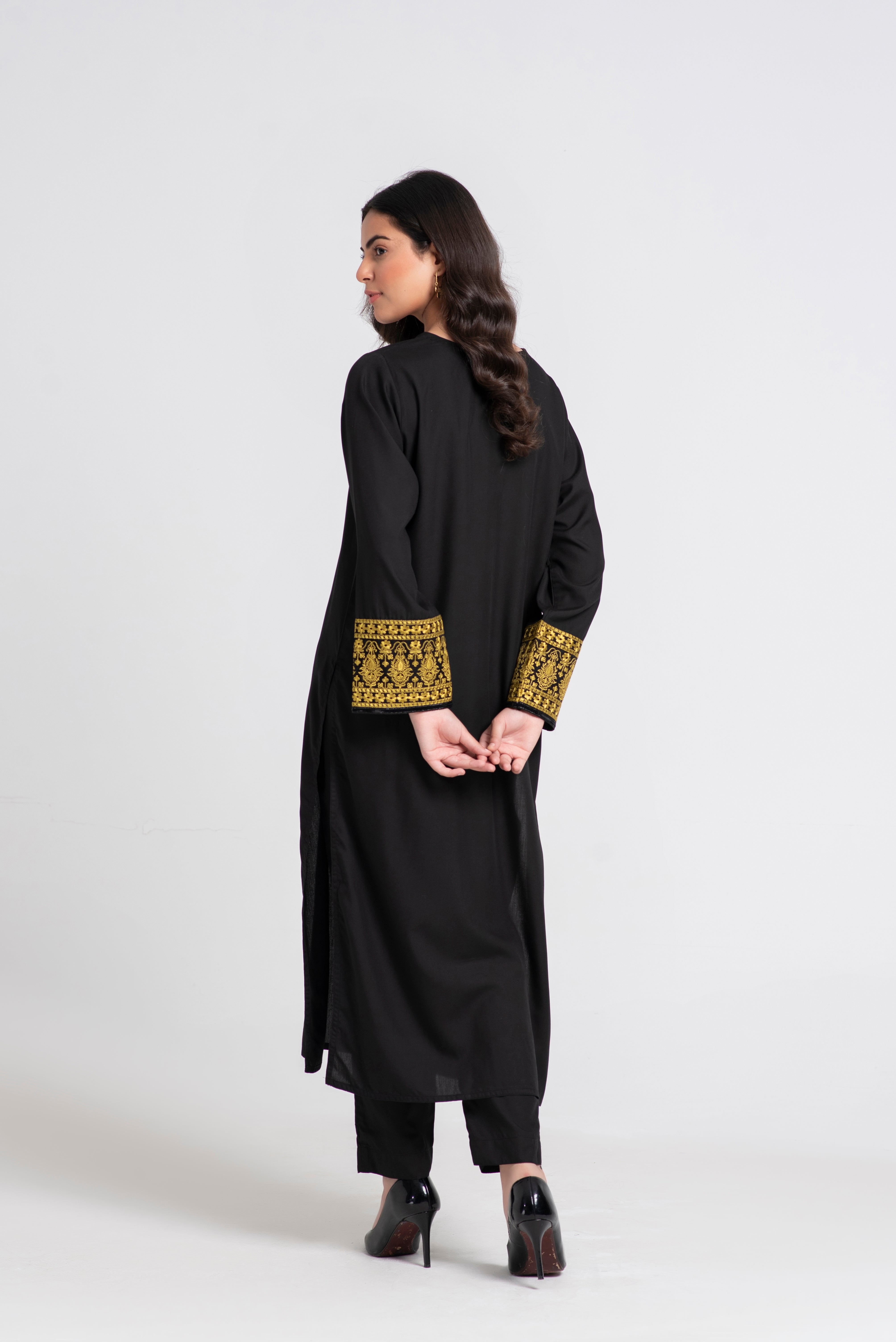 A refined black Korean raw silk shirt with a boat neckline, contrast mehndi green side slits, and ornate button detailing. Embroidered organza sleeves and a sleek trouser with a double-stitched pancha add the perfect blend of tradition and modern edge.