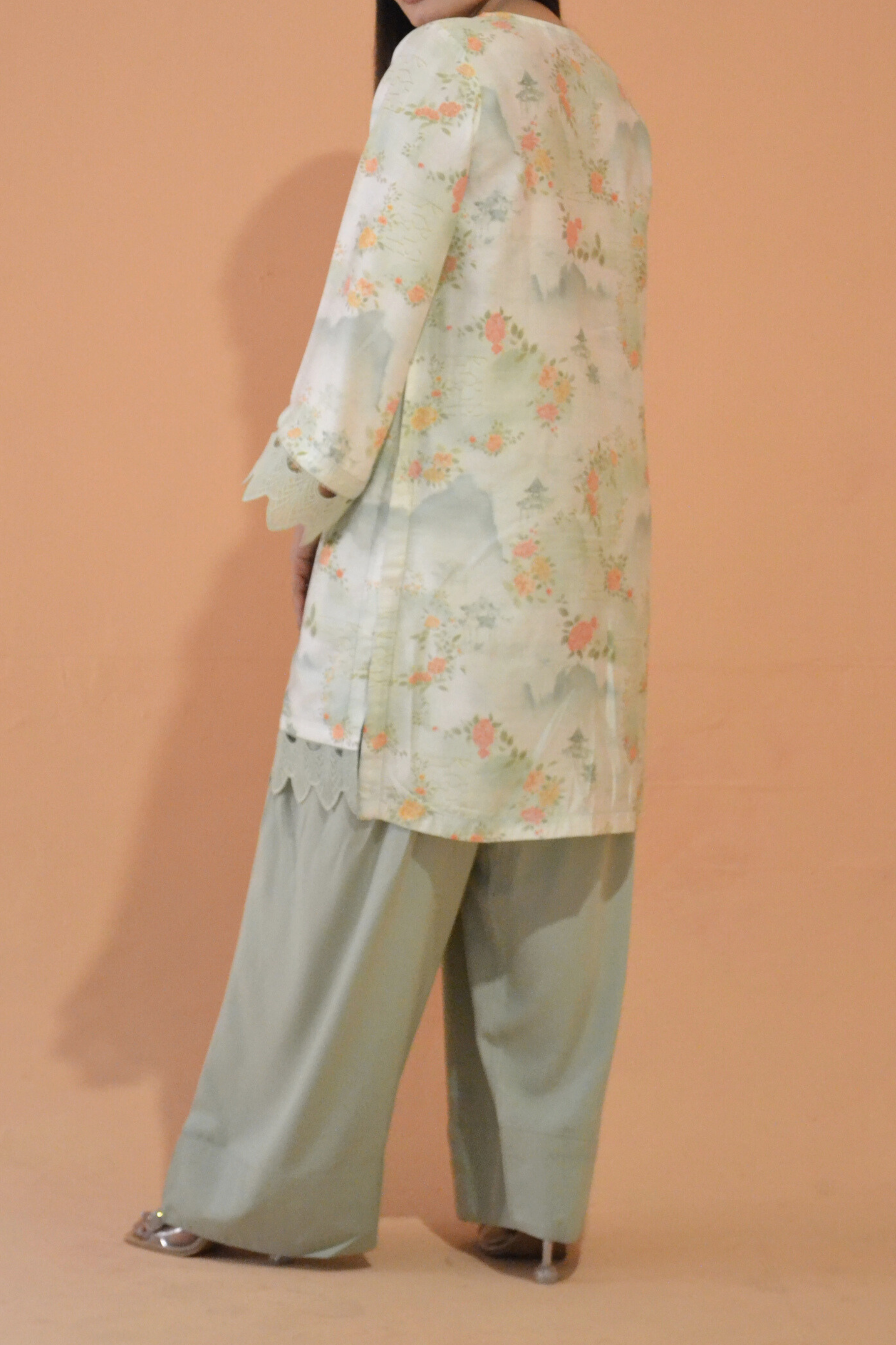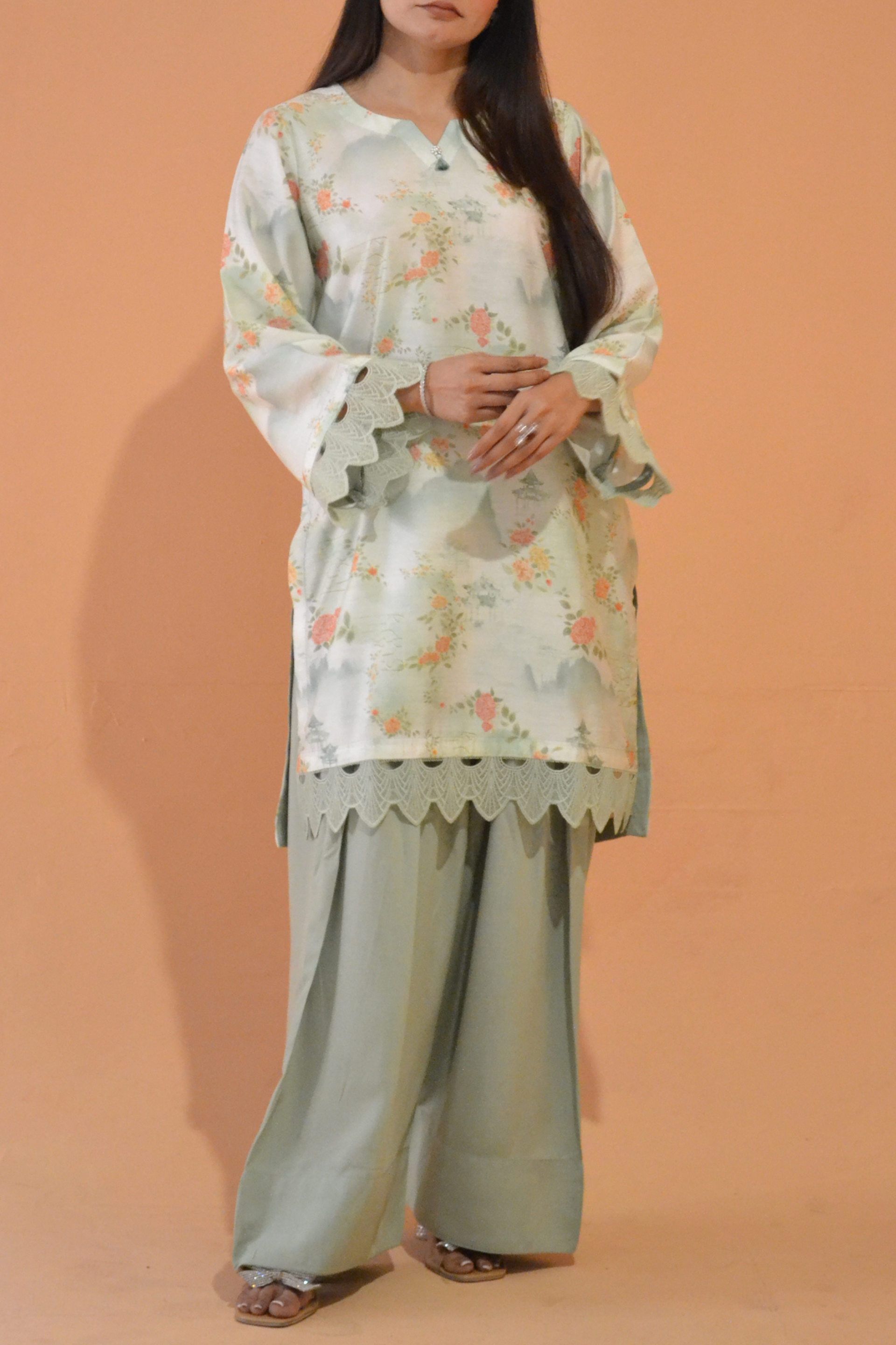 A printed short shirt paired with a plain shalwar for a classic and balanced look.