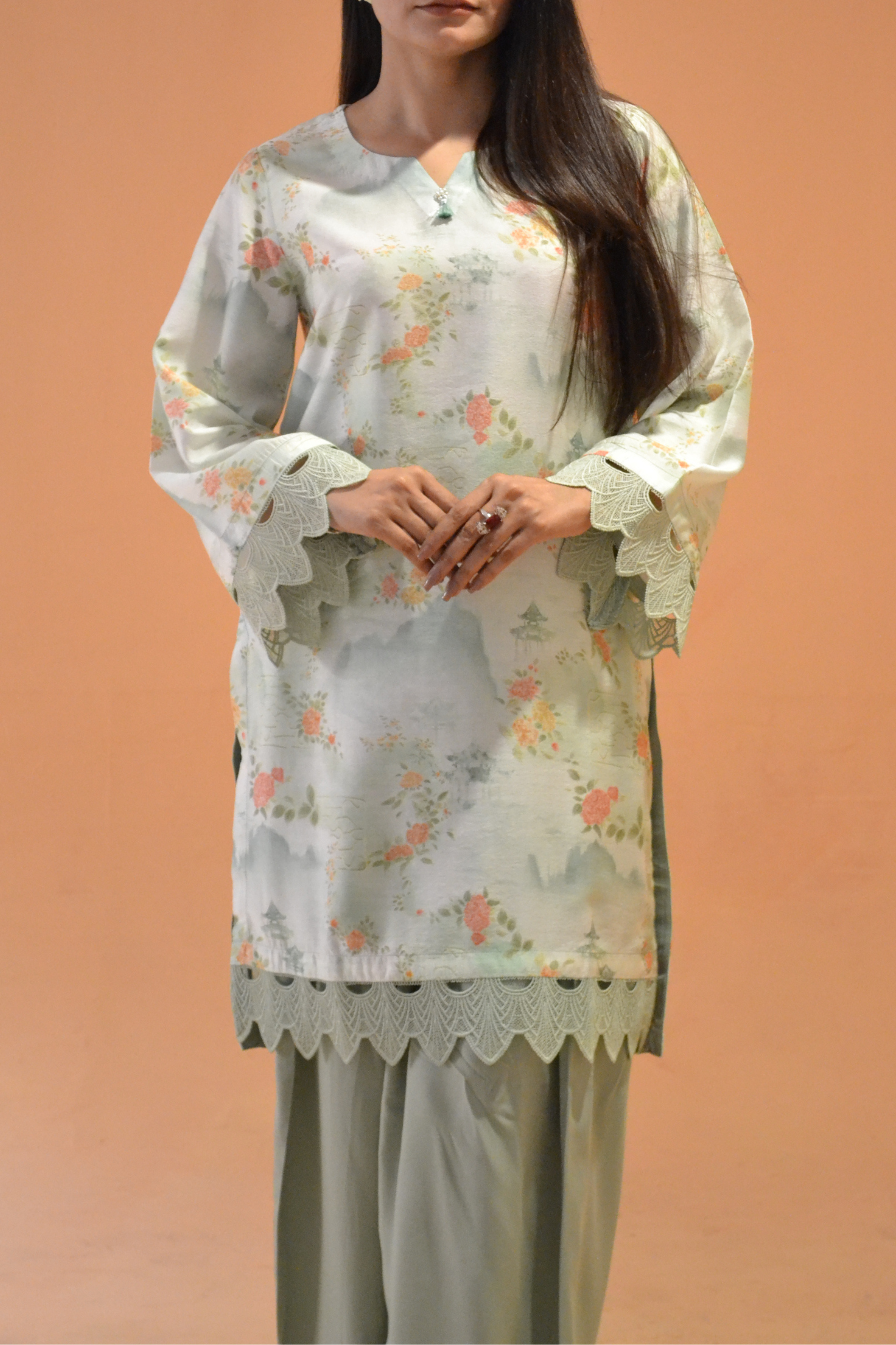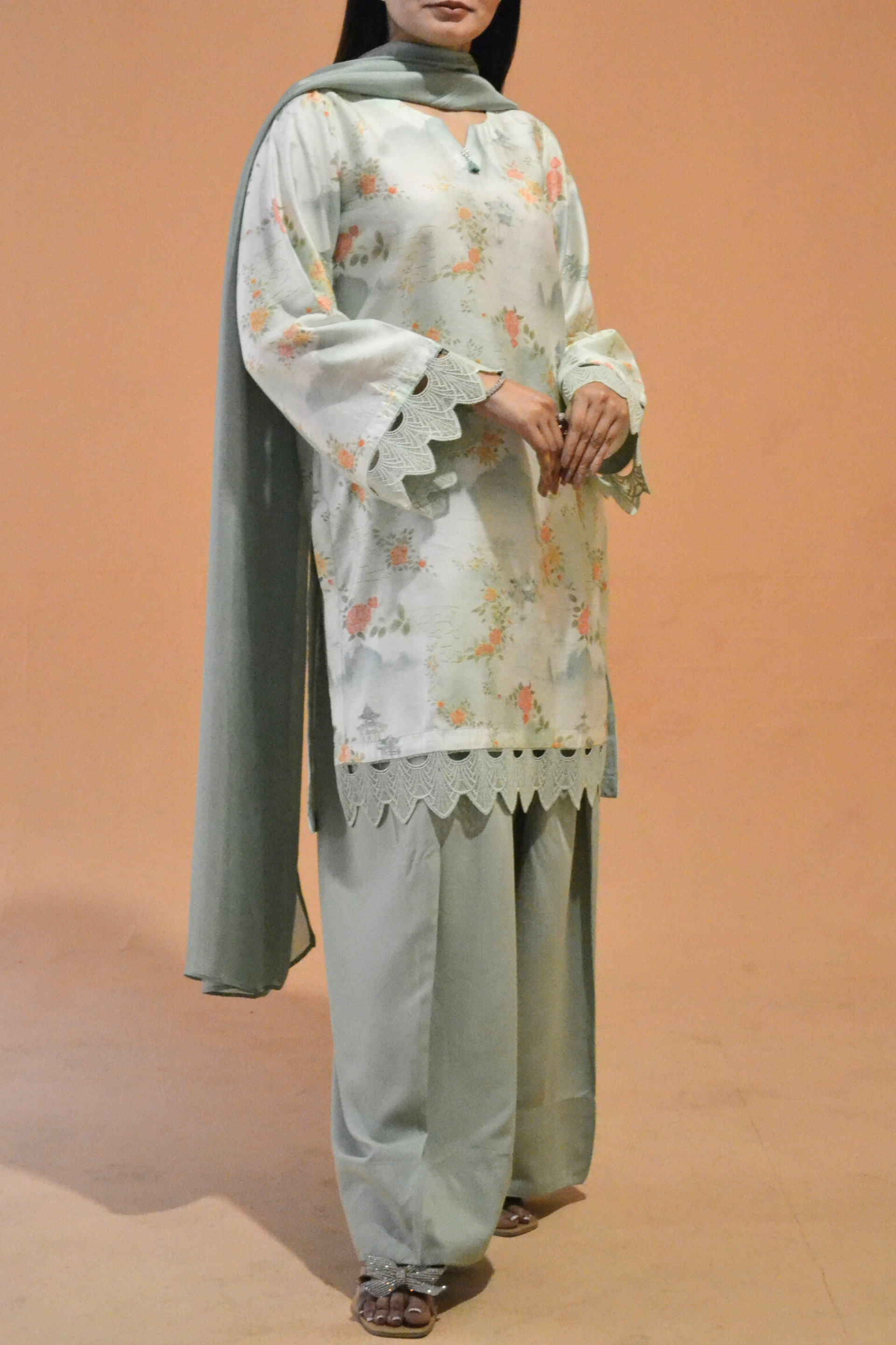 Lace detailing on the sleeves and hem adds a delicate touch. Finished with a dyed premium silk dupatta that brings elegance and grace.
