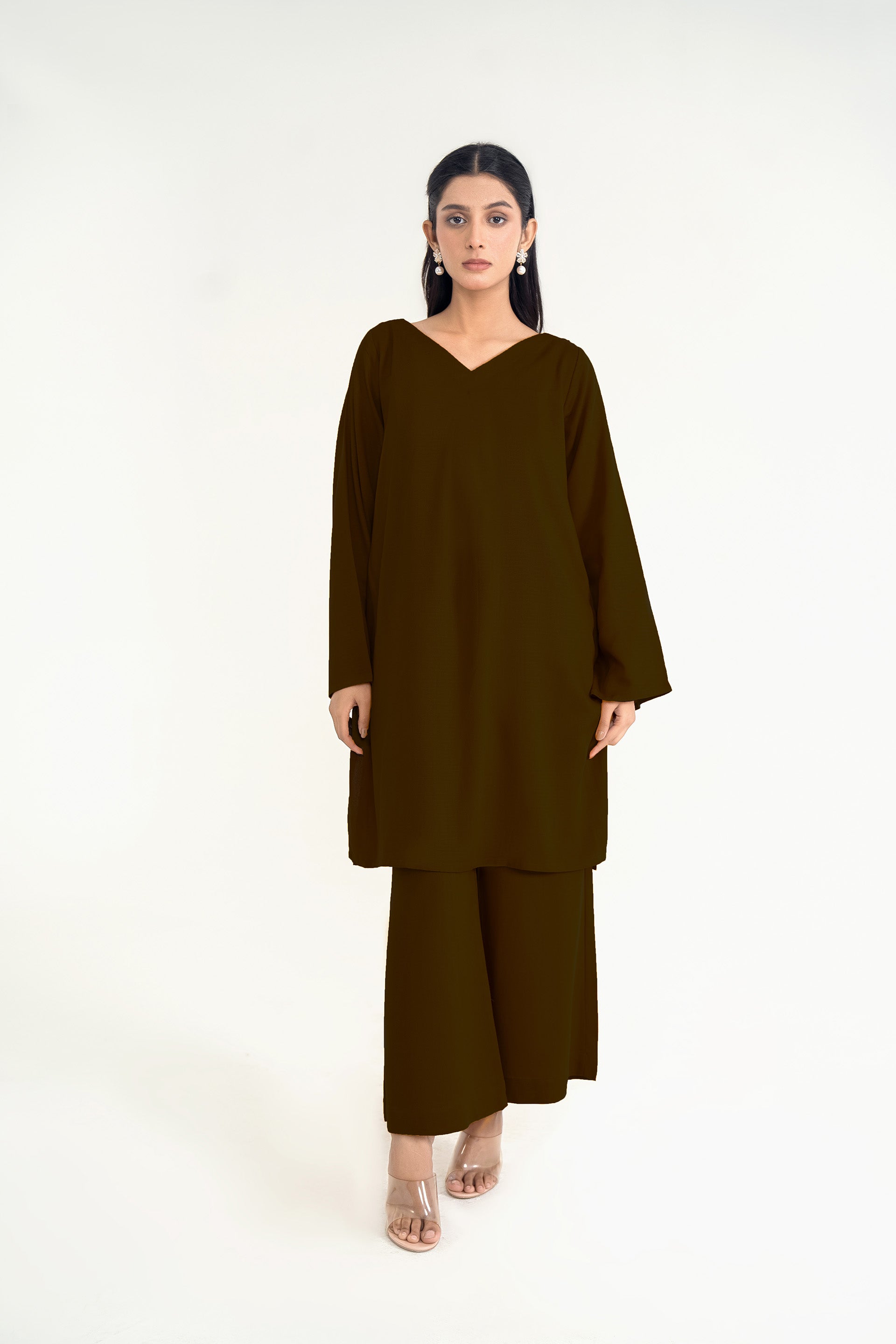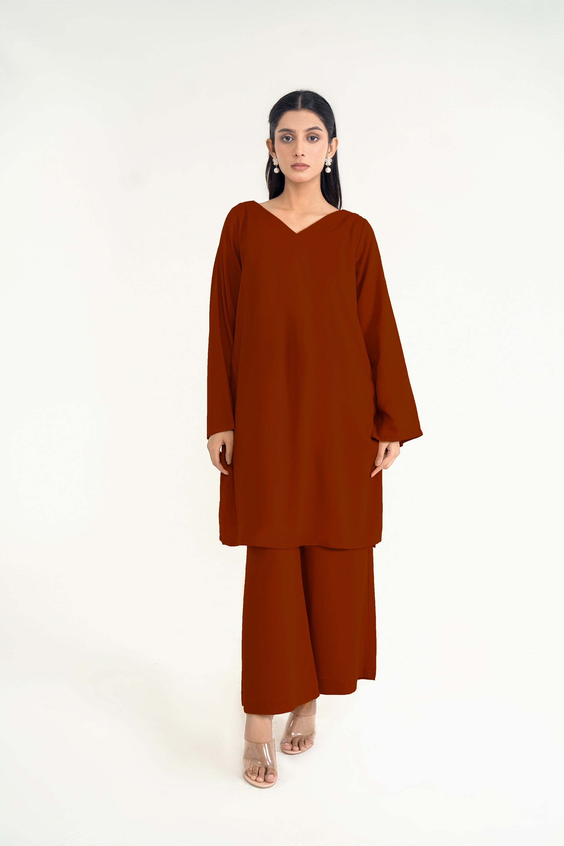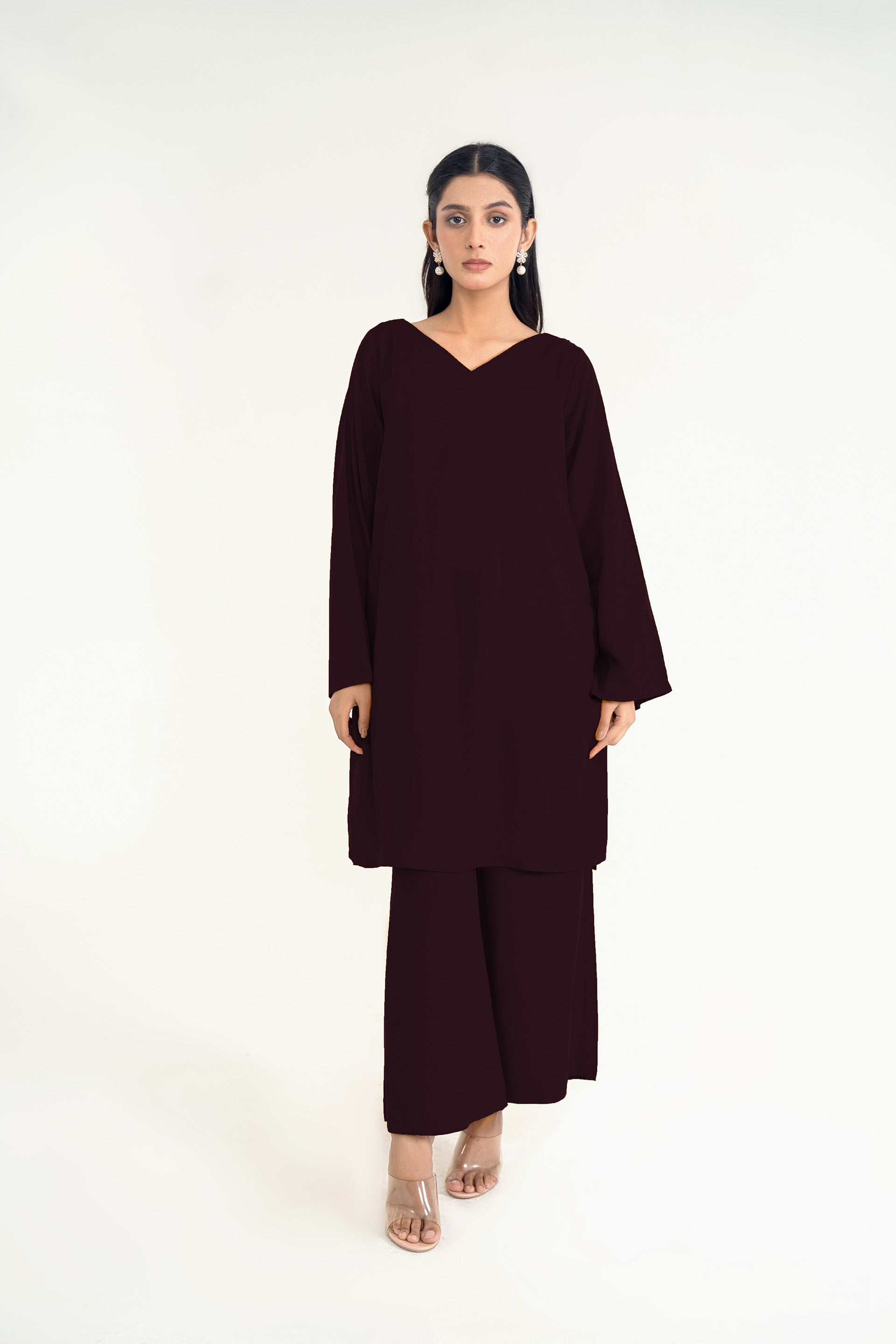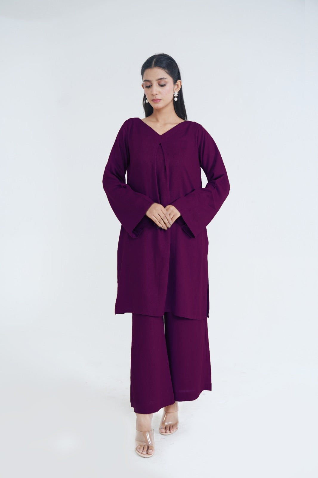 Crafted from premium silk karandi this flowy set ensemble features a chic V-neckline and back box pleat, paired with flared cropped trousers for a refined and versatile mid-season look.